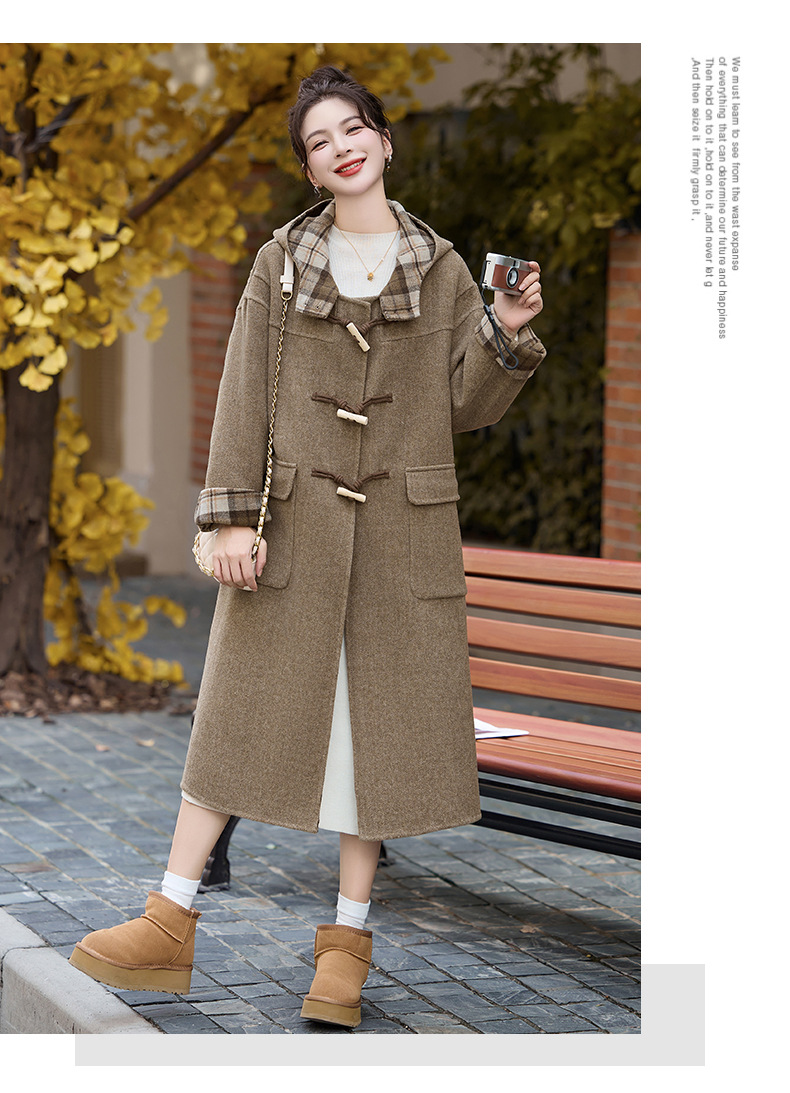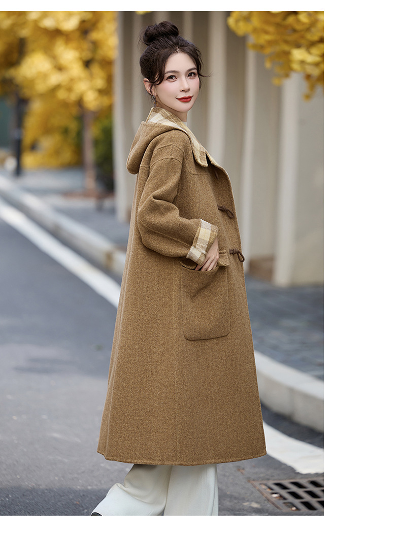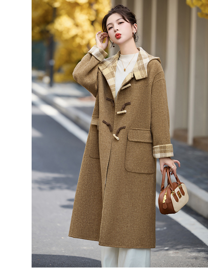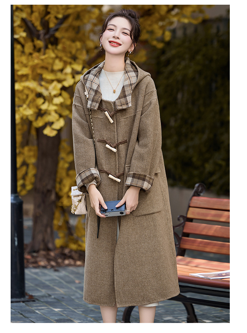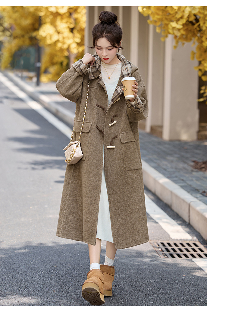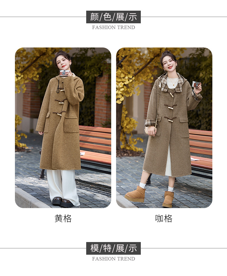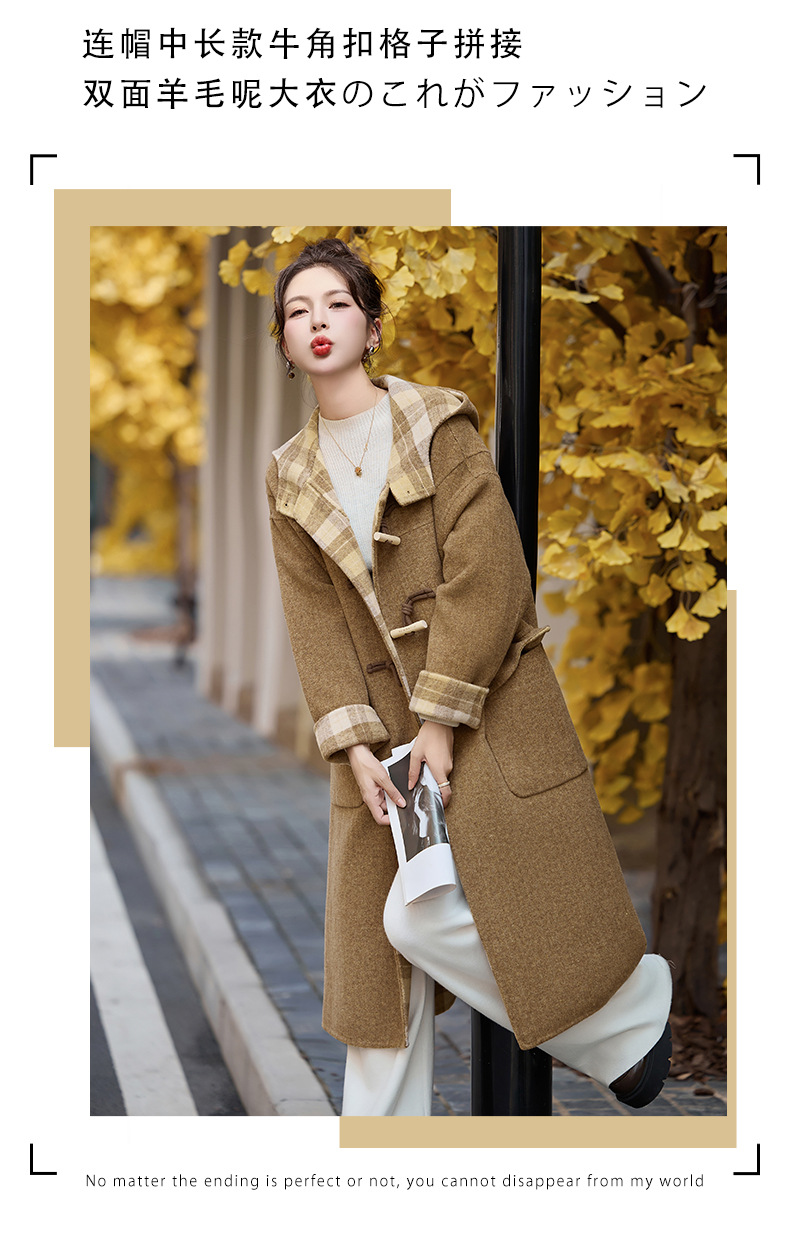 格纹拼接双面呢羊绒大衣女中长款2024秋冬连帽牛角扣减龄毛呢外套