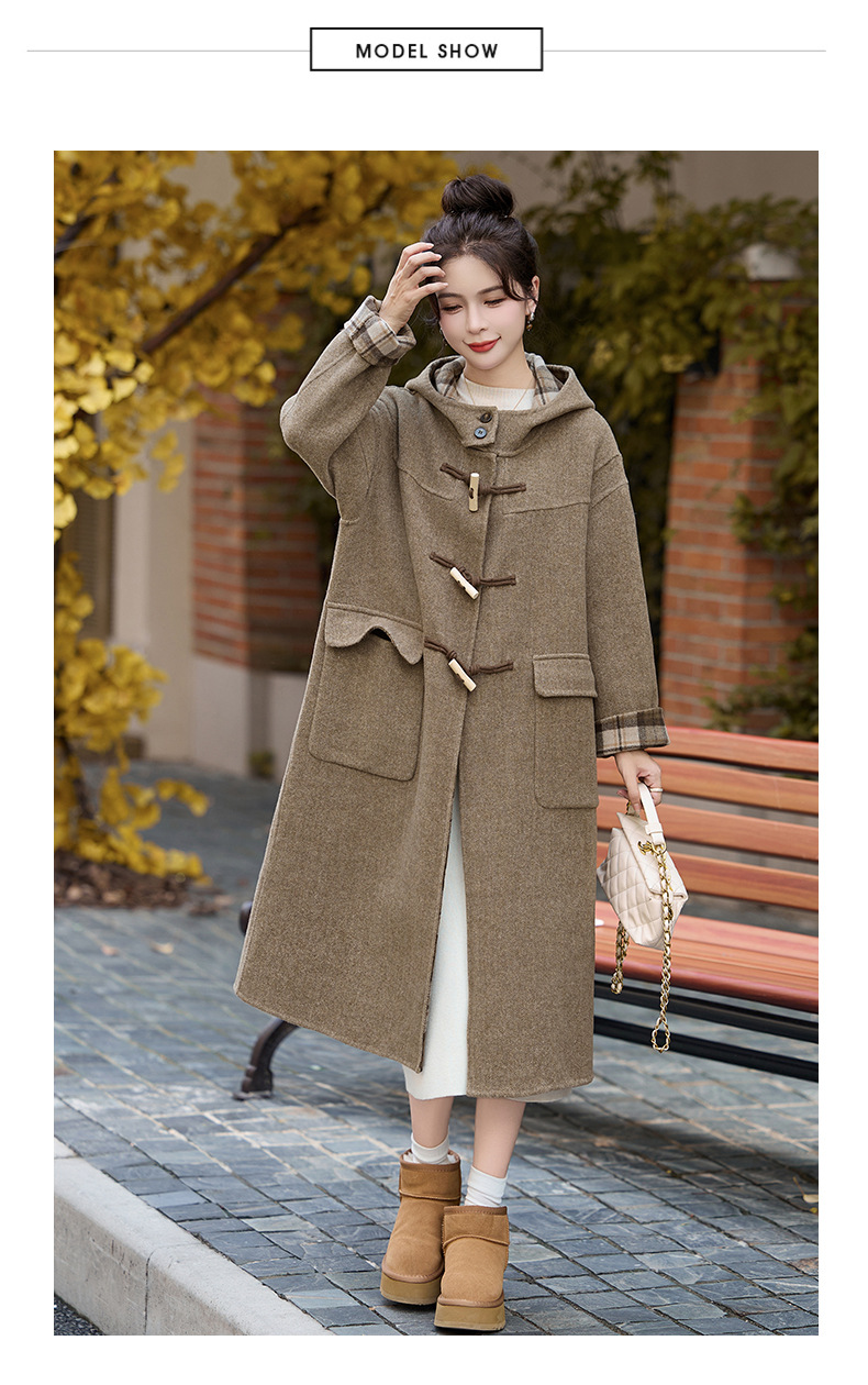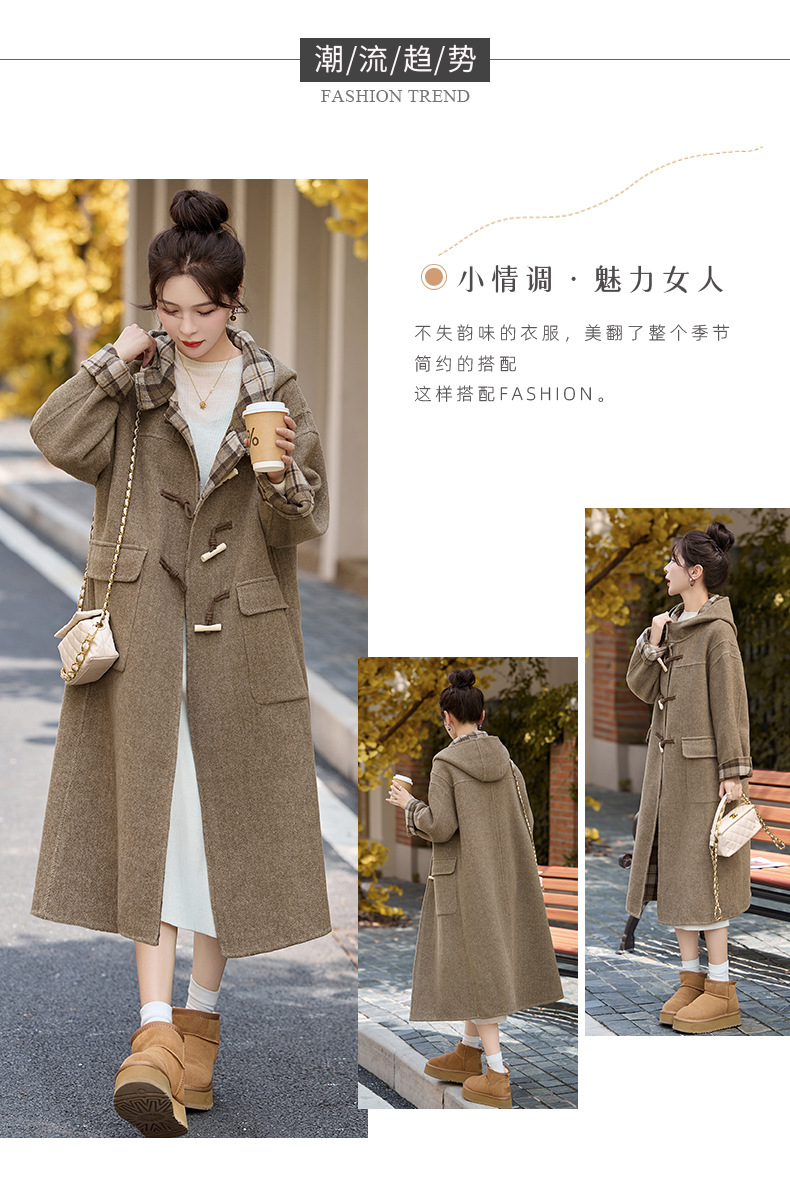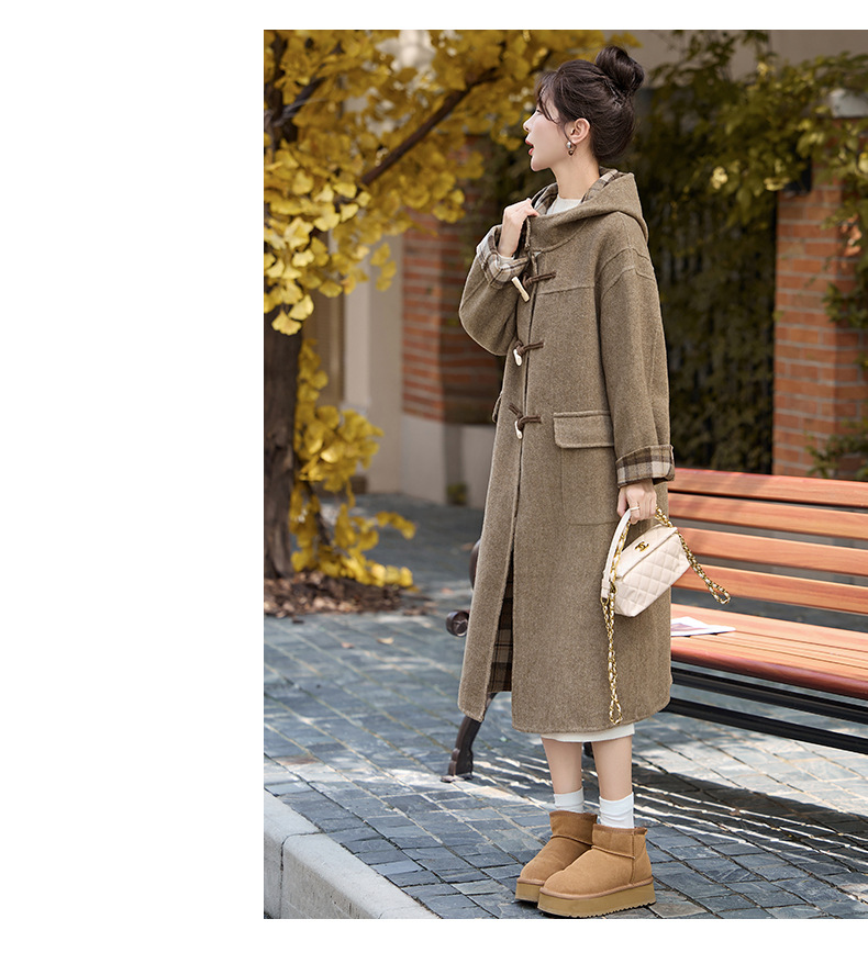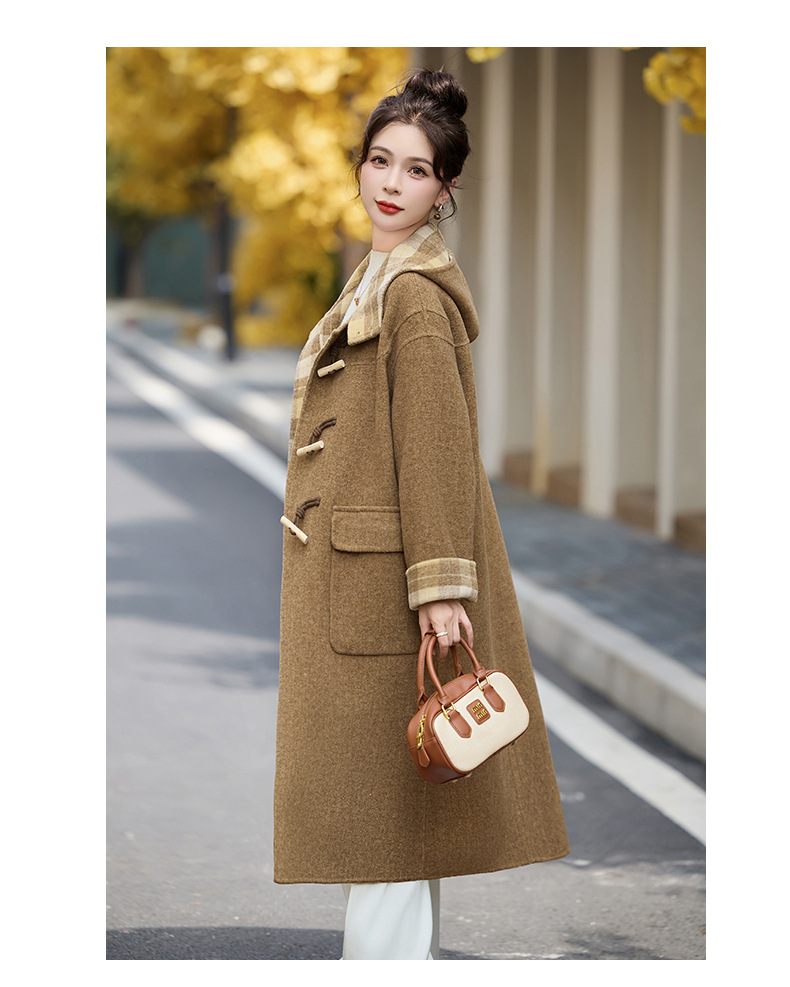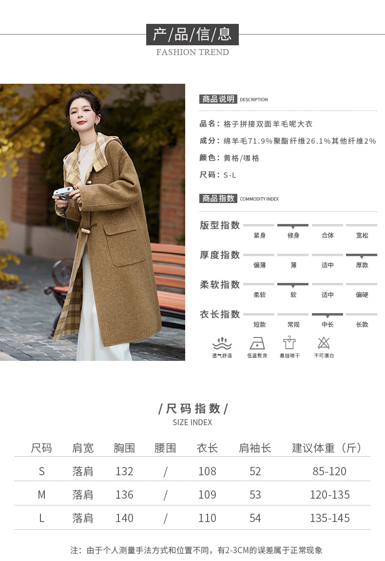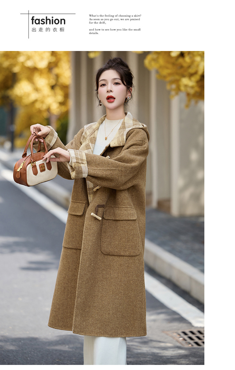 格纹拼接双面呢羊绒大衣女中长款2024秋冬连帽牛角扣减龄毛呢外套