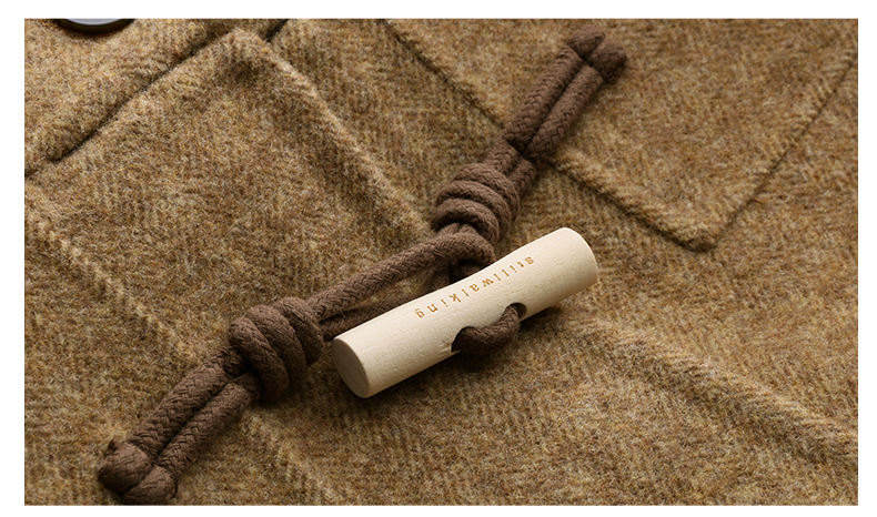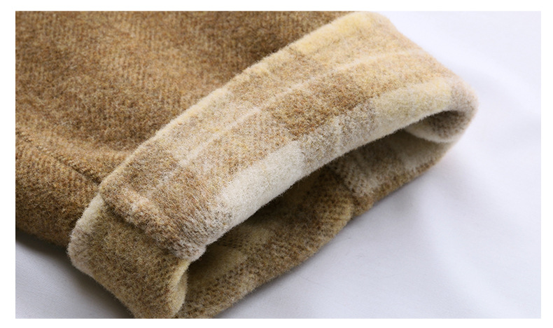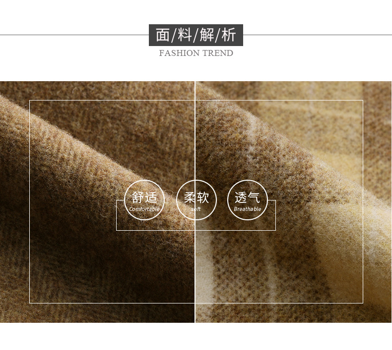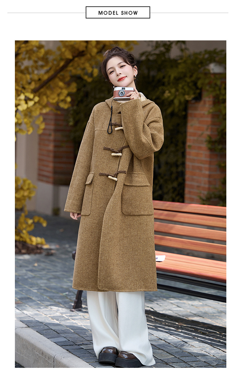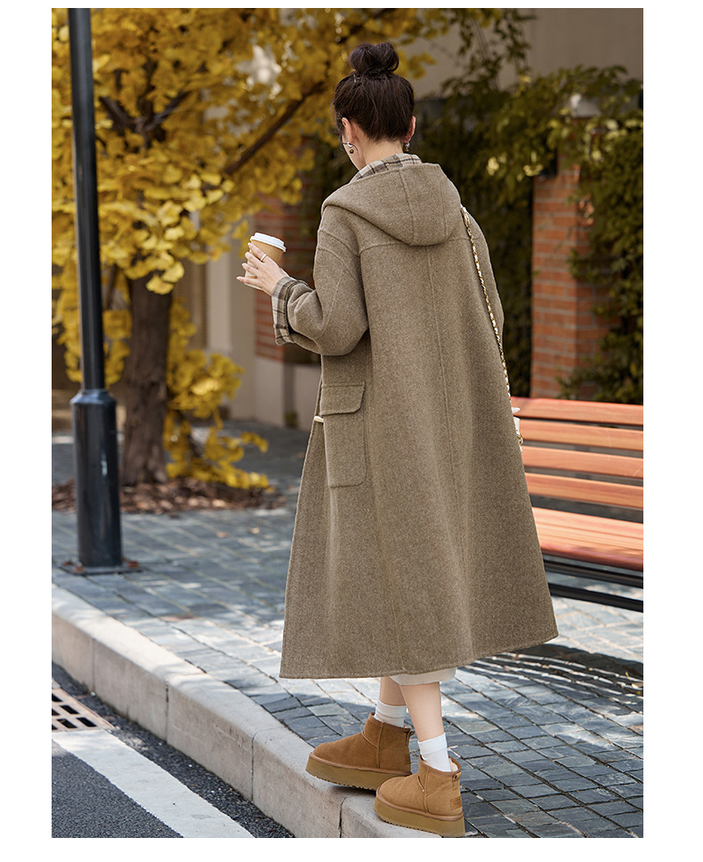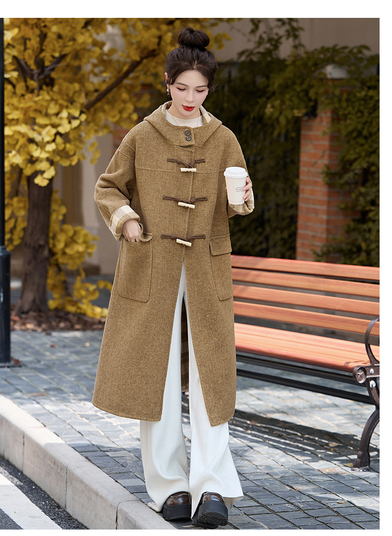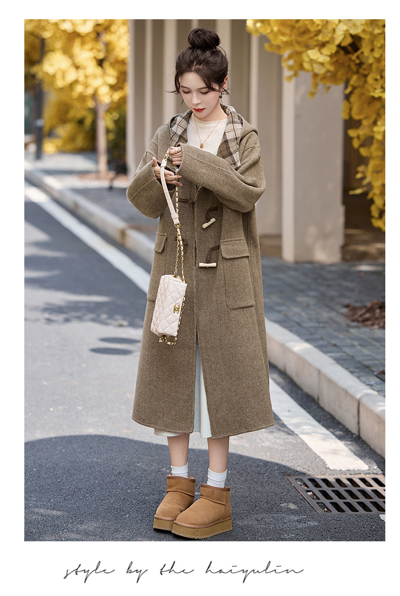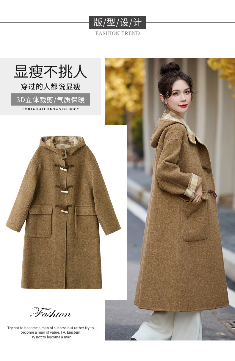 格纹拼接双面呢羊绒大衣女中长款2024秋冬连帽牛角扣减龄毛呢外套