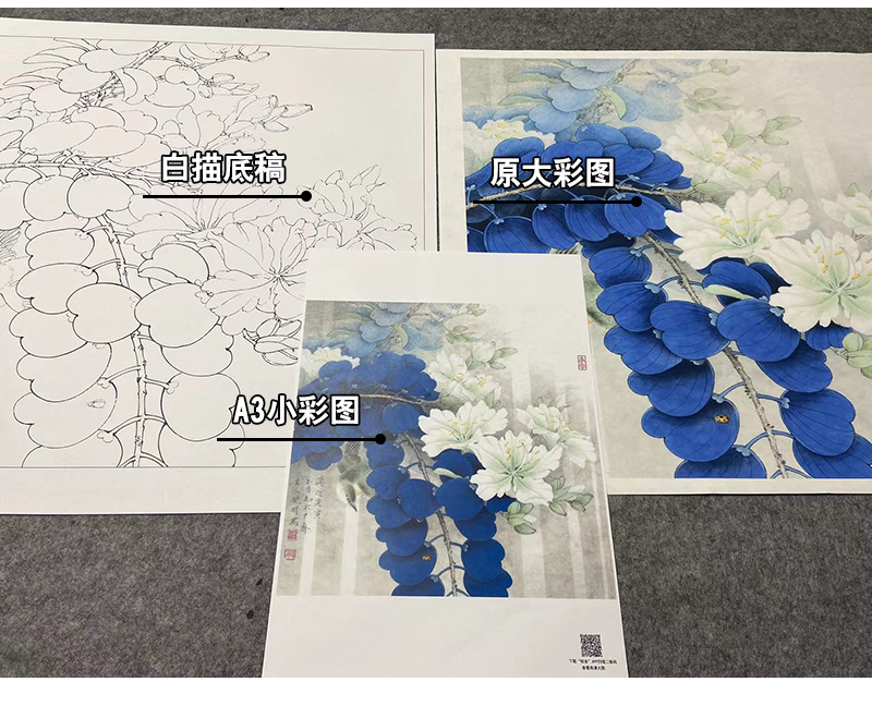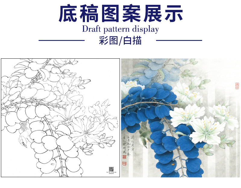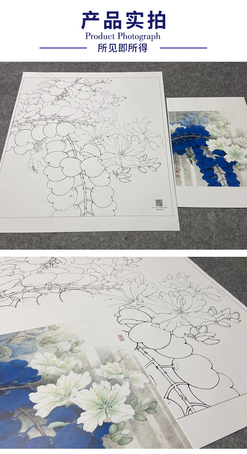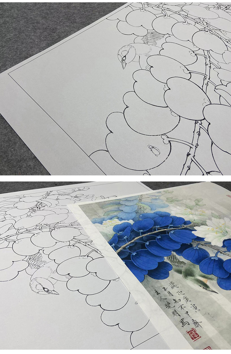 【大彩图】李晓明工笔画白描底稿斗方《绣眼白荆花》临摹勾线花鸟线稿K122