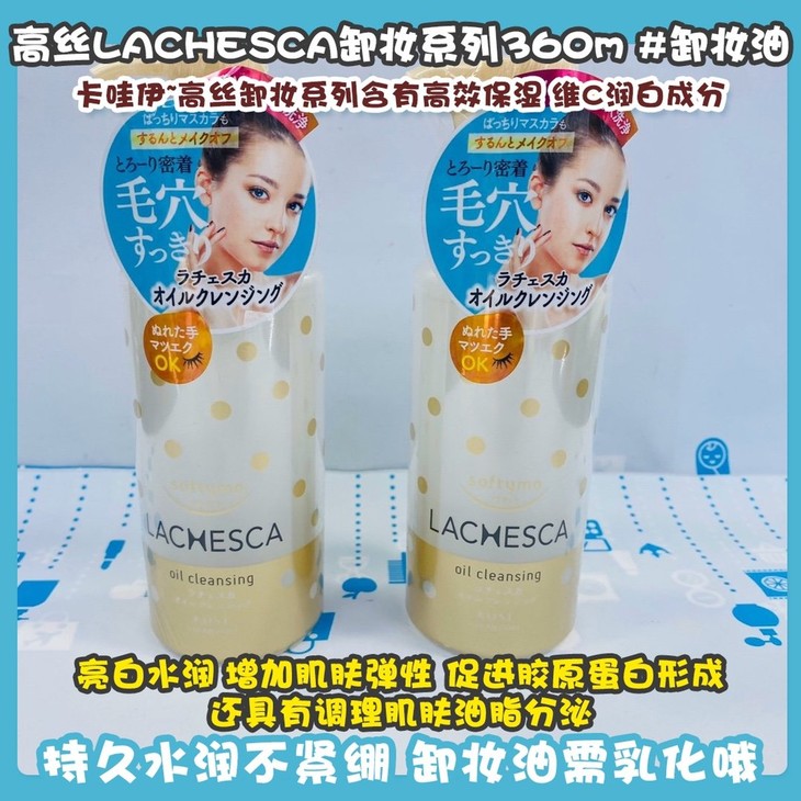 高丝LACHESCA卸妆系列360ml#卸妆水/#卸妆油👍啊这个可爱的外包装直击心脏了👅,卡哇伊~高丝卸妆系列含有高效保湿💦、维C润白成分,亮白水润✨增加肌肤弹性,促进胶原蛋白形成🥚,还具有调理肌肤油脂分泌,针对紧致毛孔具有明显的功效✔。卸妆水温和卸妆去除老废多余角质,有效清洁毛孔♻,持久水润不紧绷。卸妆油需乳化哦‼‼