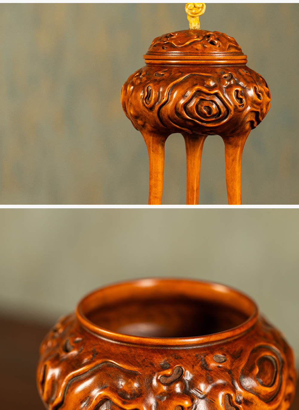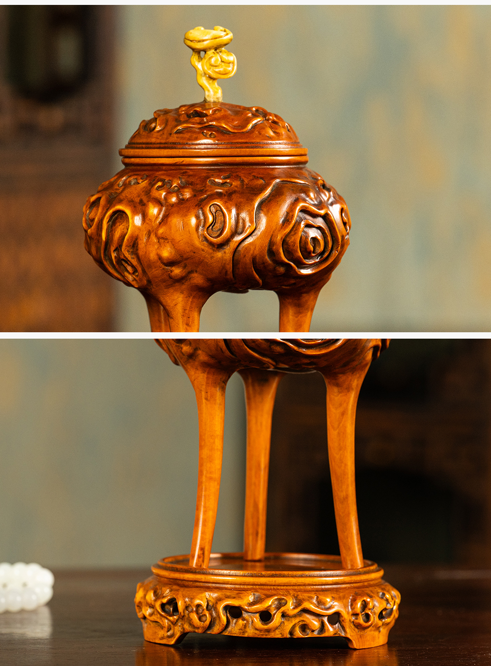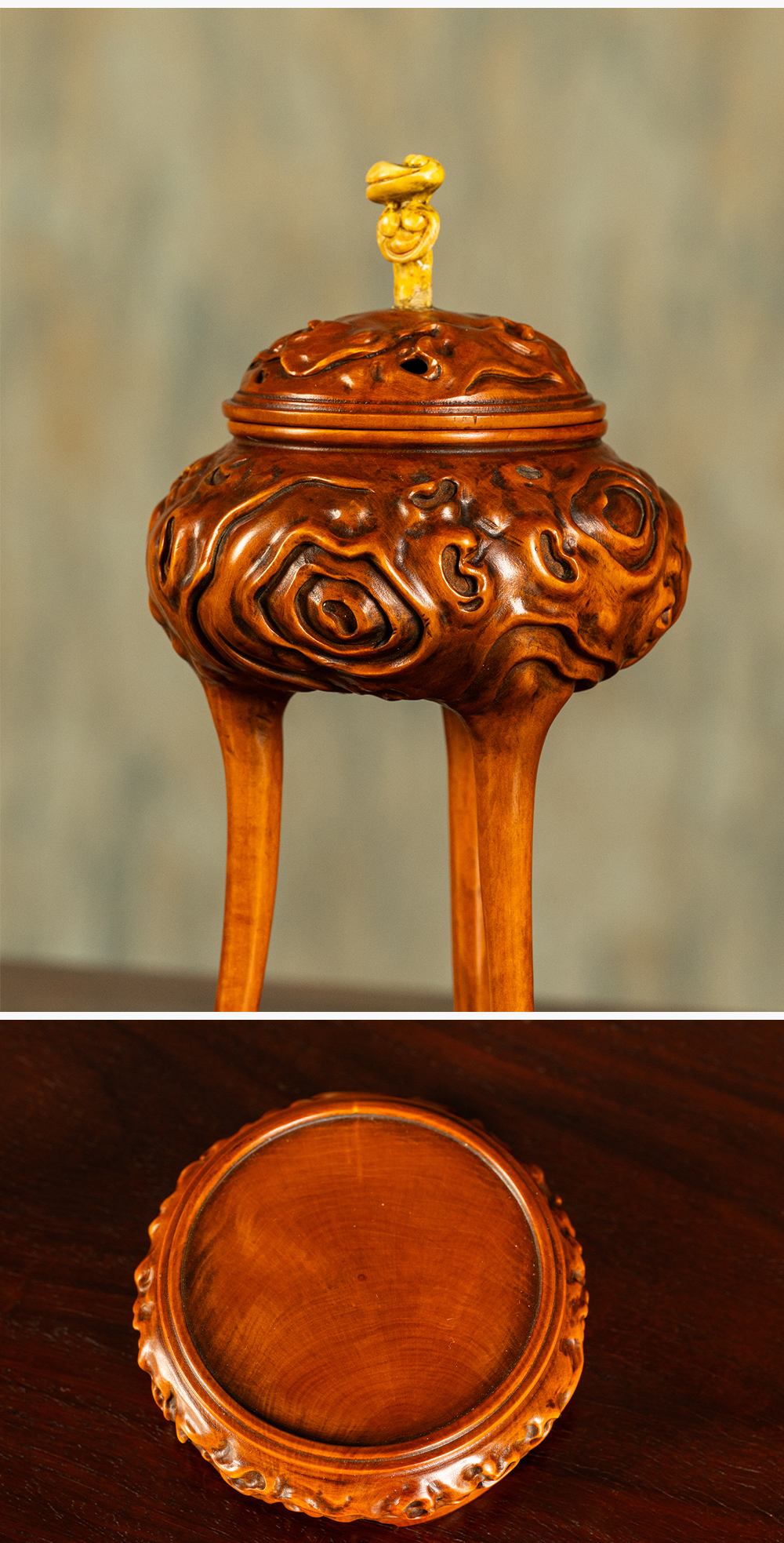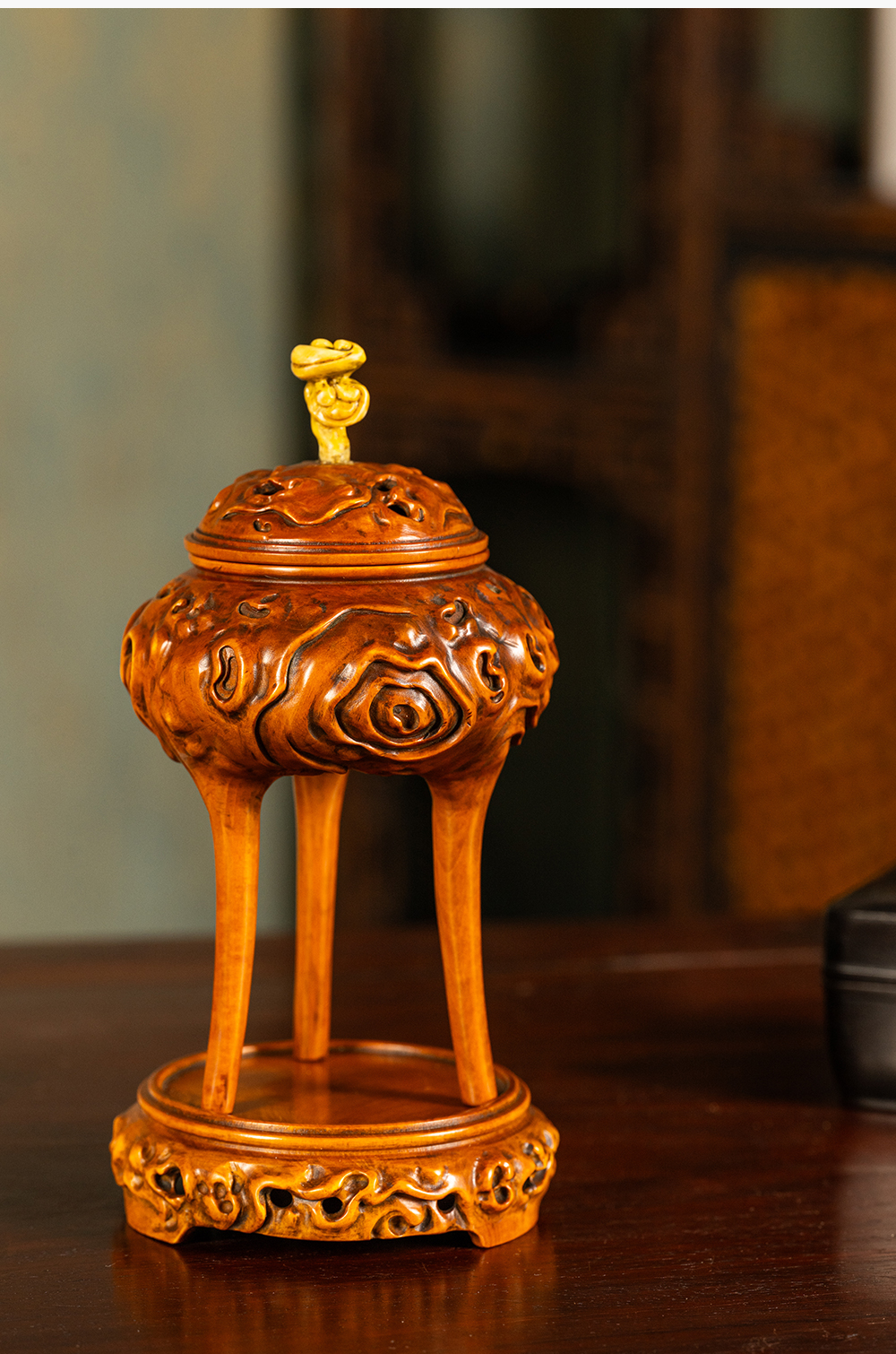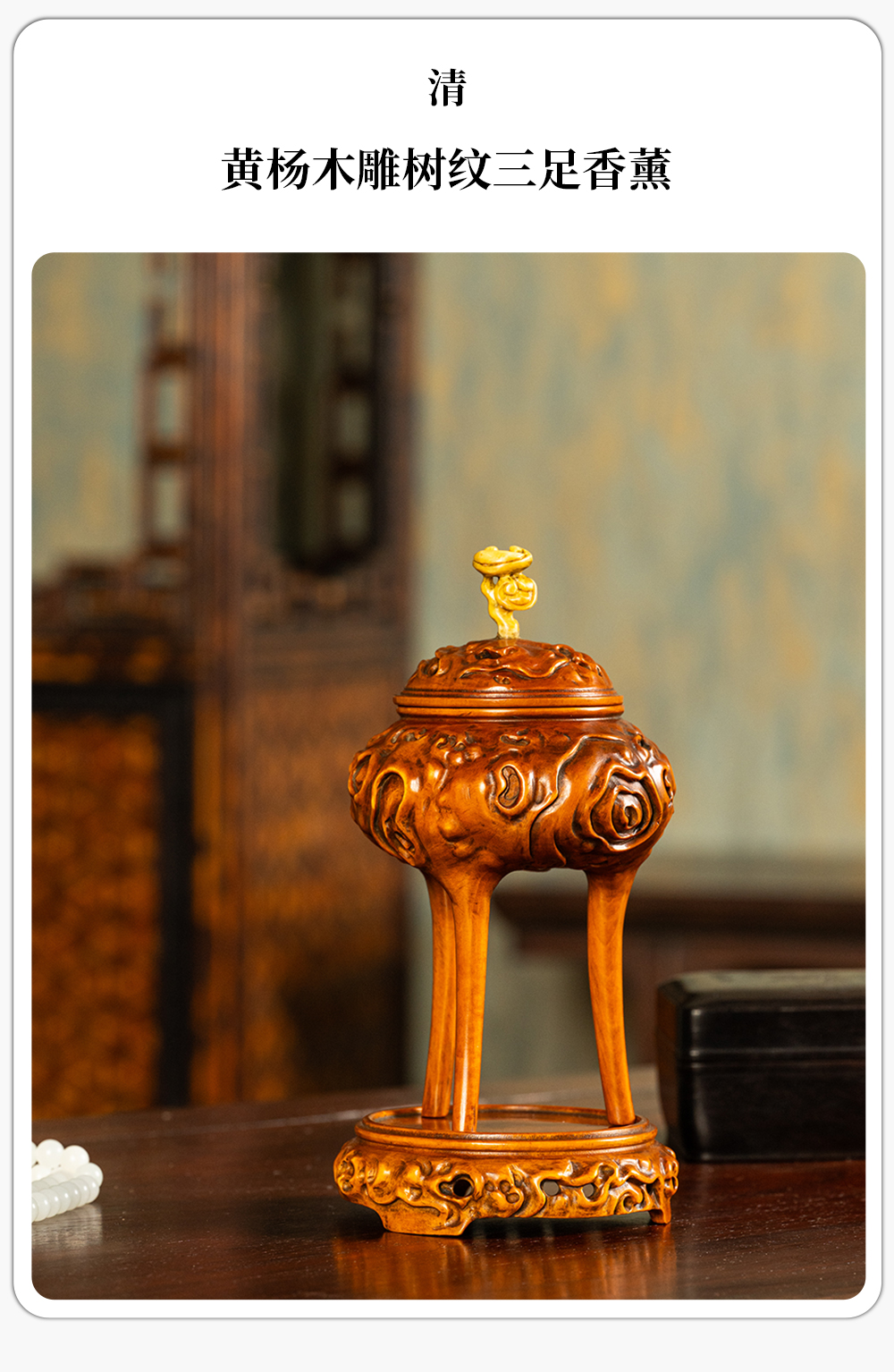 清 黄杨木雕树纹三足香薰