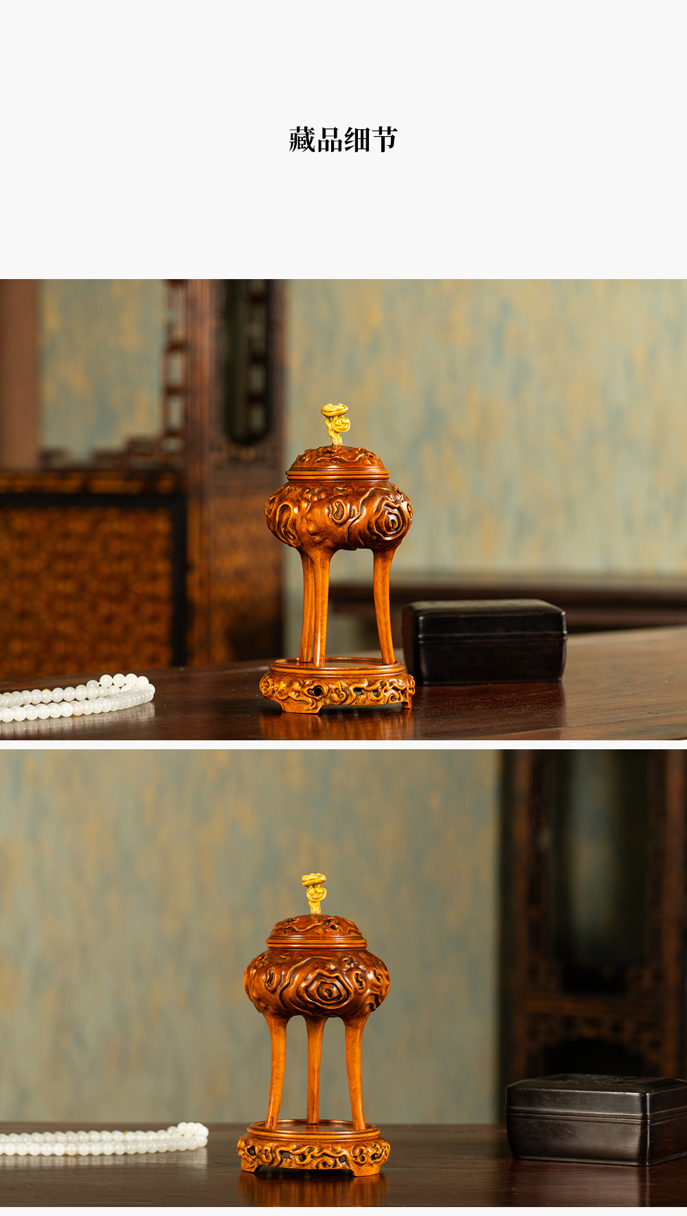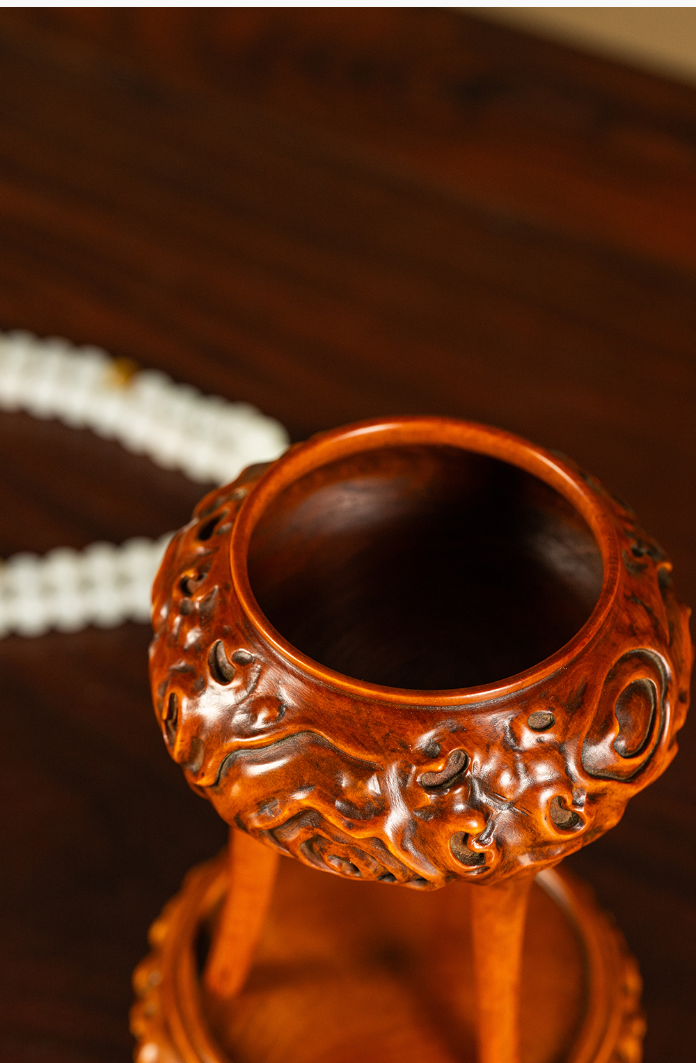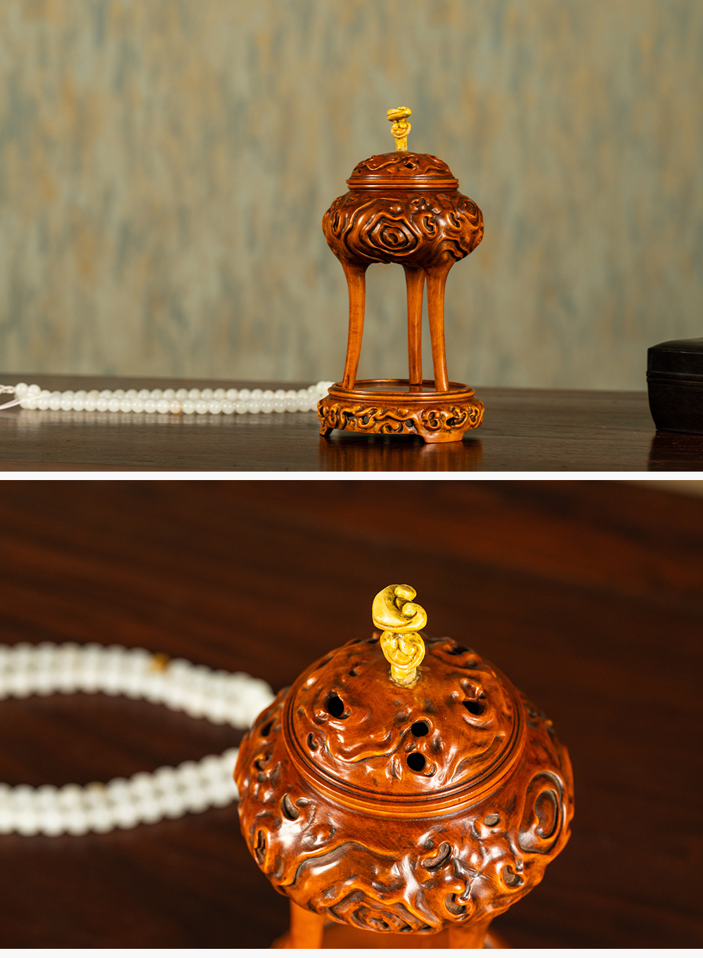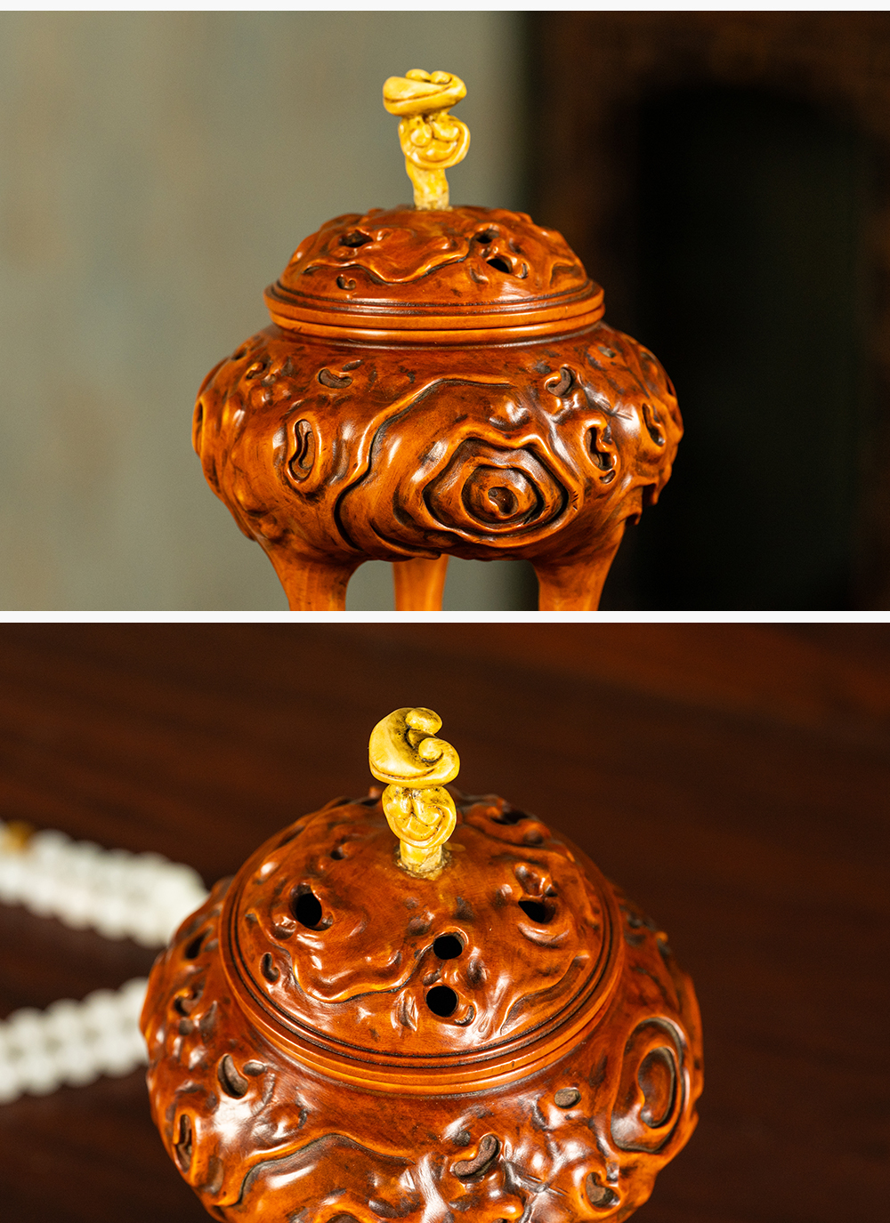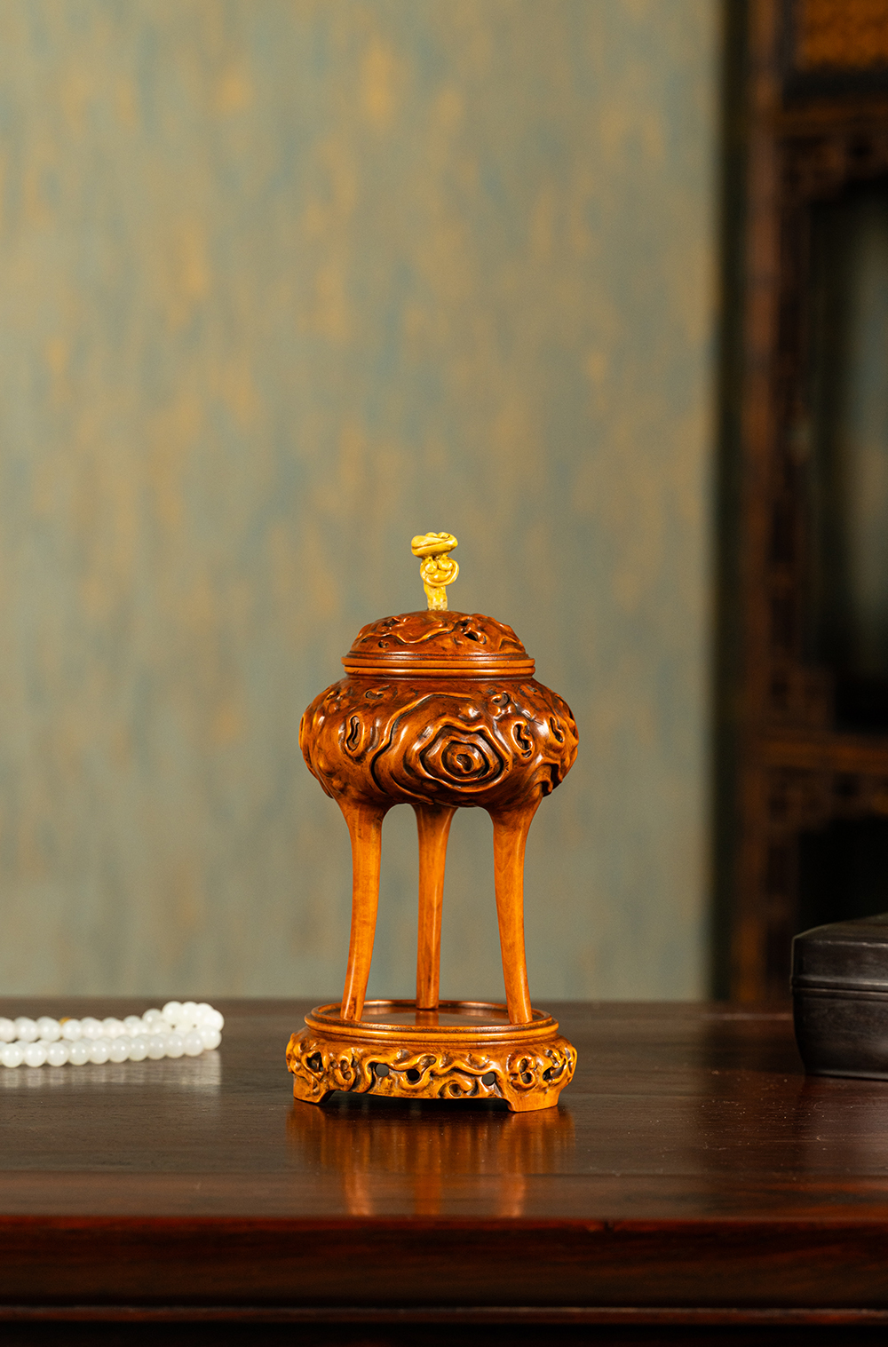 清 黄杨木雕树纹三足香薰