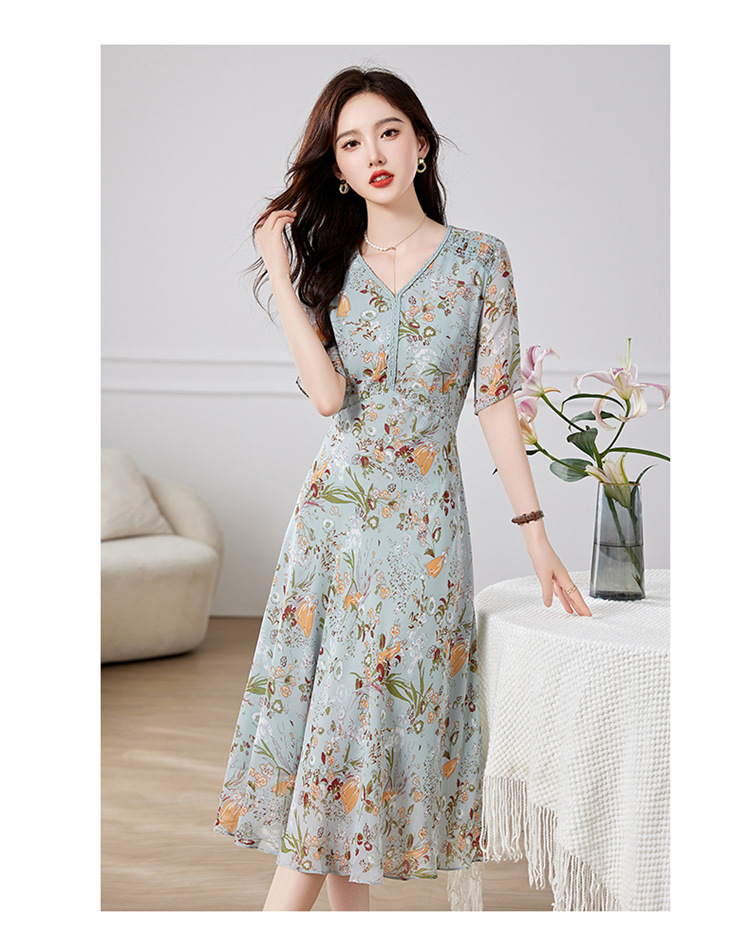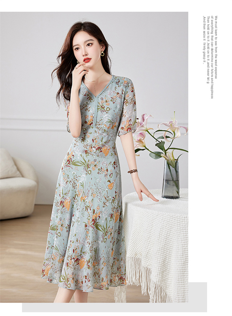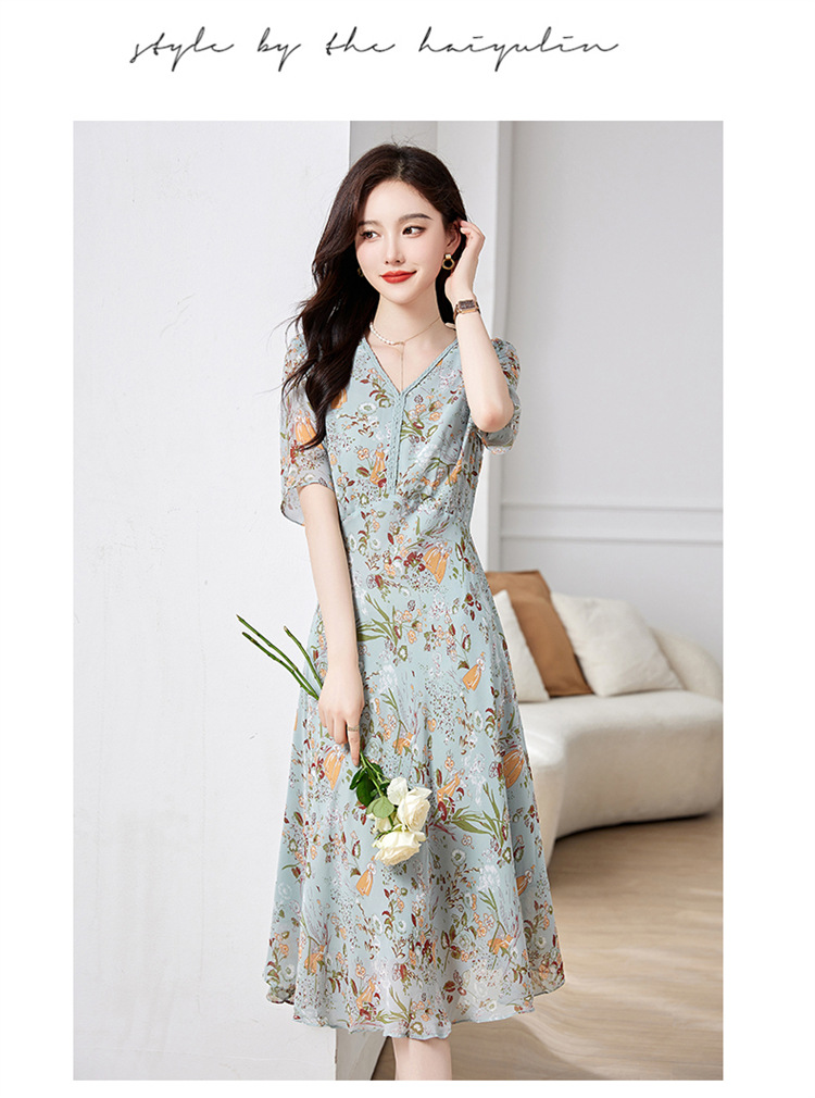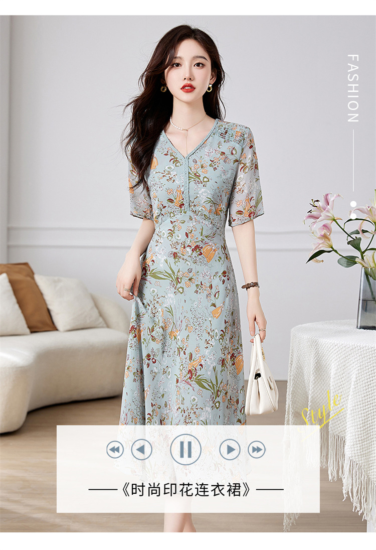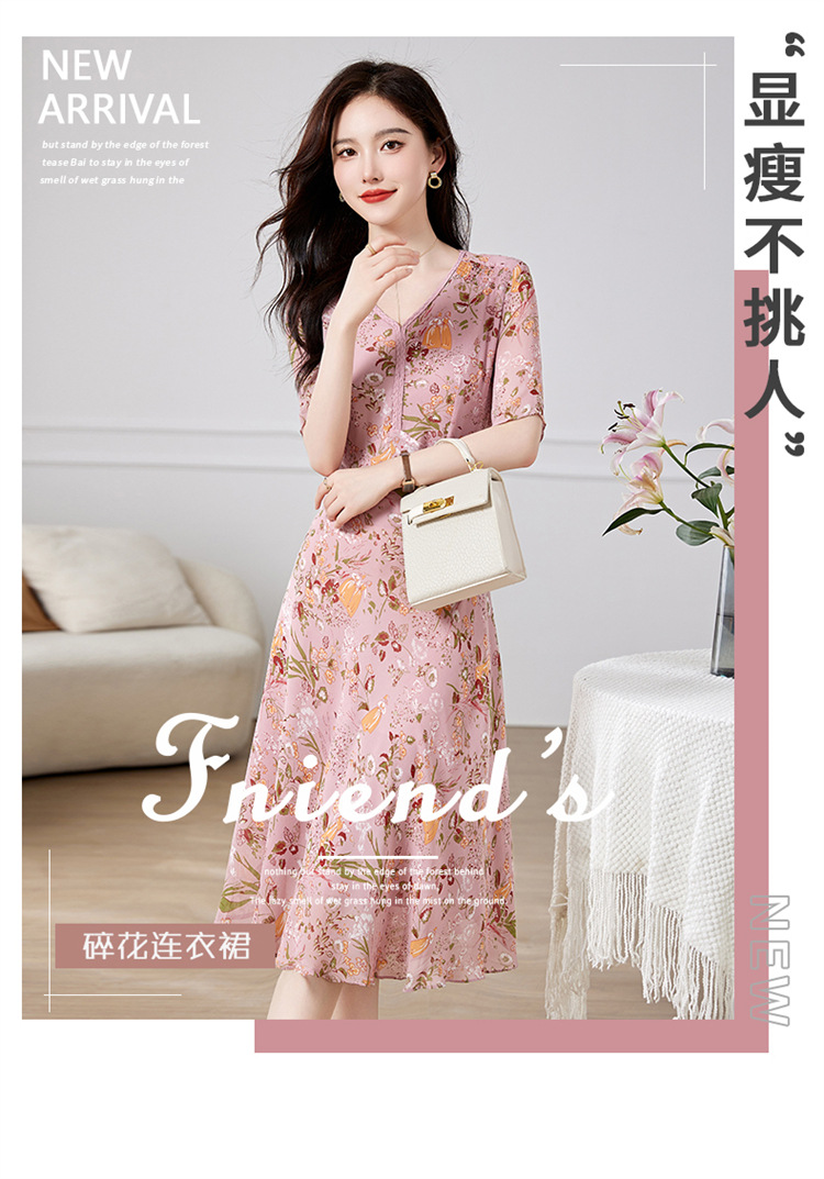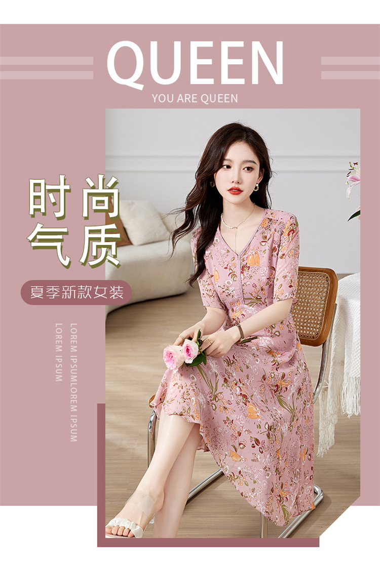 修身显瘦,时尚v领月印花简洁干练气质碎花连衣裙HR-WZ25219