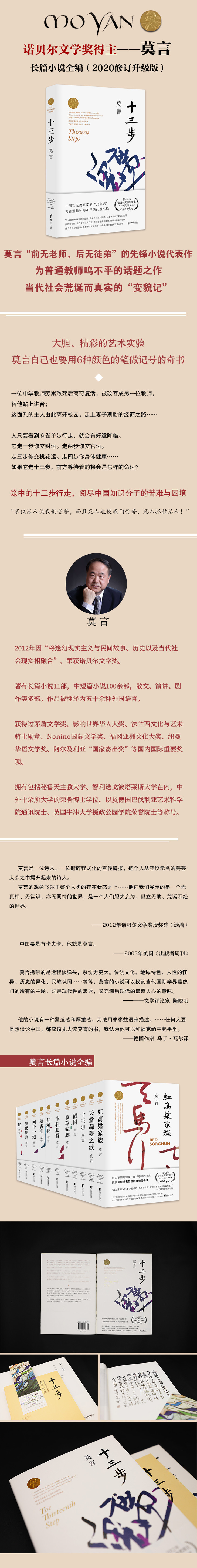 一位法国读者曾对莫言说,她用了五种颜色的笔做着记号,才读懂了这本书。莫言自己则说:“如果让我重读《十三步》,需要用六种颜色的笔做记号。”