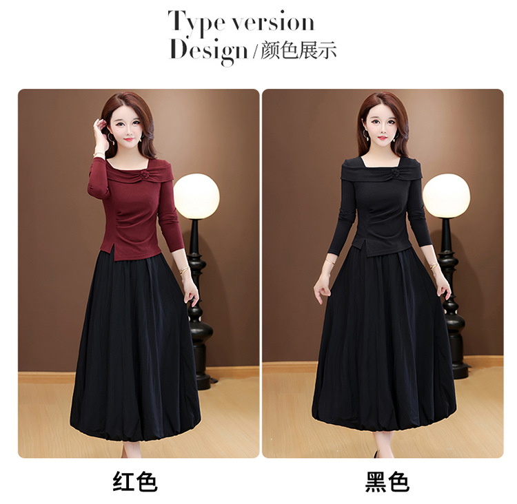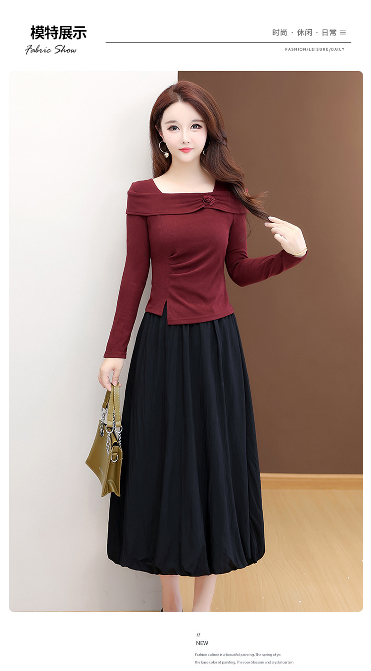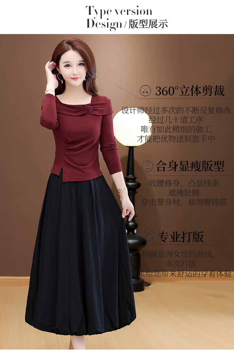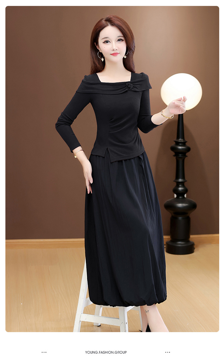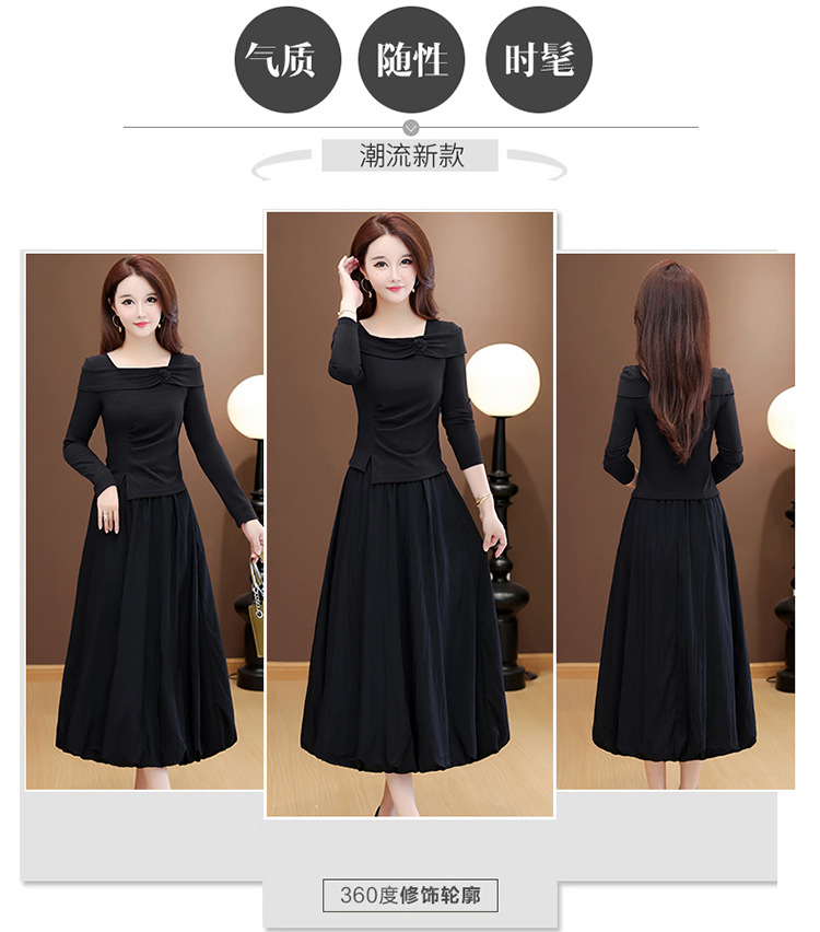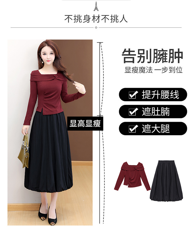 QYM 53B255-Y两件套连衣裙开衩短款小衫+高腰中长款花苞半身裙