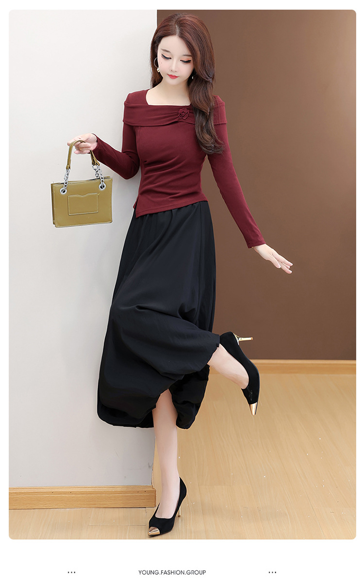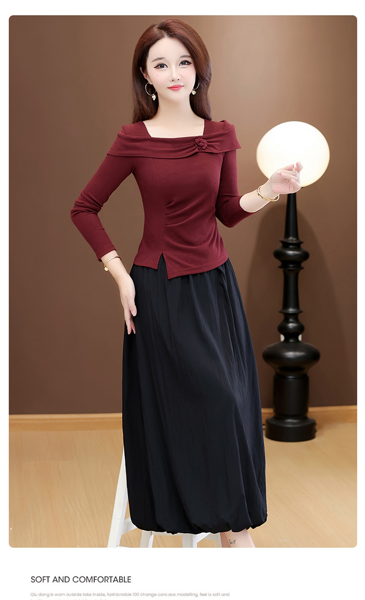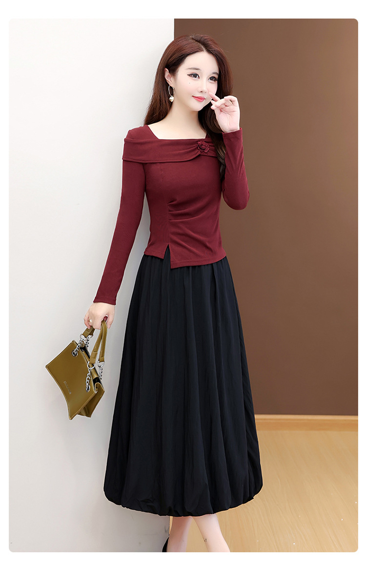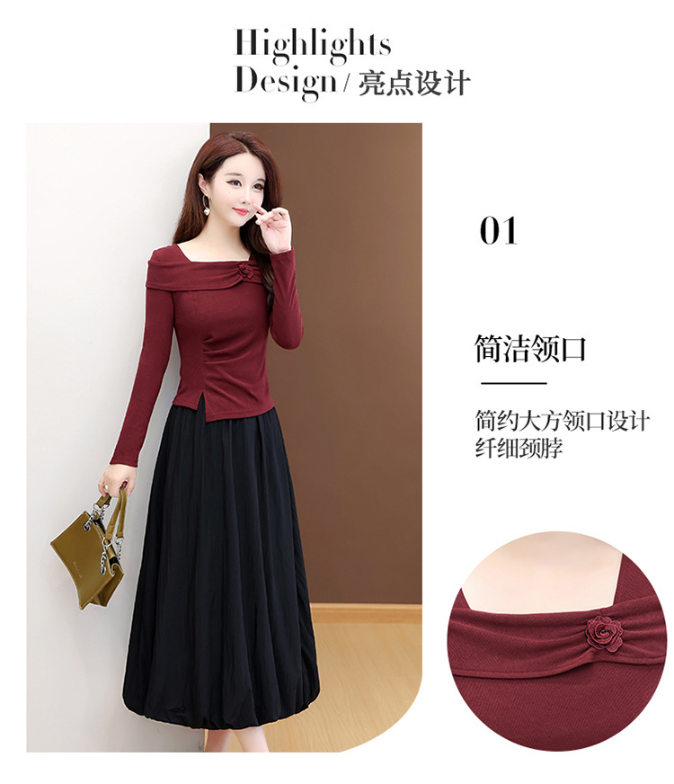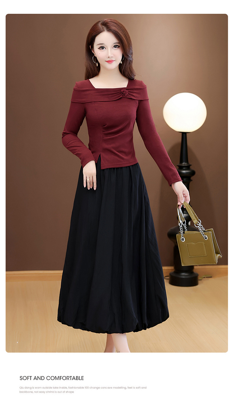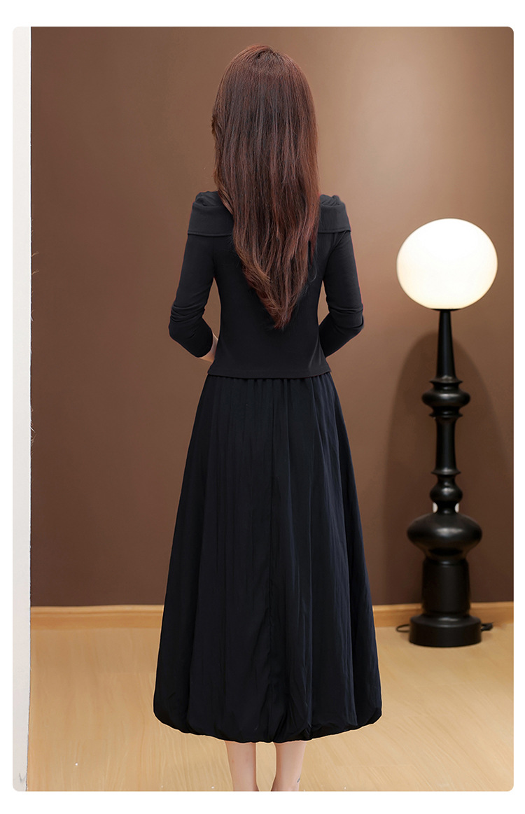 QYM 53B255-Y两件套连衣裙开衩短款小衫+高腰中长款花苞半身裙