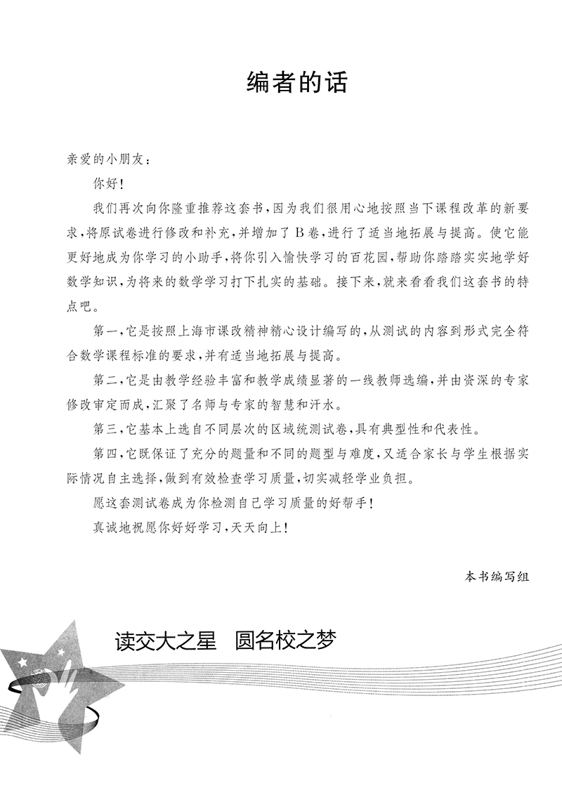 本书与上海市二期课改教材配套,按照当下课程改革的新要求,将原试卷进行修改和补充。本书含专题点拨、期中期末满分冲刺卷,期中期末满分冲刺卷基本选自不同层次的区域测试卷,具有典型性和代表性,分A、B卷,A卷侧重于基础知识,B卷综合性的解决一些问题,难度大于A卷。本书在切实减轻学生过重负担的前提下,保证一定的练习量,使学生能从不同角度、不同形式进行训练,开拓思路,发展思维。