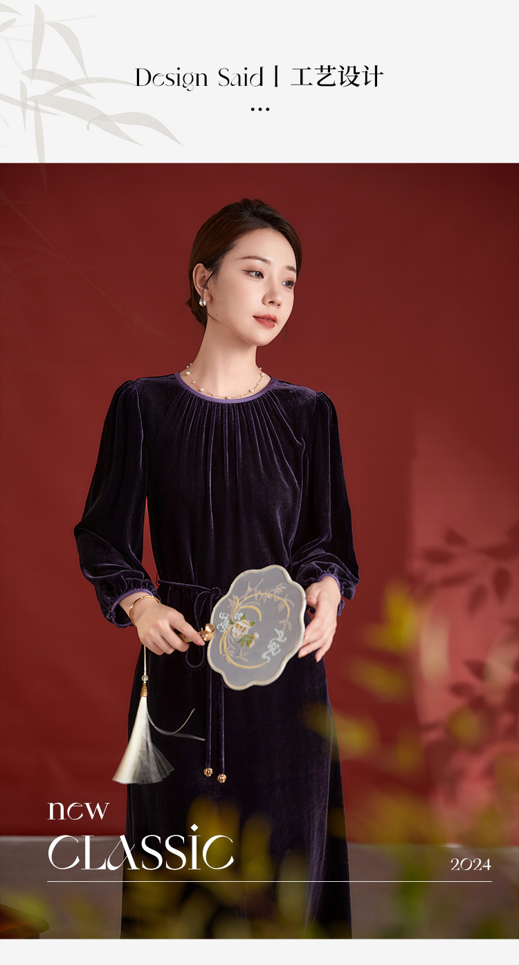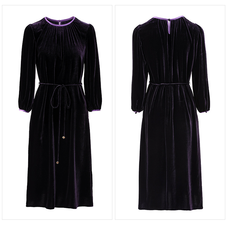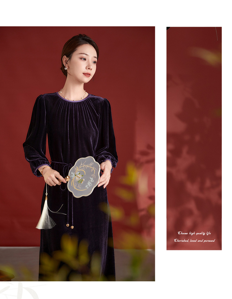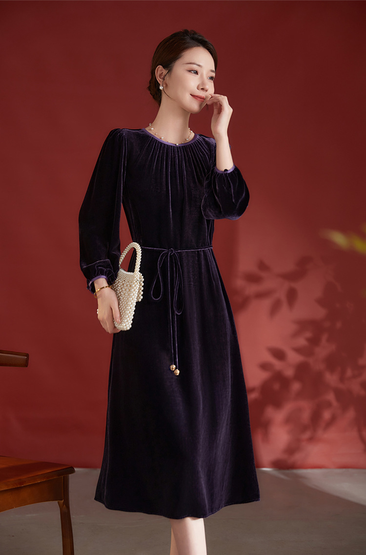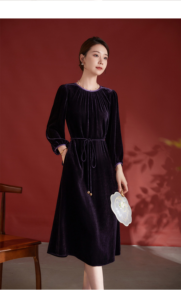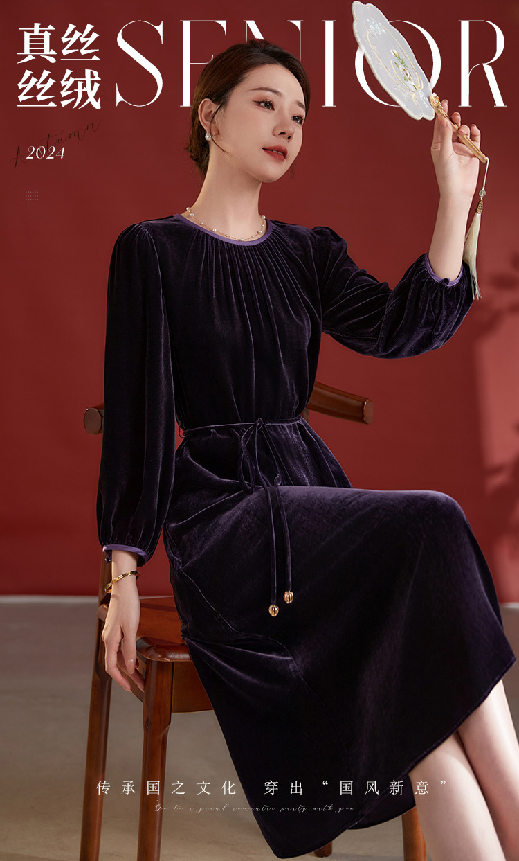 墨黛紫高级感长袖,桑蚕丝丝绒连衣裙SM-82497980