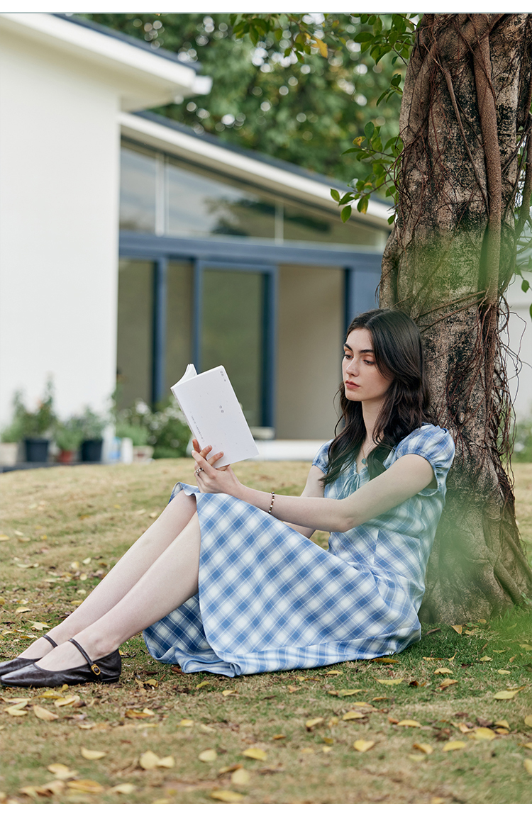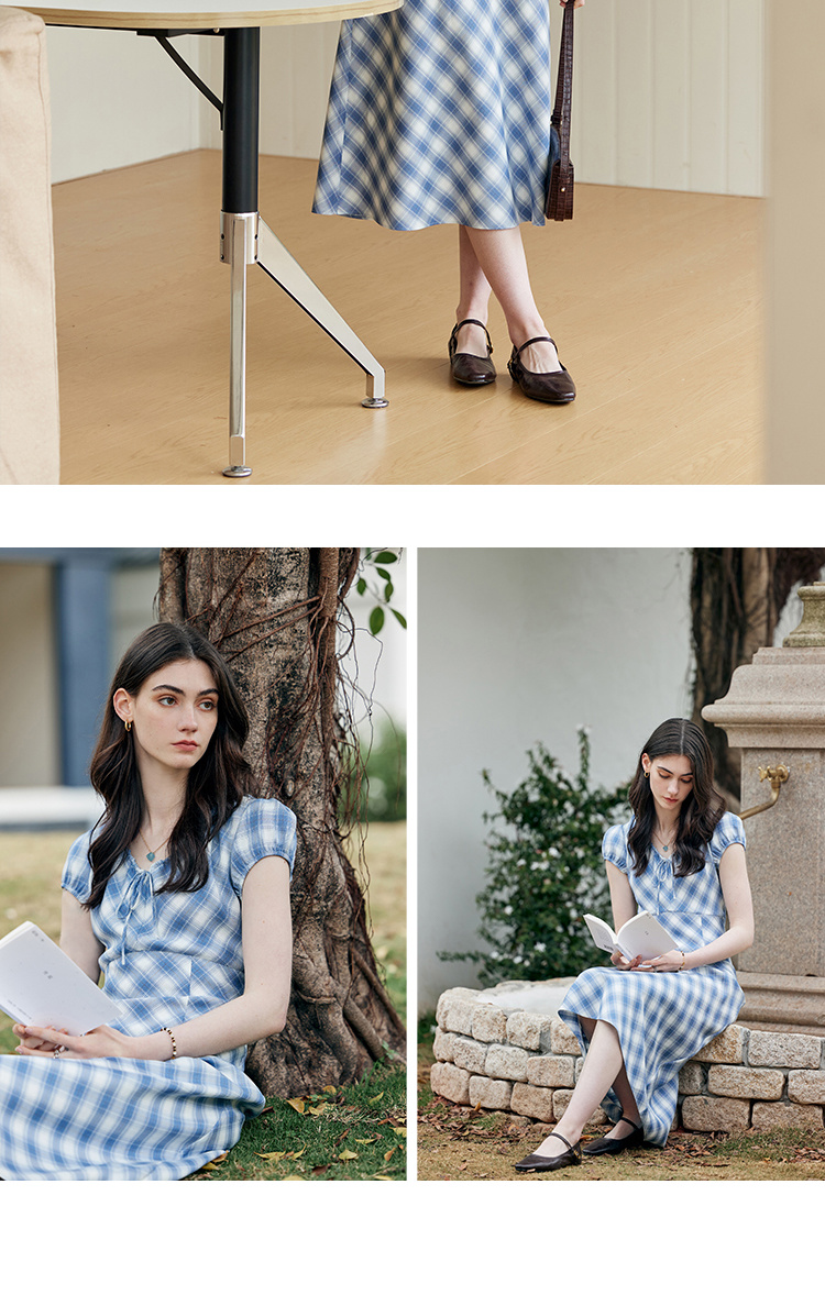 HeyDress格纹连衣裙女夏季法式V领系带收腰设计垂感田园气质裙子