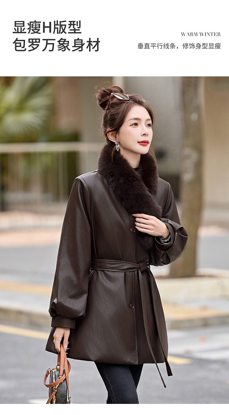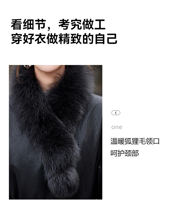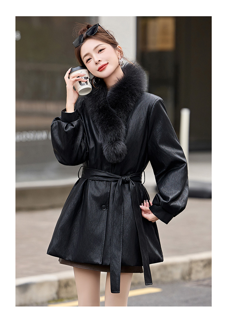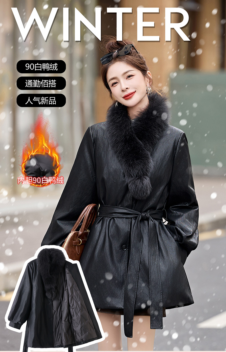 黑色中长款狐狸毛领皮衣,收腰系带气质厚外套羽绒服HR-LNS9789