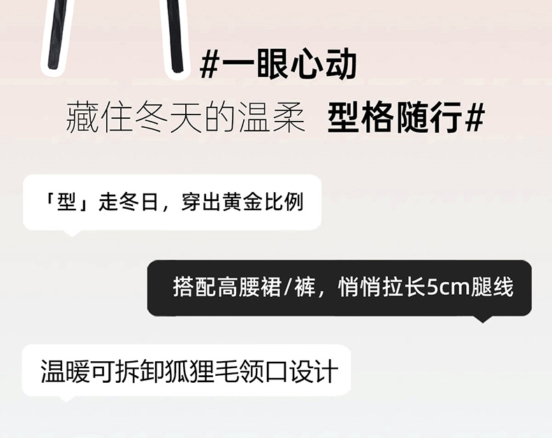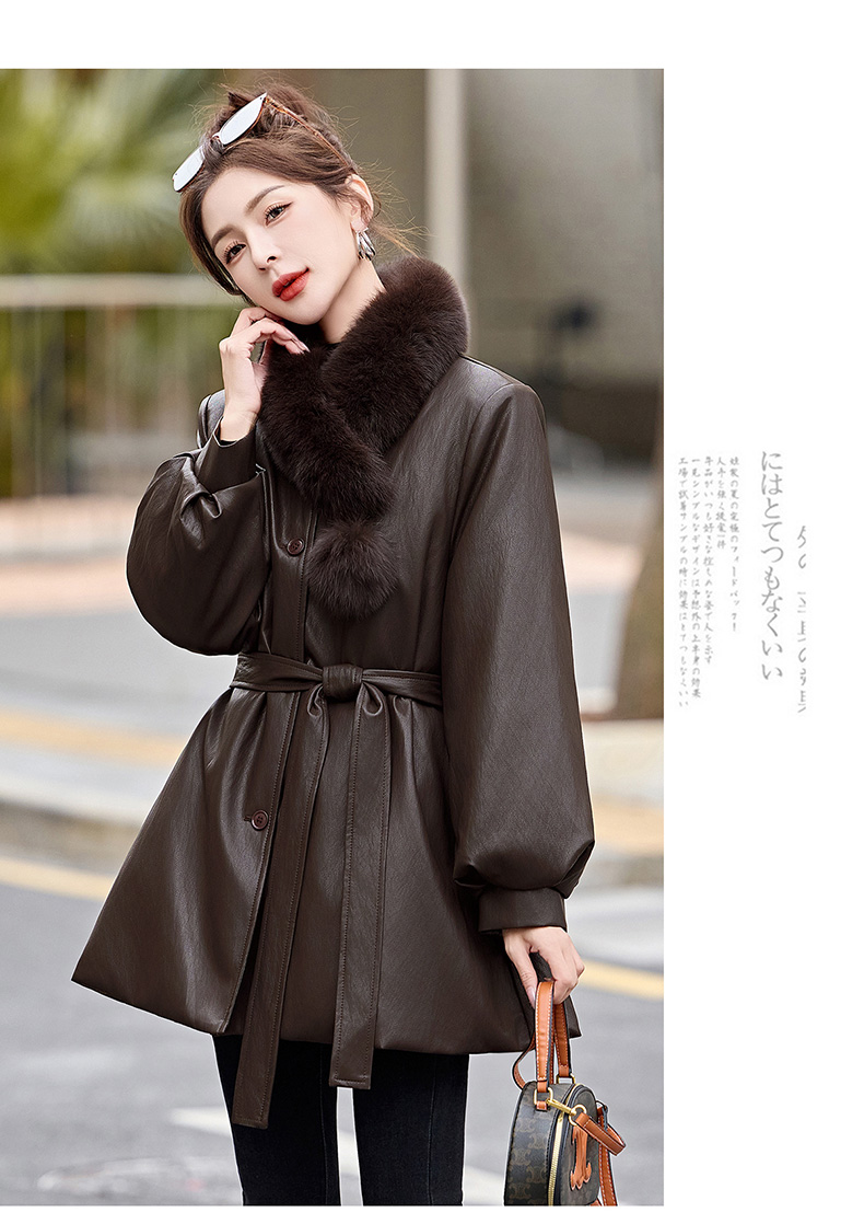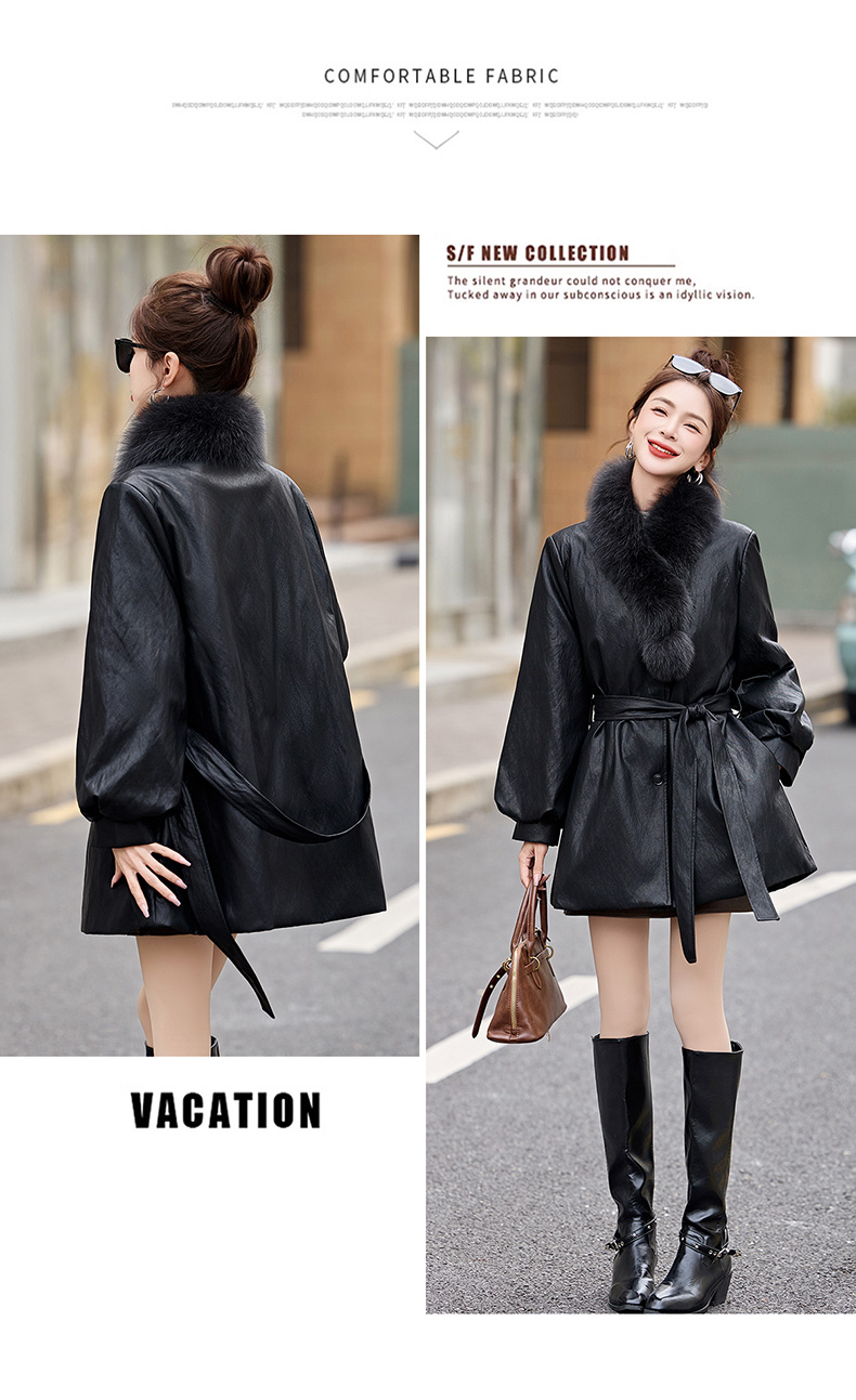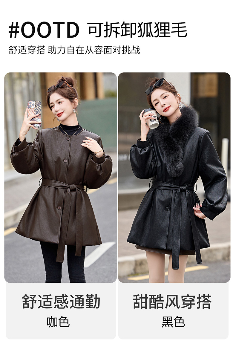 黑色中长款狐狸毛领皮衣,收腰系带气质厚外套羽绒服HR-LNS9789