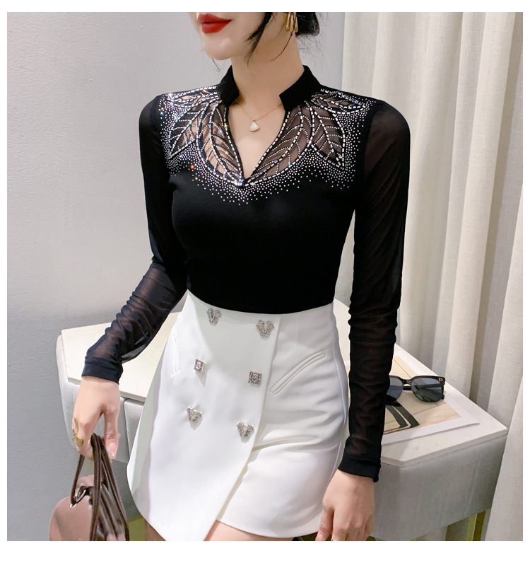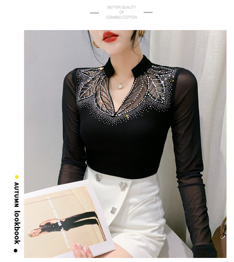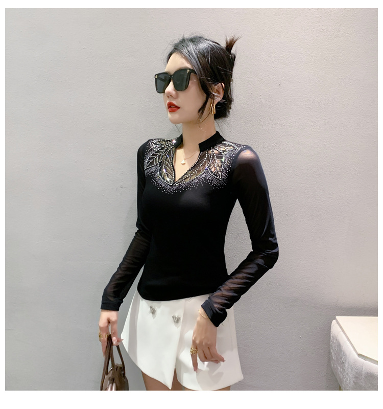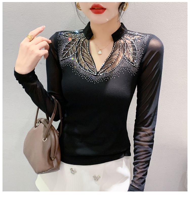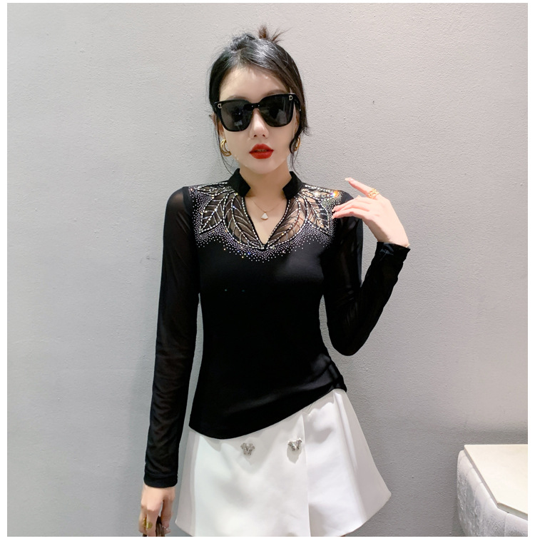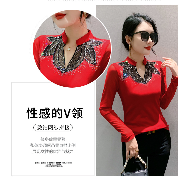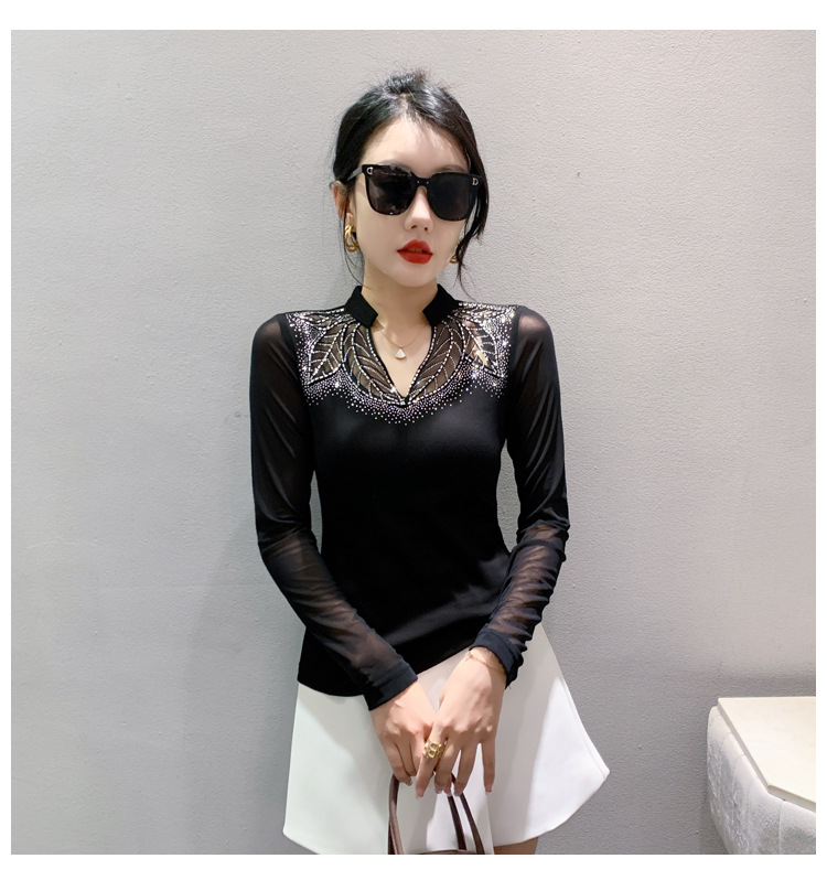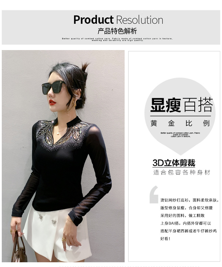 网纱拼接打底衫女秋冬欧货洋气重工烫钻上衣性感V领长袖T恤小衫潮