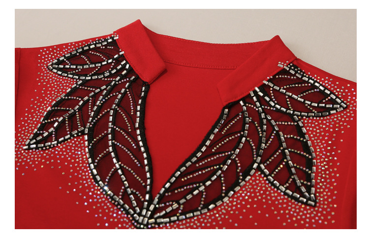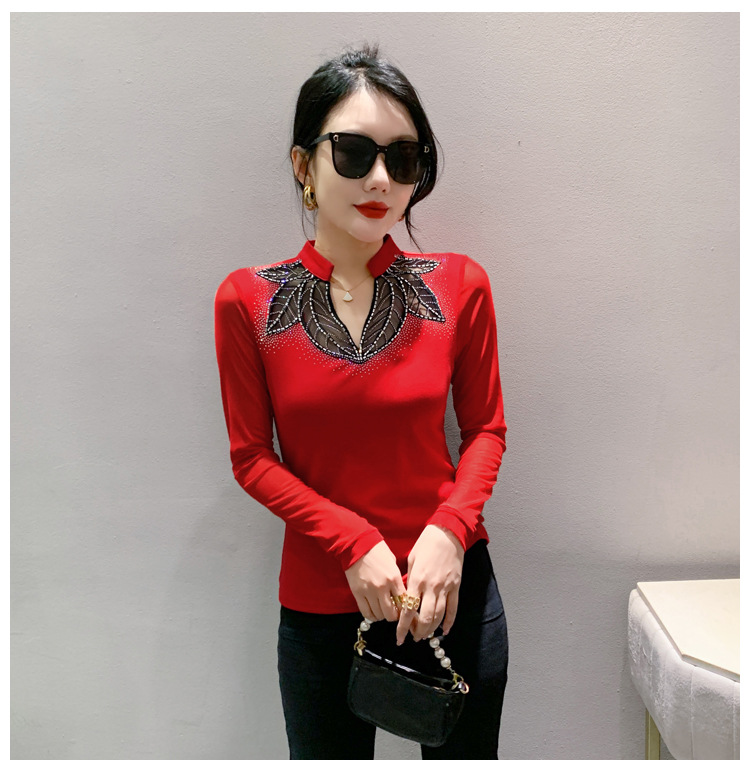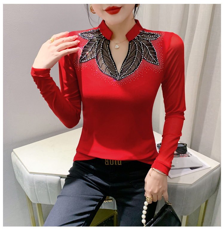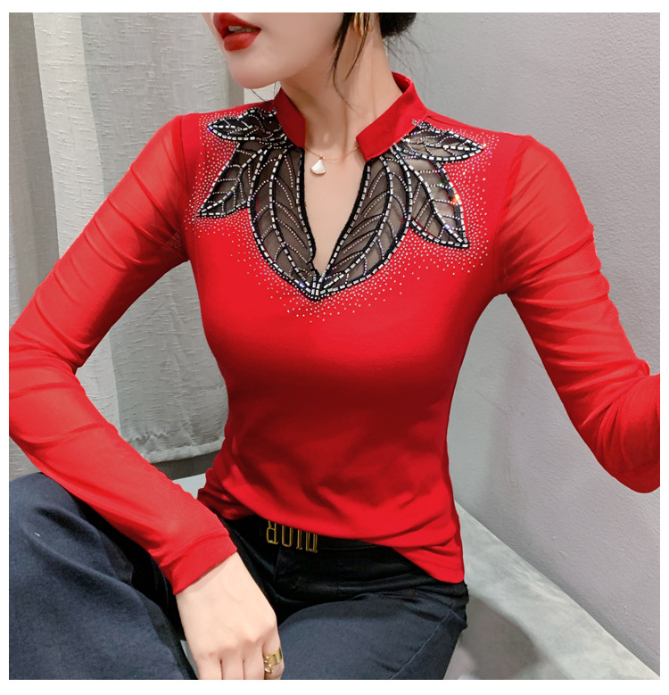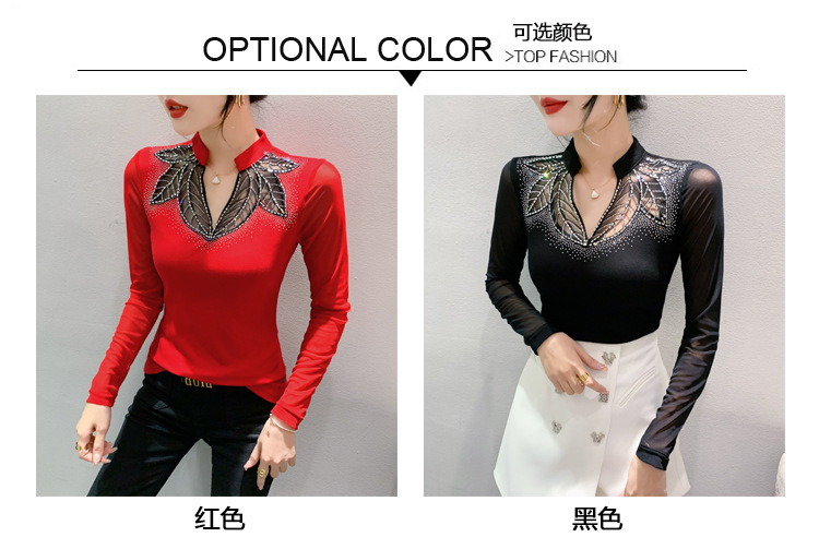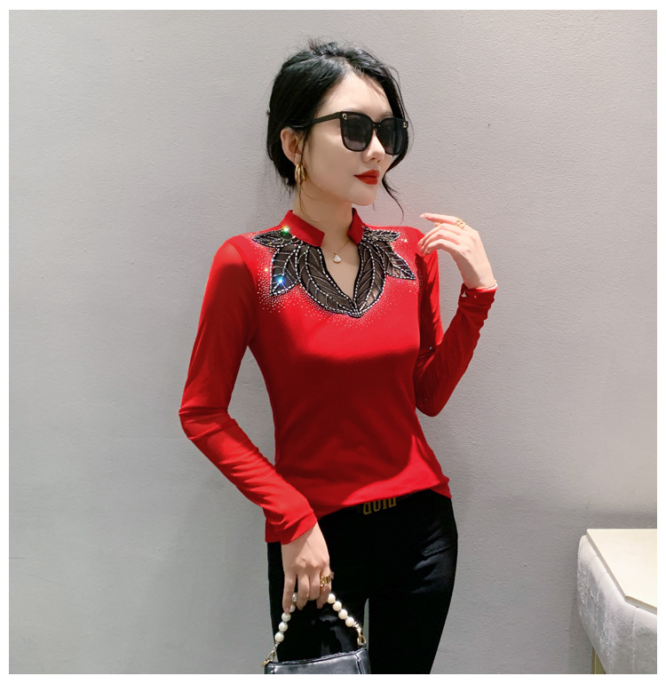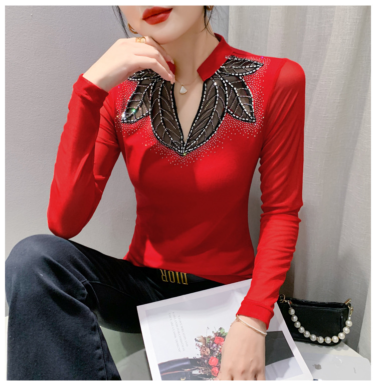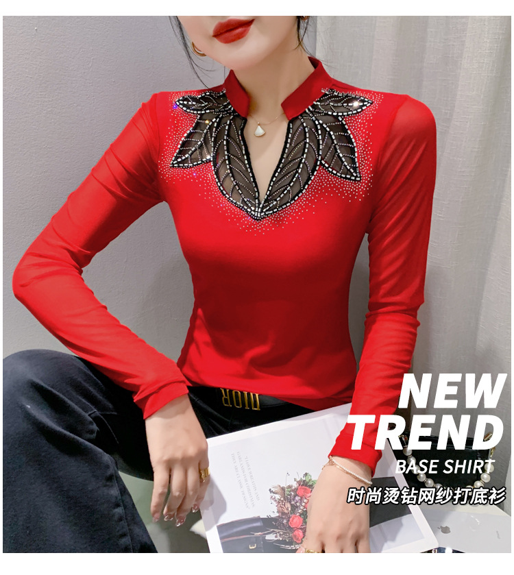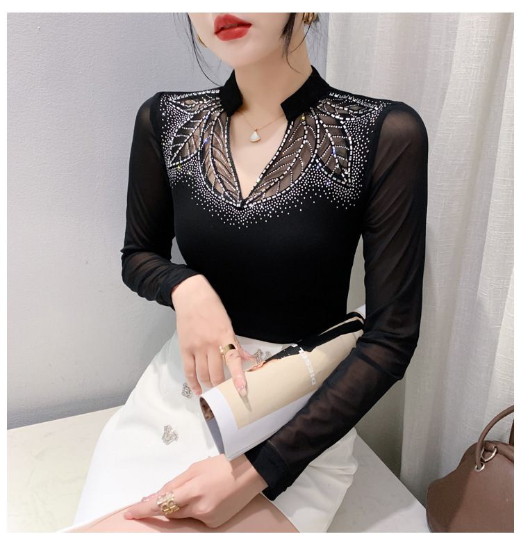 网纱拼接打底衫女秋冬欧货洋气重工烫钻上衣性感V领长袖T恤小衫潮