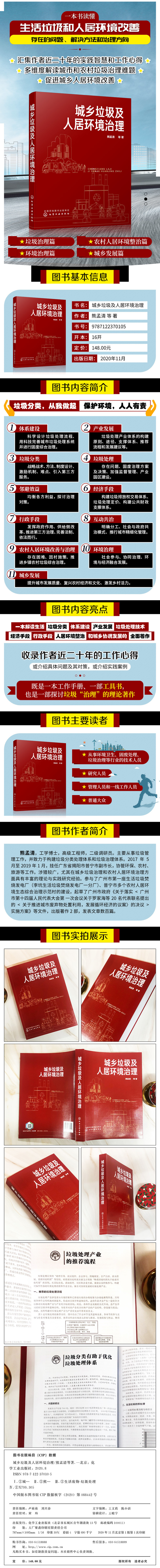 《城乡垃圾及人居环境治理》收录作者近二十年的工作心得,分为“垃圾治理”“农村人居环境整治”“环境治理”和“城乡发展”4篇,既介绍具体问题及其对策,又介绍实践案例,具有较强的针对性,是一本工作手册、一部工具书,也是一部全面、多角度地论述城乡垃圾及人居环境治理的著作。可供从事环境卫生、固废处理、垃圾治理、乡村建设等行业的技术人员、研究人员、管理人员和一线工作人员参考。 “垃圾治理”篇是本书的主篇,系统介绍了体系建设、产业发展、垃圾分类、垃圾处理、邻避效应、经济手段、行政手段、互动共治8个方面的理论与实践研究成果,论述了“推行”和“实施”垃圾分类的管理、运行和监督,强调了“推行垃圾分类,加强源头需求侧管理” “补齐物质利用短板,加强垃圾处理体系建设”“建立供求均衡价格,优化垃圾处理体系”“推动全社会良性互动(包括地方互动),加强垃圾治理体系建设”等的重要性,梳理垃圾处理体系和垃圾治理体系。