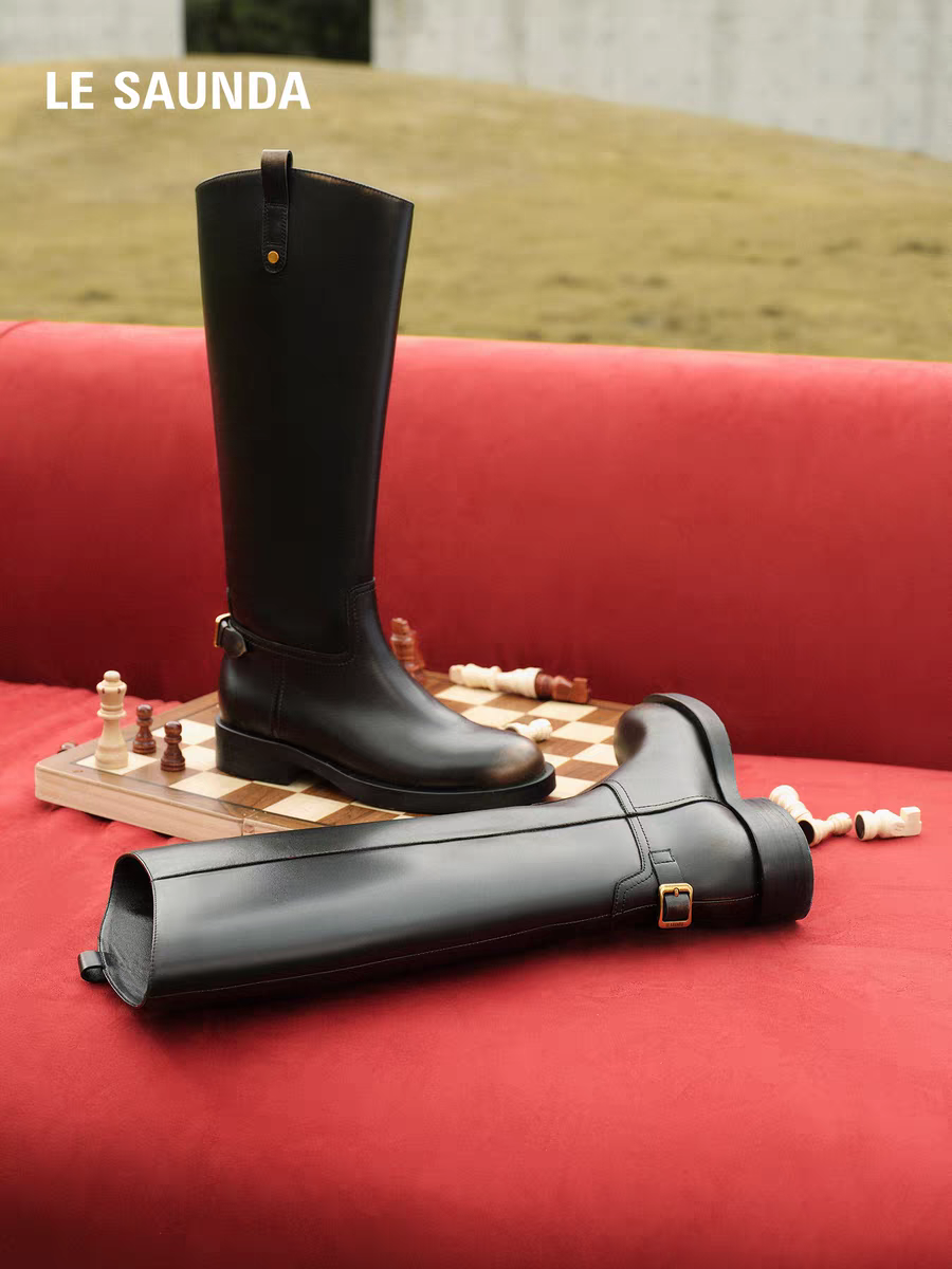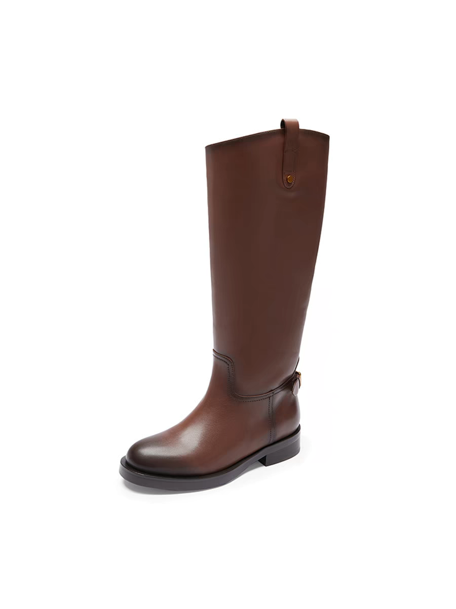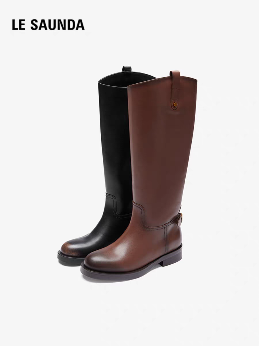 莱尔斯丹2025秋冬新款牛皮显瘦复古粗跟骑士长筒靴子女