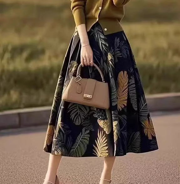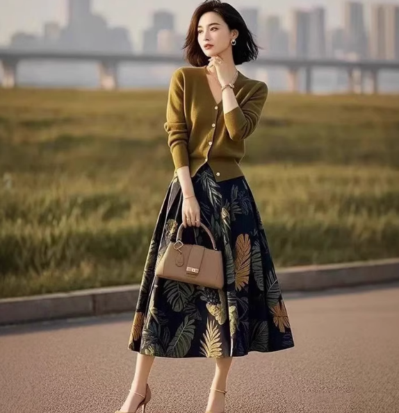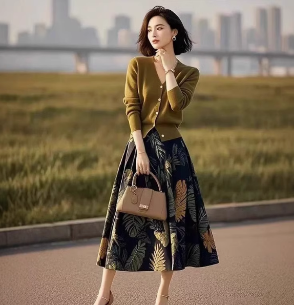 (预售15天)时尚开衫上衣,搭配印花半身裙两件套装LJX-057