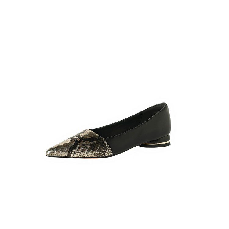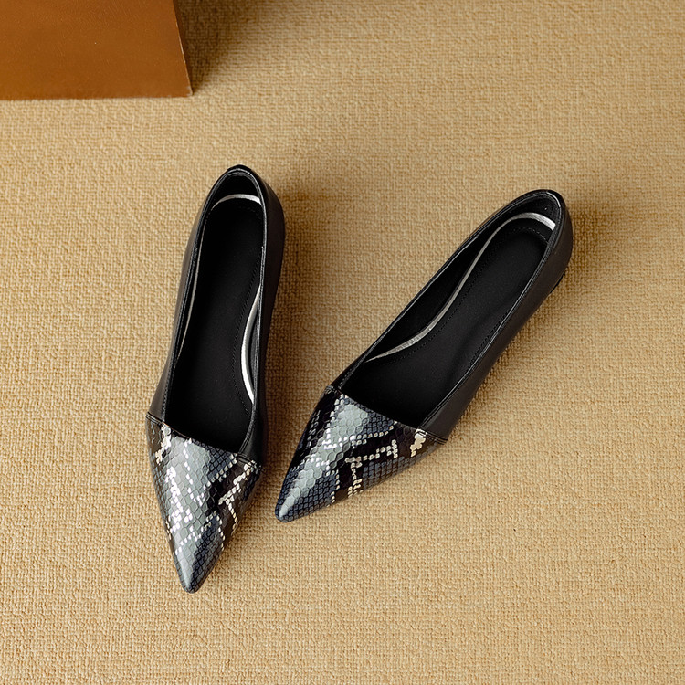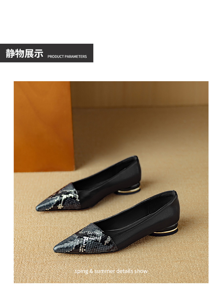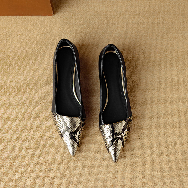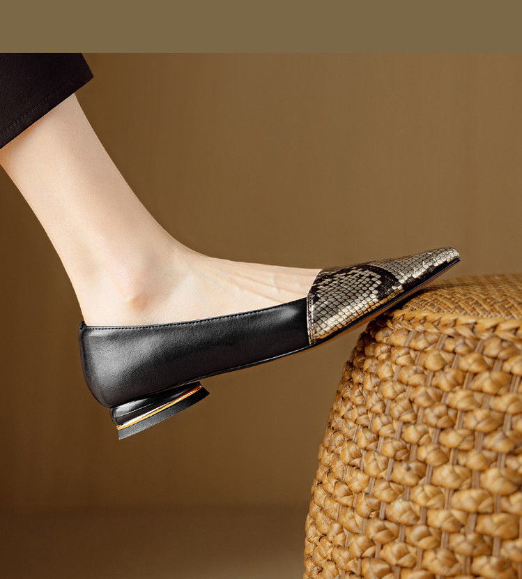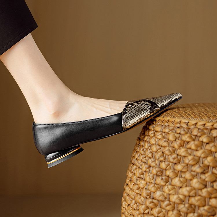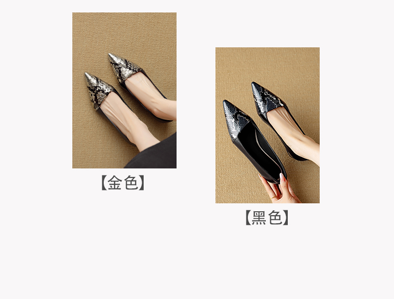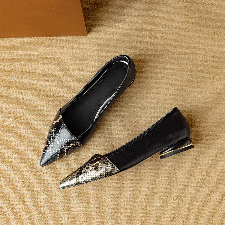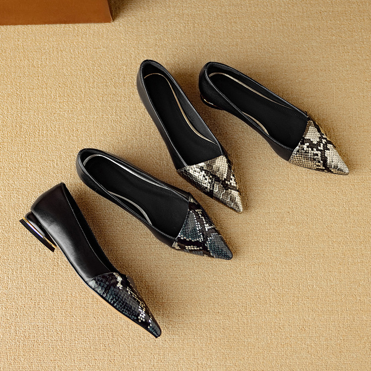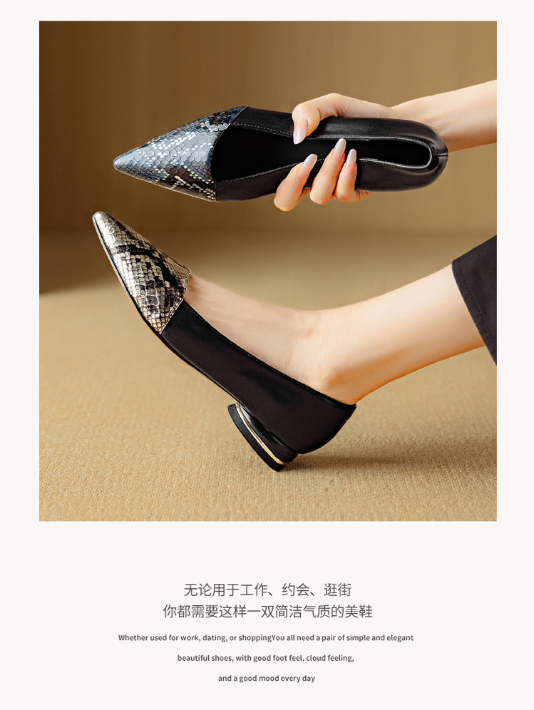 【预售5天】法式低跟浅口单鞋女小皮鞋真皮蛇纹拼色百搭尖头平底鞋DB&M6568