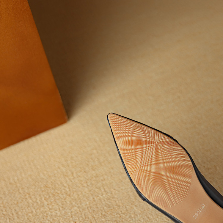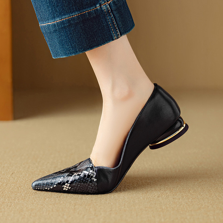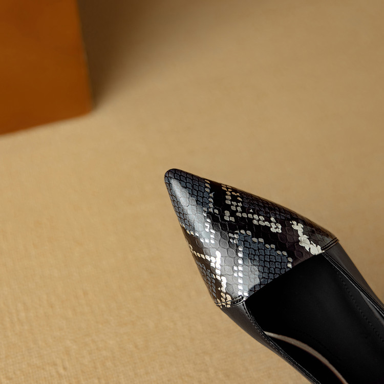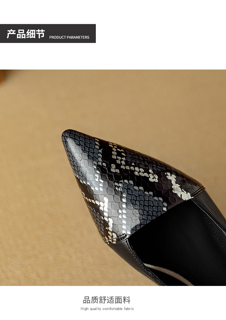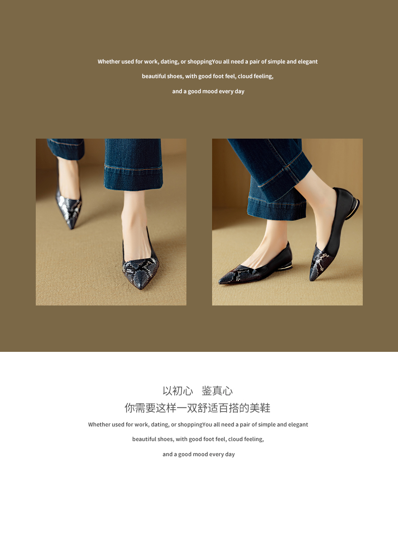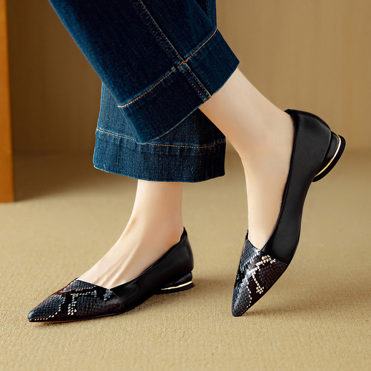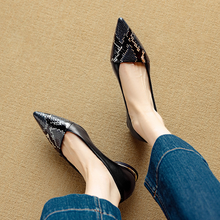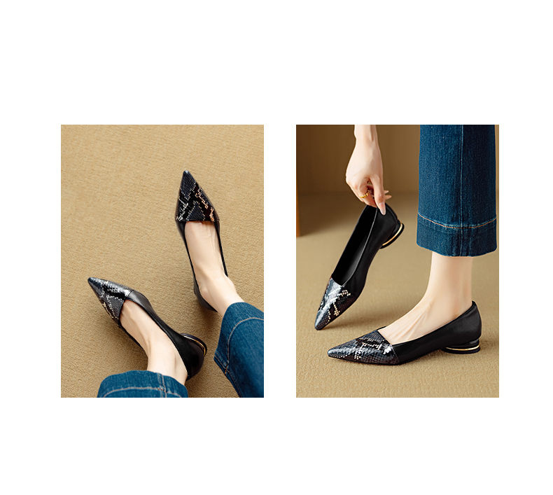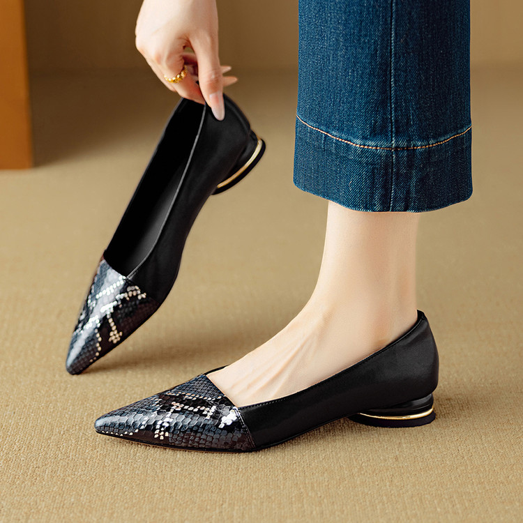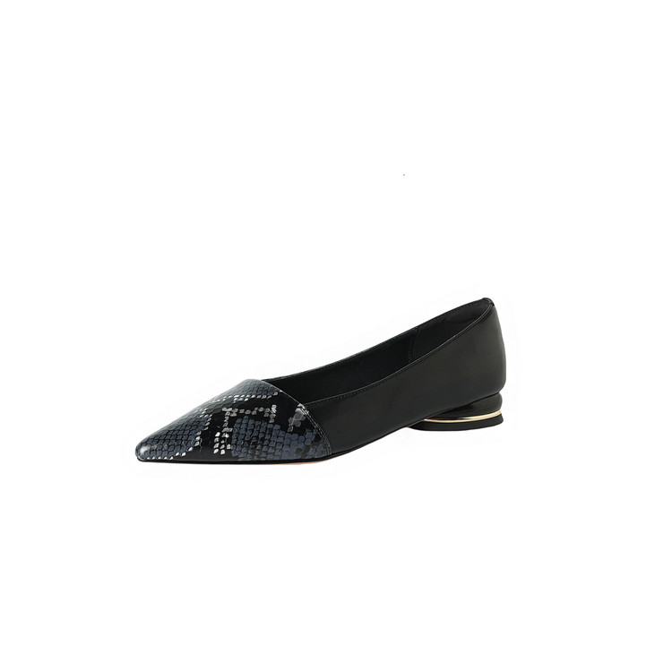 【预售5天】法式低跟浅口单鞋女小皮鞋真皮蛇纹拼色百搭尖头平底鞋DB&M6568