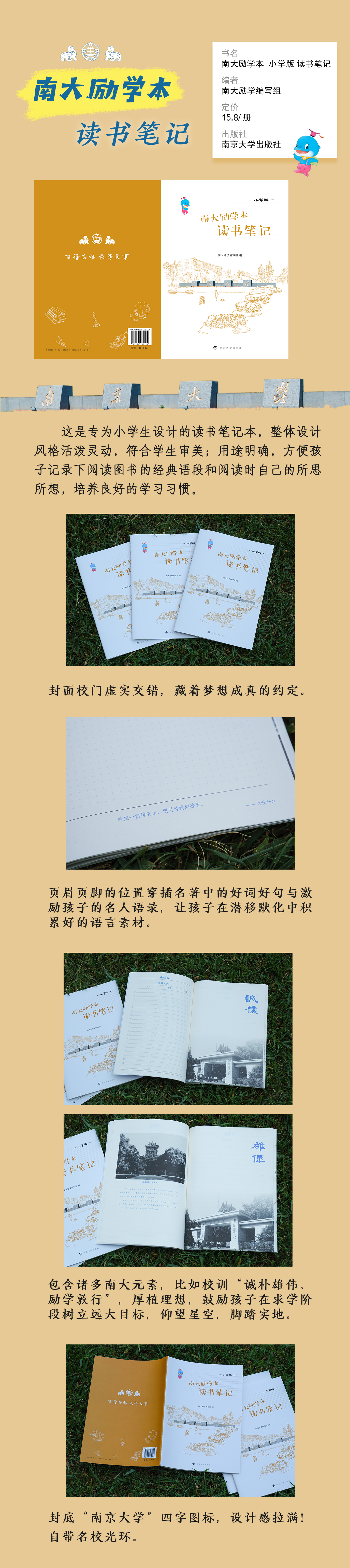 这是专为中小学生设计的读书笔记本,从封面到内文,包含诸多的南大元素,比如校训“诚朴雄伟、励学敦行”,厚植理想,鼓励孩子在求学阶段树立远大目标,仰望星空,脚踩大地。此外,该本子的整体设计风格活泼灵动,符合学生审美;用途明确,方便孩子记录下阅读图书的经典语段和阅读时自己的所思所想,培养良好的学习习惯。页眉页脚的位置穿插名著中的好词好句与激励孩子的名人语录,让孩子在潜移默化中积累好的语言素材。