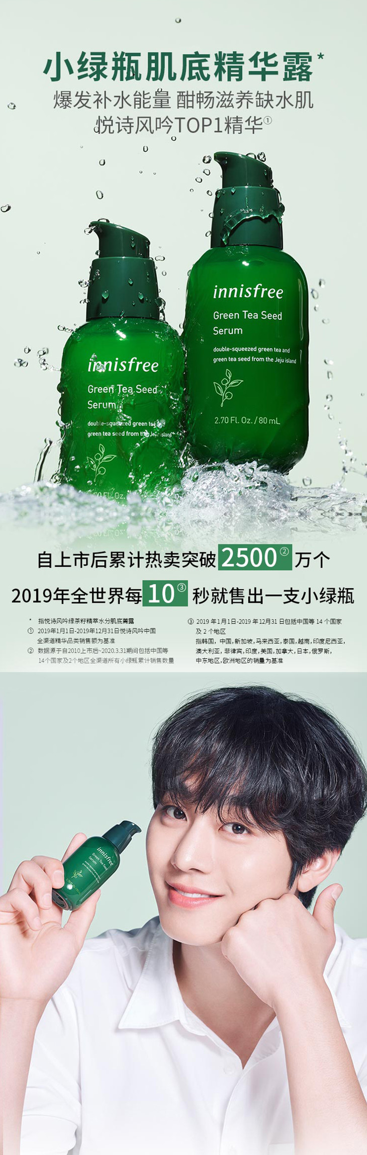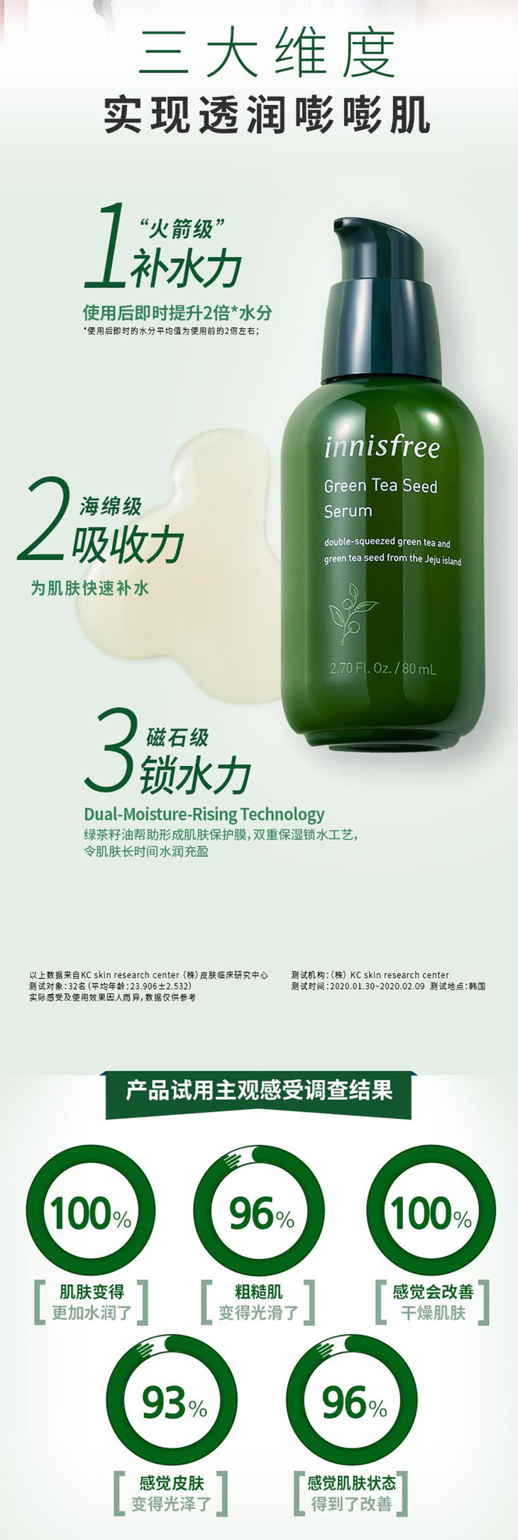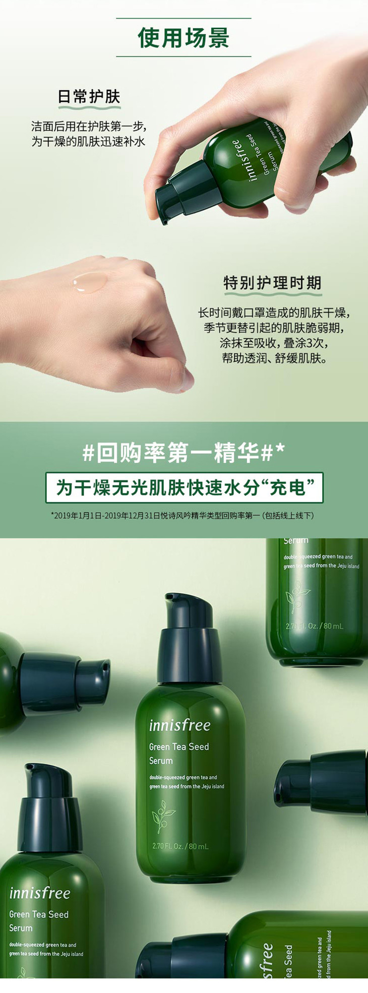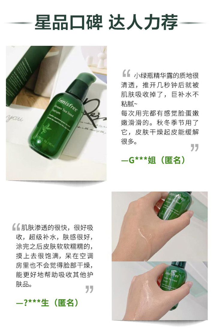 Innisfree悦诗风吟绿茶籽保湿精华80ml👍江湖人称3️⃣秒补水小绿瓶,质地柔滑轻薄🌬,极易吸收,上脸水润清爽不油腻🍃,吸收后肌肤弹润嘭嘭的💨还可以改善肌肤光泽✨
