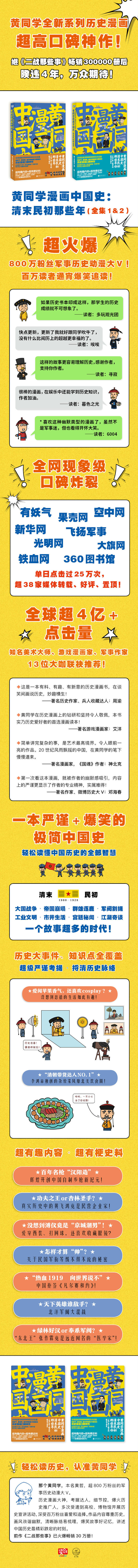 继前作《二战那些事》畅销30万册后,国内首部以漫画的形式讲述清末民初——中国近现代历史浓墨重彩的开端的作品。《黄同学漫画中国史》以轻松、幽默的画风,按历史发生的时间轴,通过一个个生动有趣的故事,将那一段宏大的清末民初历史如画卷般慢慢展现在读者的眼中。让读者轻松地记住了清末民初的那段历史,明了战争的缘由,知晓过程中发生的一些特别的故事。