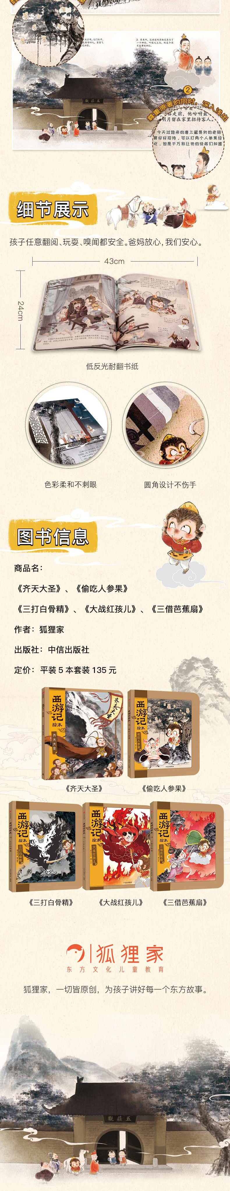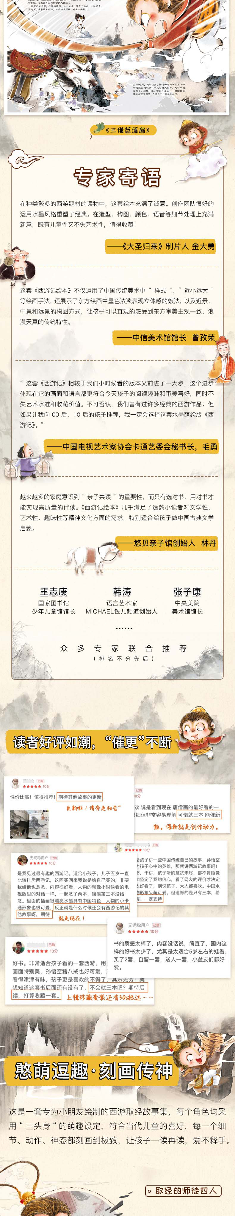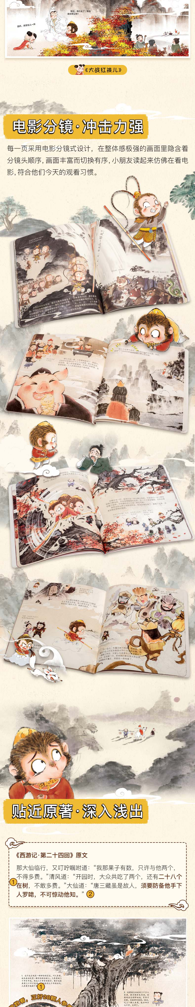 这套书的每一个细节都尽可能贴近原著描述的场景和人物,并在此基础上剔除了较复杂难懂的情节,适合给孩子《西游记》启蒙。