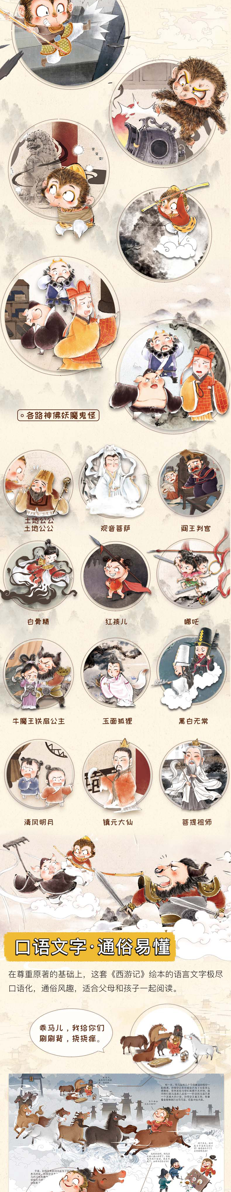 在尊重原著的基础上,这套《西游记》绘本的语言文字极尽口语化,通俗风趣,适合父母和孩子一起阅读。