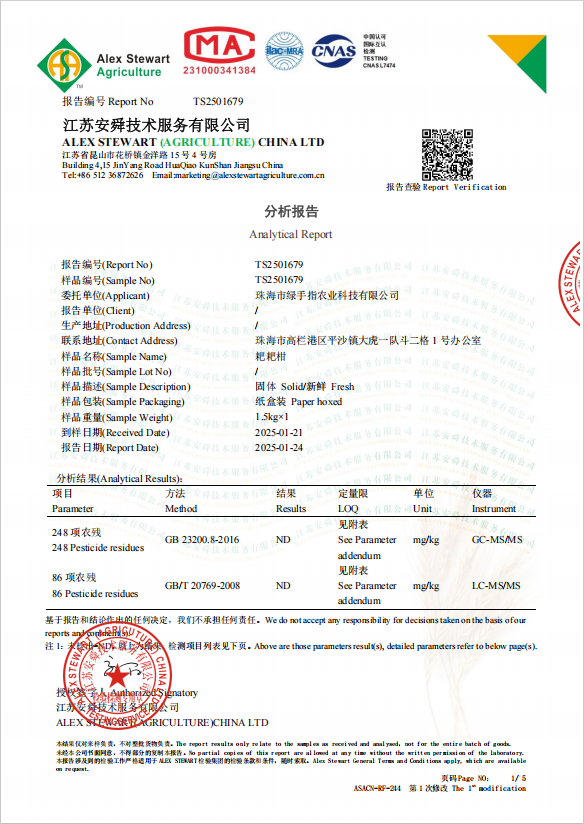 绿手指也对耙耙柑进行了抽检,334项农残无检出。