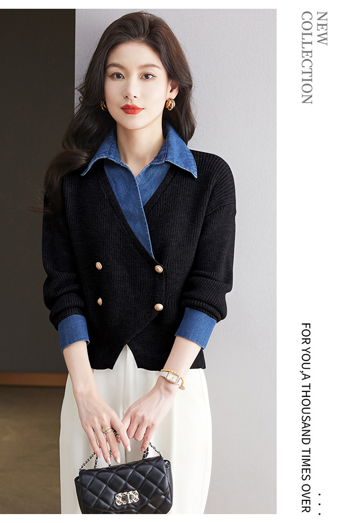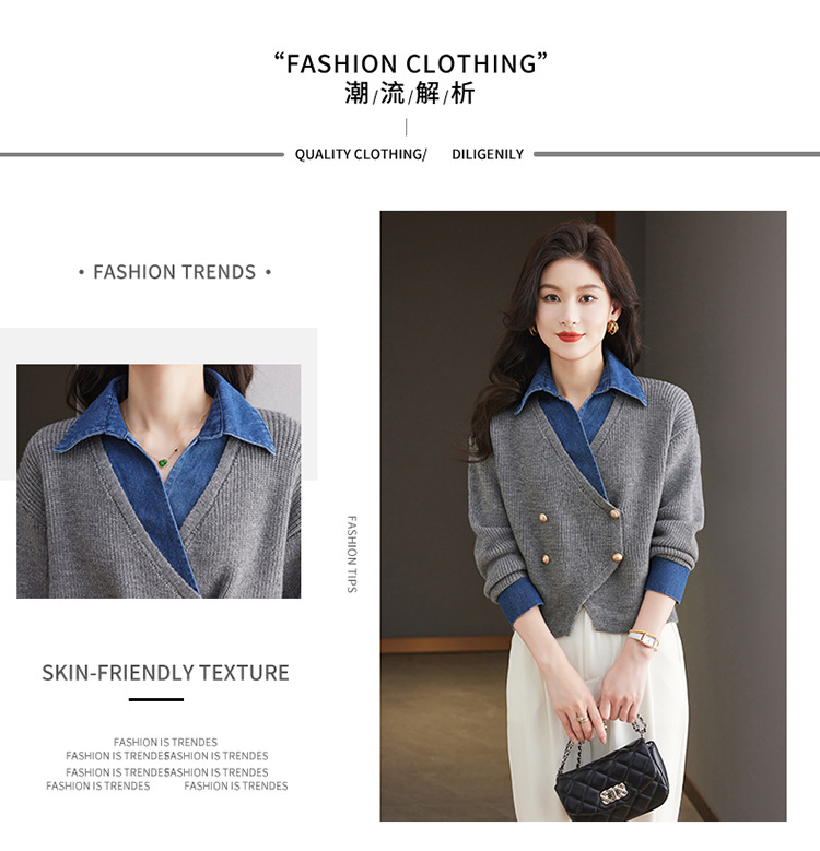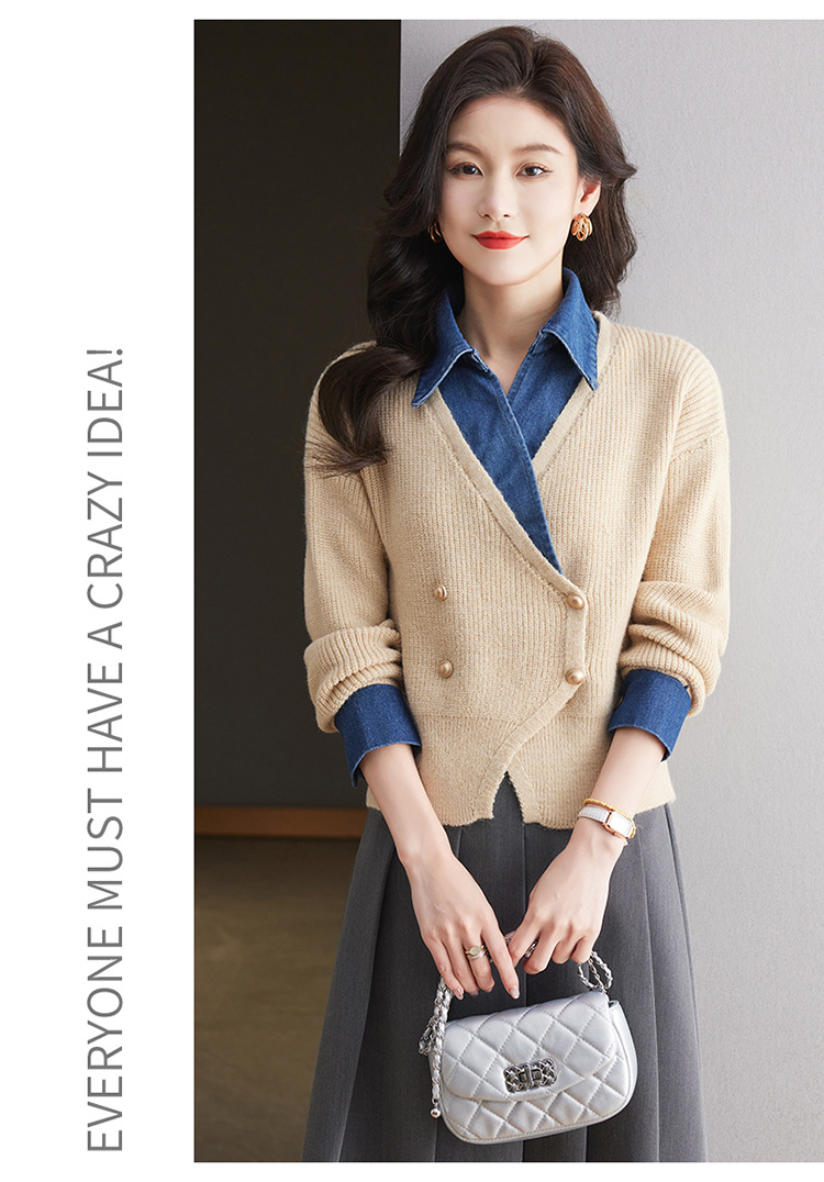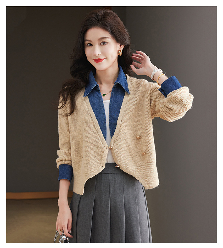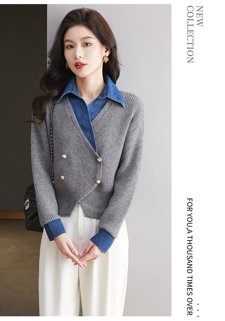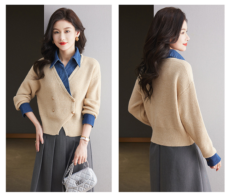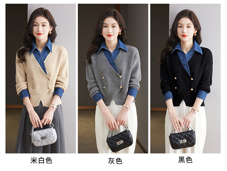短款开衫高腰配裙子,拼接牛仔衬衫领针织衫CC- 27-24134