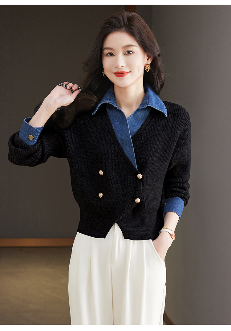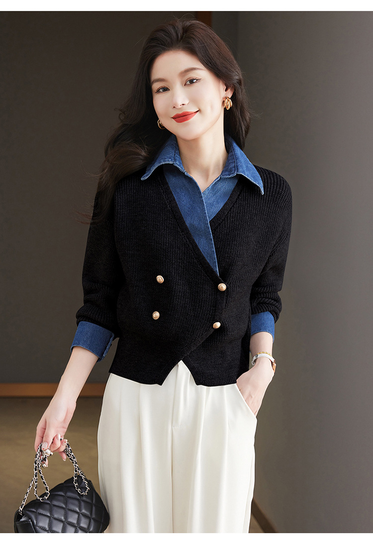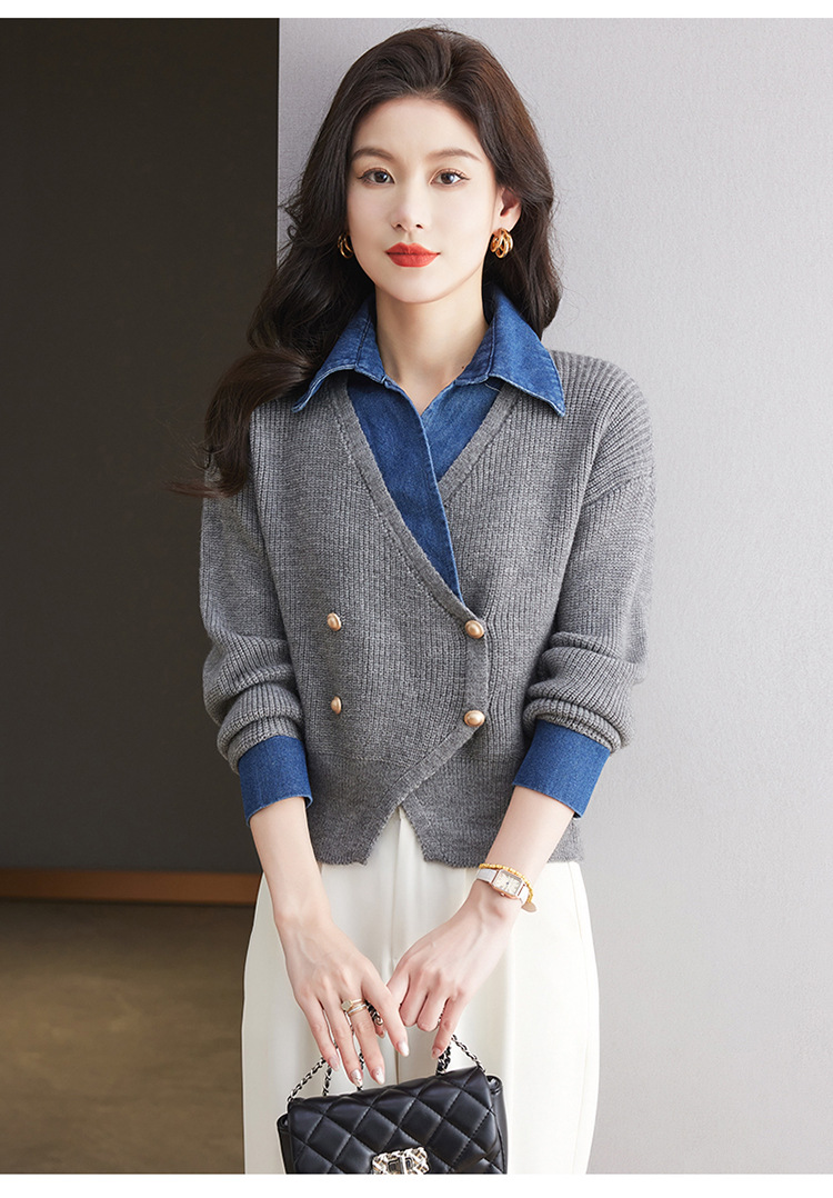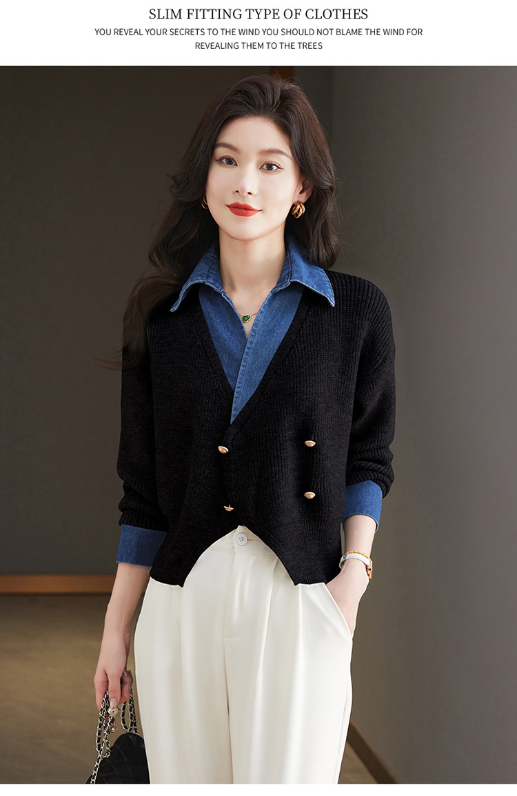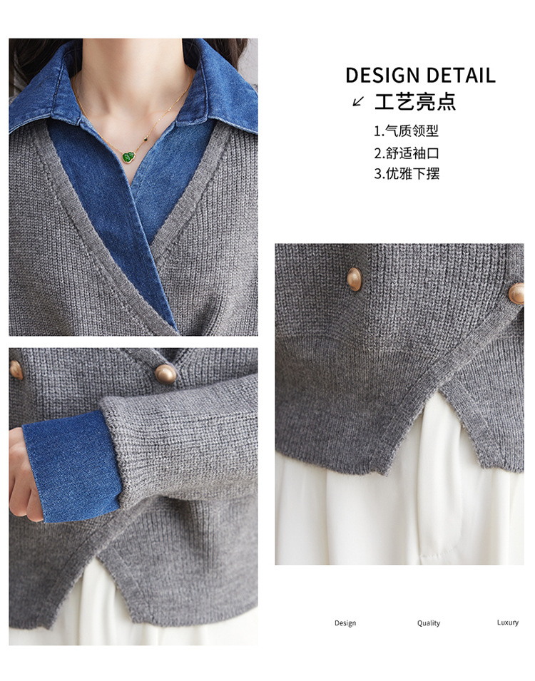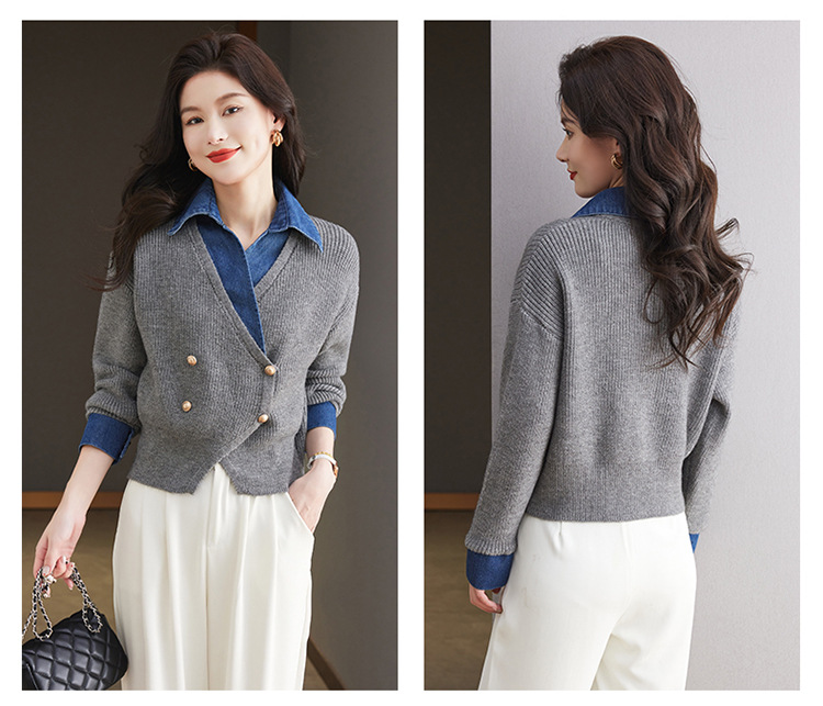 短款开衫高腰配裙子,拼接牛仔衬衫领针织衫CC- 27-24134