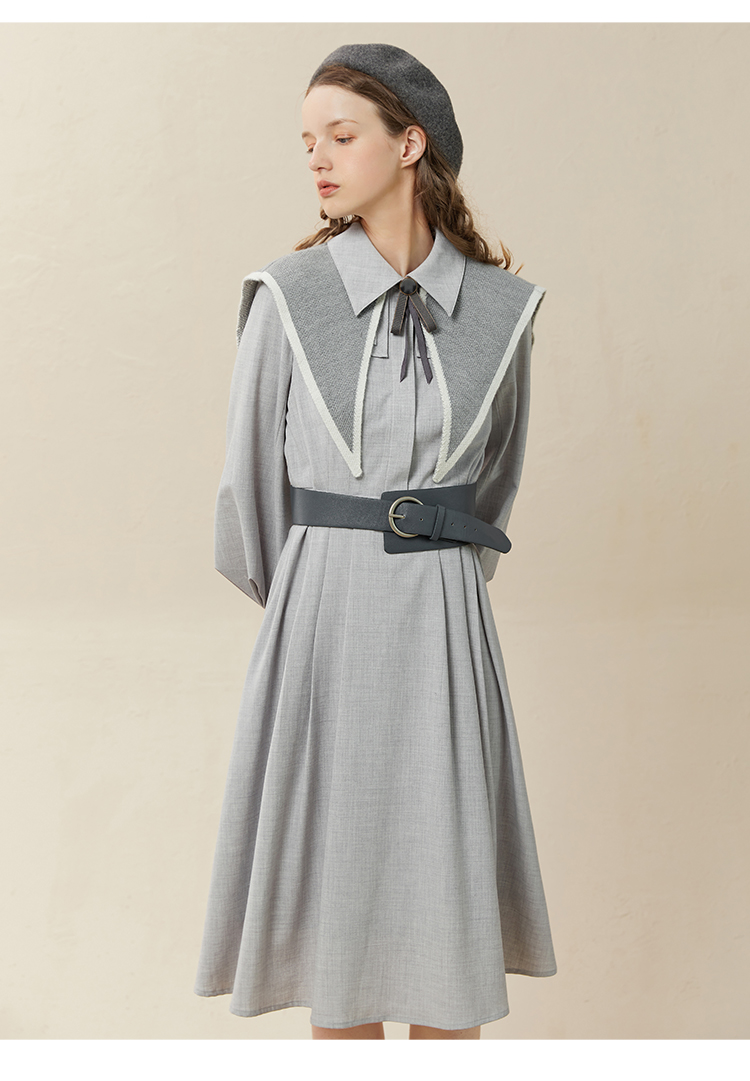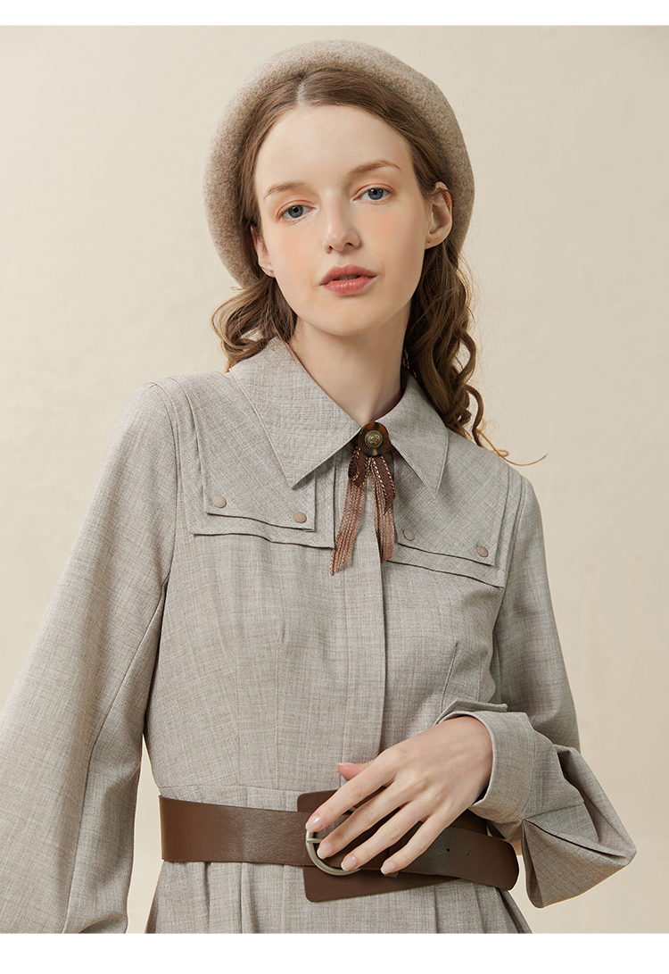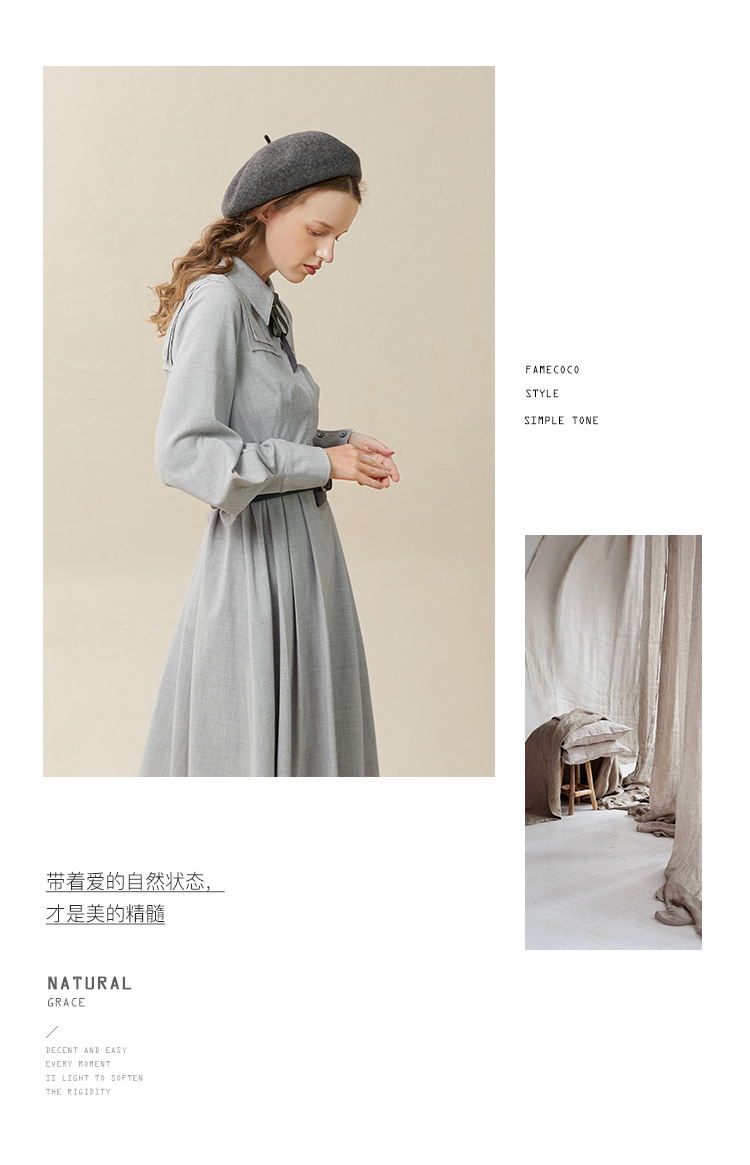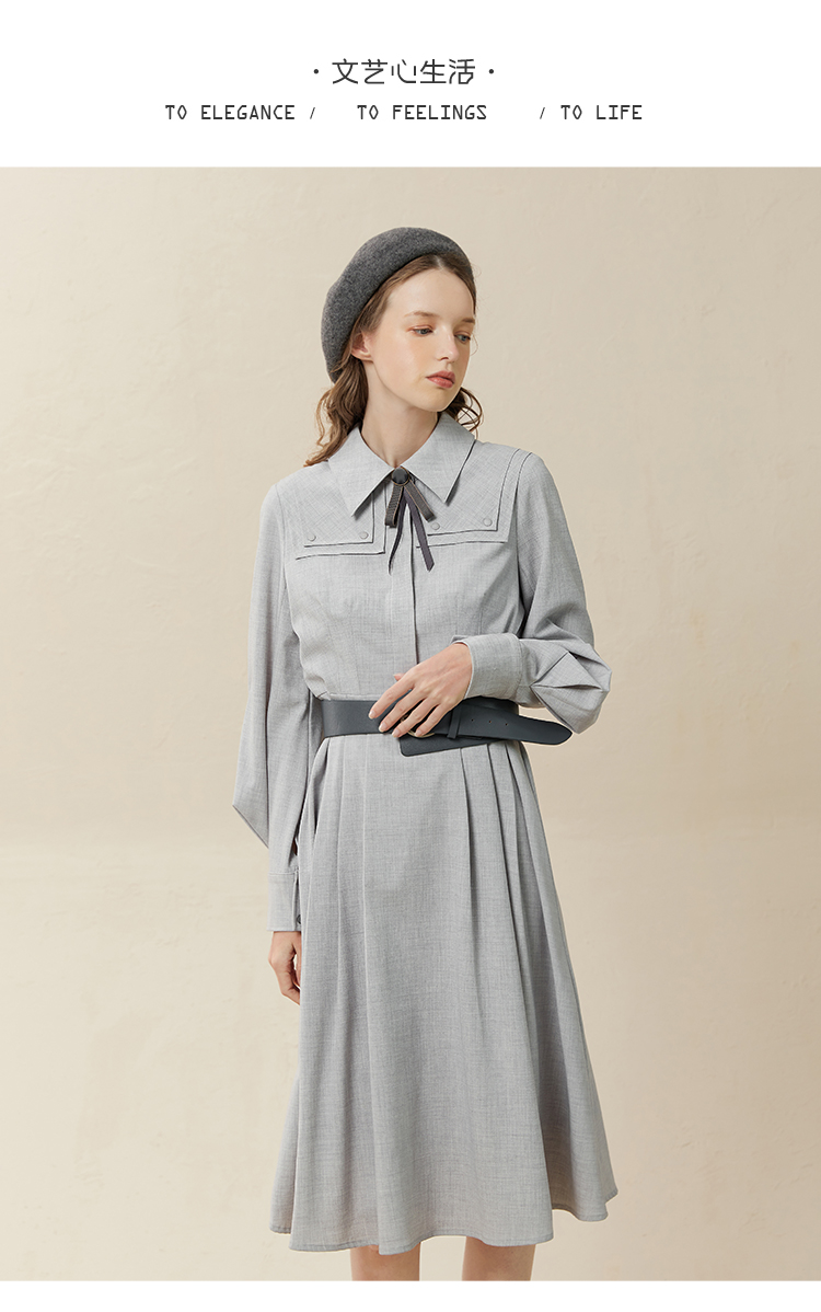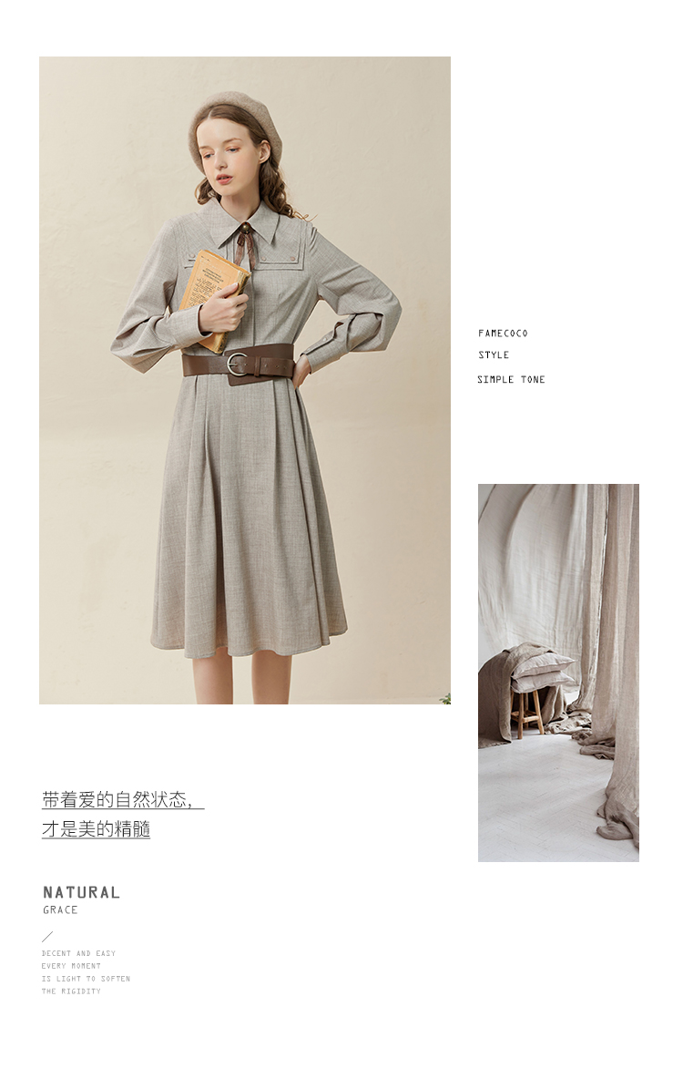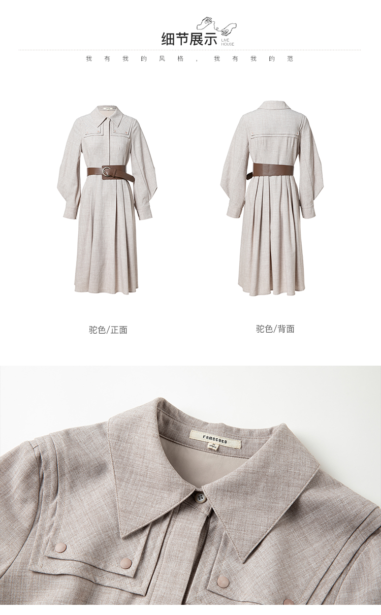 Famecoco范可儿磨毛衬衫裙女披肩领连衣裙腰带收腰显瘦F228FA010