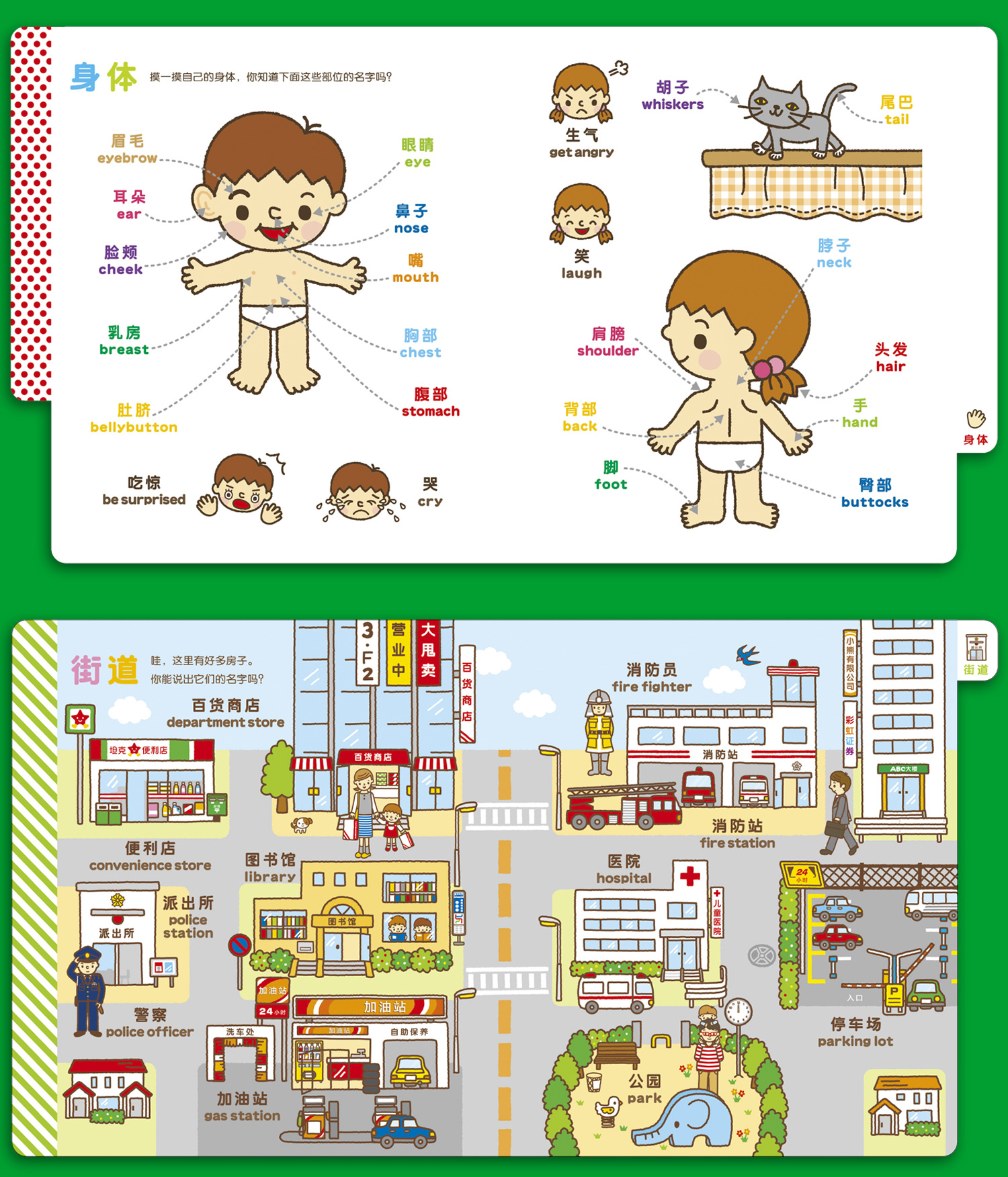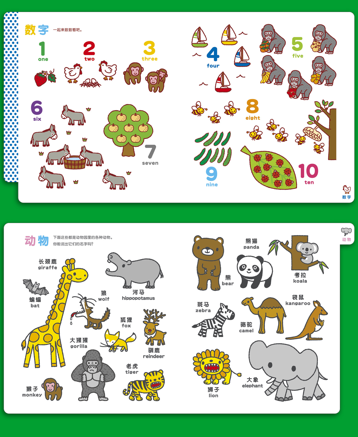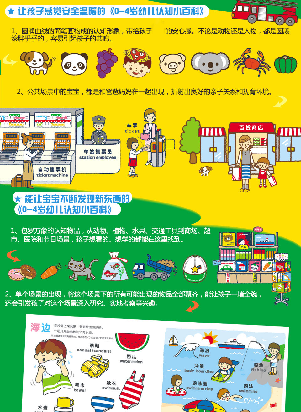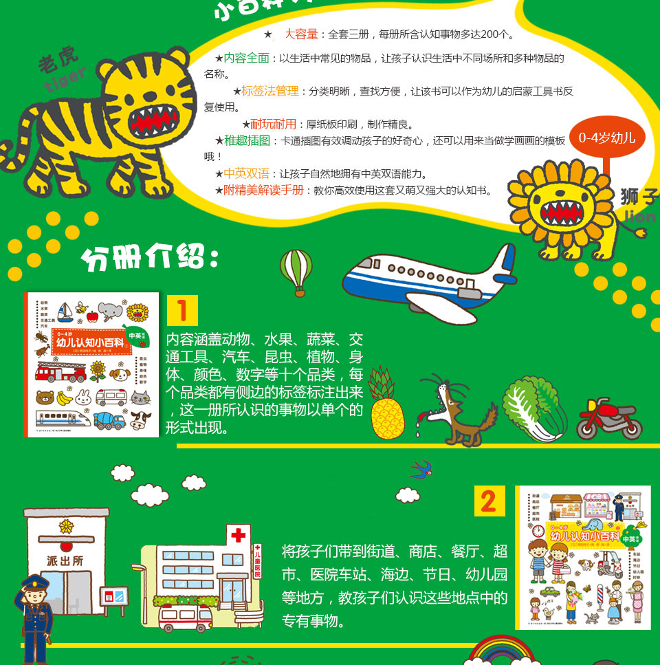 这套0-4岁幼儿认知小百科,全套三册,是日本低幼认知类图书中的明星产品,全系列销量超过150万册,重印多达35次。优点多到数不清呢,认知内容涵盖小朋友们在生活中几乎全部会碰到和接触到的东西,按照物品属性或者场景不同来分类,并且从易到难进阶排序。图书采用生动有趣的卡通图鉴形式,并附有中英双语,还可利用标签管理法快速查找。下面让我们来分别看一看这个系列的三本书吧。 系列中的第*本适合刚刚开始学习说话和认识周围事物的孩子,内容涵盖动物、水果、蔬菜、交通工具、汽车、昆虫、植物、身体、颜色、数字等十个品类,每个品类都有侧边的标签标注出来,这一册所认识的事物以单个的形式出现。 系列中的第二本以场景来分类,将孩子们带到街道、商店、餐厅、超市、医院、车站、海边、节日、幼儿园等地点,教孩子们认识这些特殊地点的专有事物。 系列中的第三本是这套书中的进阶篇,带给那些想认识更多东西的孩子们。认知的事物包括食物、家庭、天空、鸟、玩具、乐器、服装、家居用品、城市设施。 |