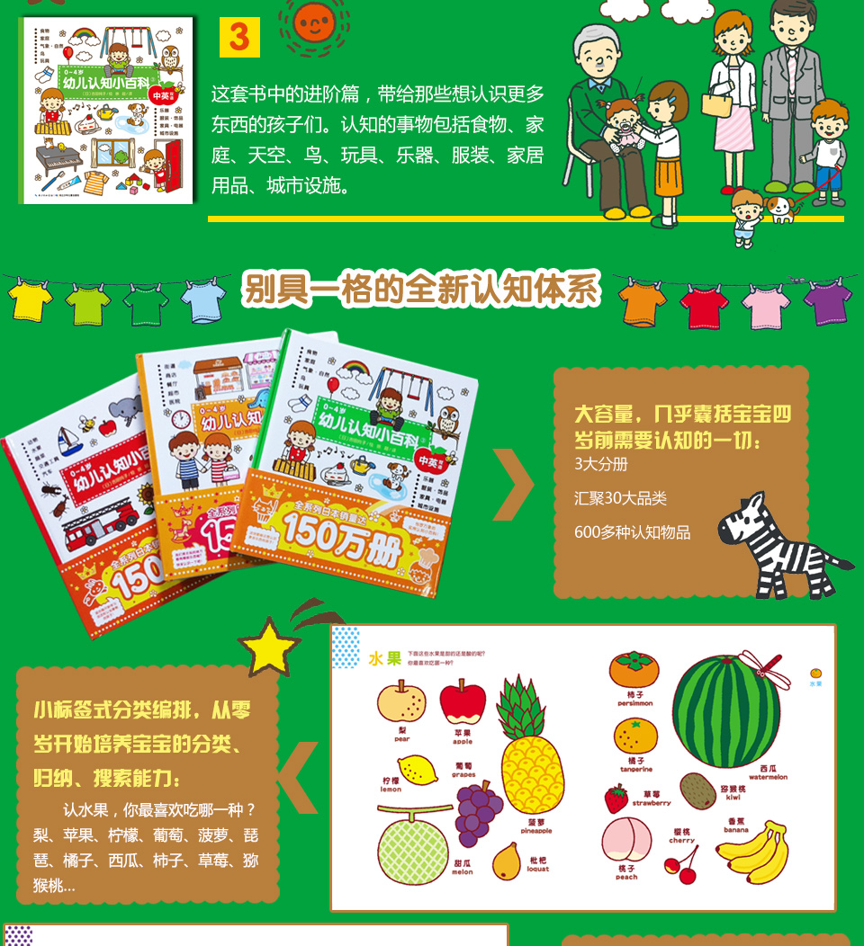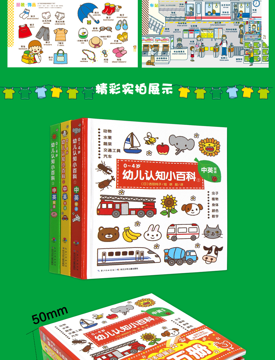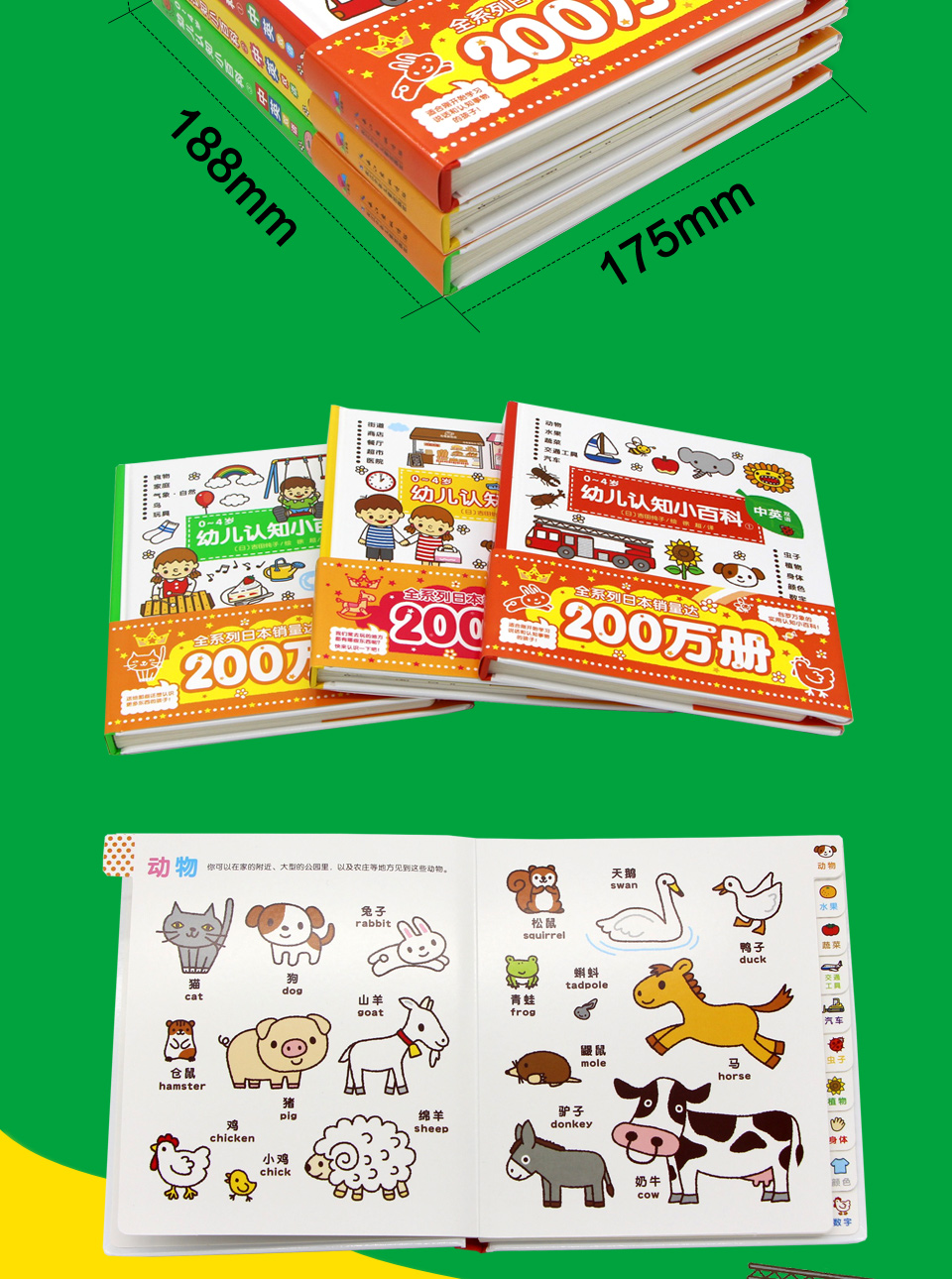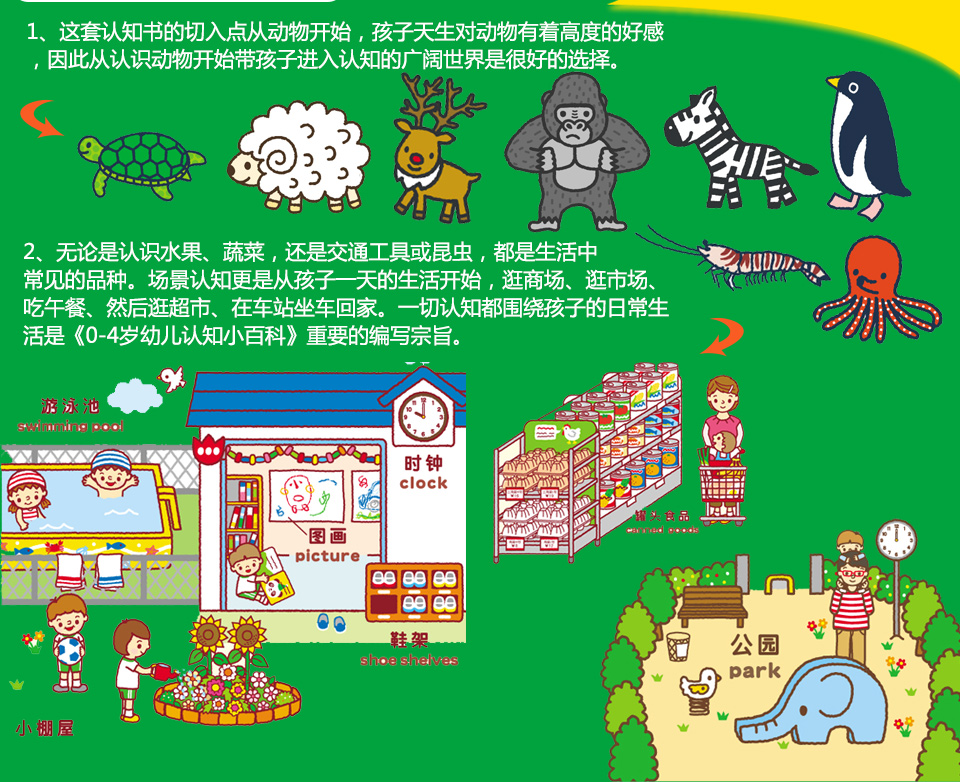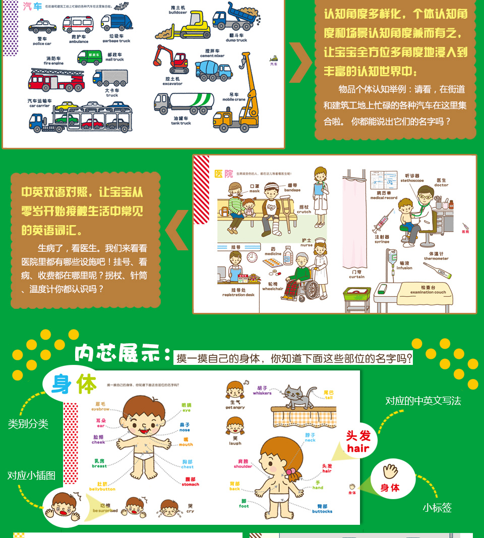 这套0-4岁幼儿认知小百科,全套三册,是日本低幼认知类图书中的明星产品,全系列销量超过150万册,重印多达35次。优点多到数不清呢,认知内容涵盖小朋友们在生活中几乎全部会碰到和接触到的东西,按照物品属性或者场景不同来分类,并且从易到难进阶排序。图书采用生动有趣的卡通图鉴形式,并附有中英双语,还可利用标签管理法快速查找。下面让我们来分别看一看这个系列的三本书吧。 系列中的第*本适合刚刚开始学习说话和认识周围事物的孩子,内容涵盖动物、水果、蔬菜、交通工具、汽车、昆虫、植物、身体、颜色、数字等十个品类,每个品类都有侧边的标签标注出来,这一册所认识的事物以单个的形式出现。 系列中的第二本以场景来分类,将孩子们带到街道、商店、餐厅、超市、医院、车站、海边、节日、幼儿园等地点,教孩子们认识这些特殊地点的专有事物。 系列中的第三本是这套书中的进阶篇,带给那些想认识更多东西的孩子们。认知的事物包括食物、家庭、天空、鸟、玩具、乐器、服装、家居用品、城市设施。 |