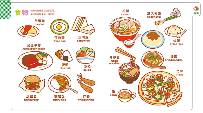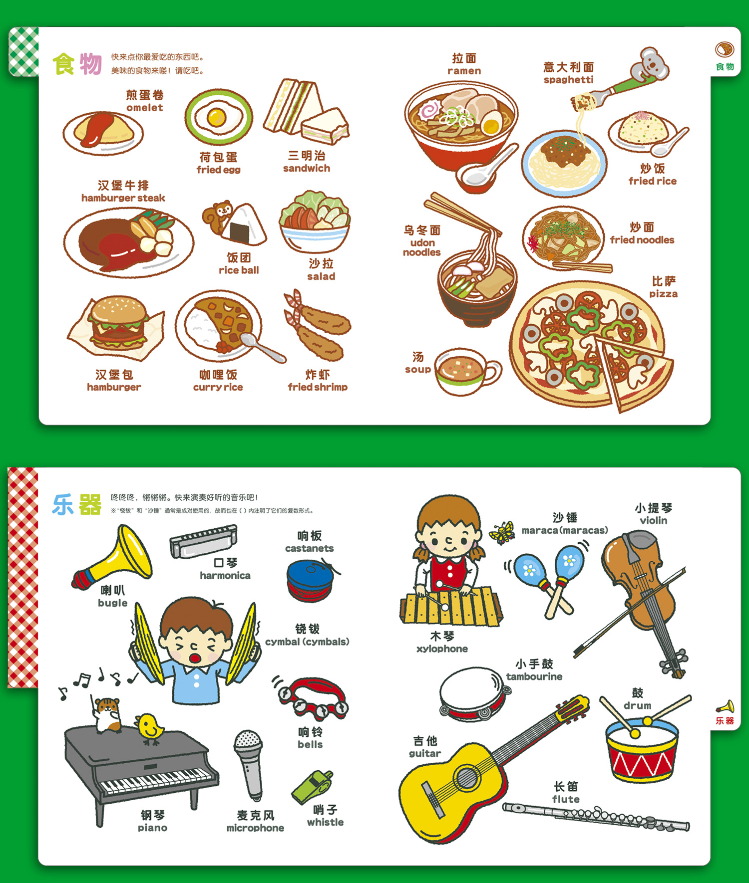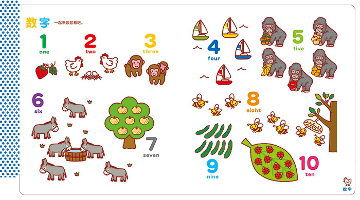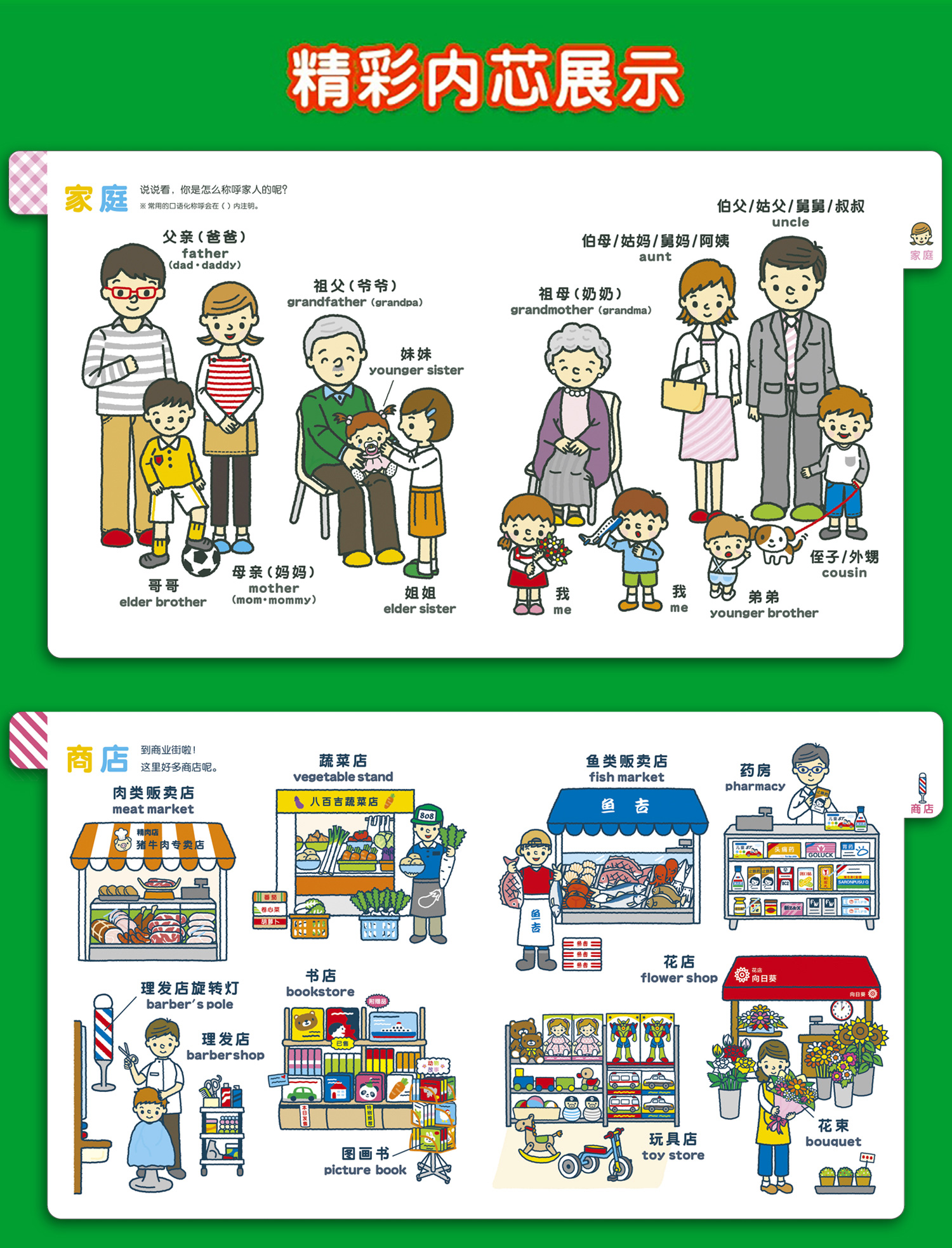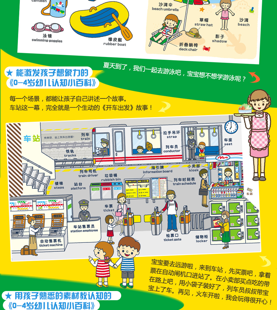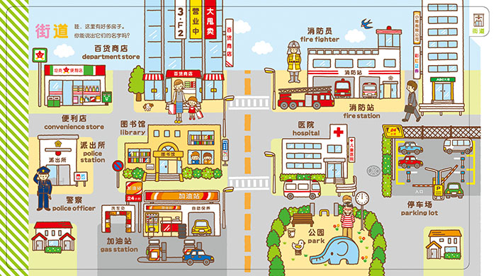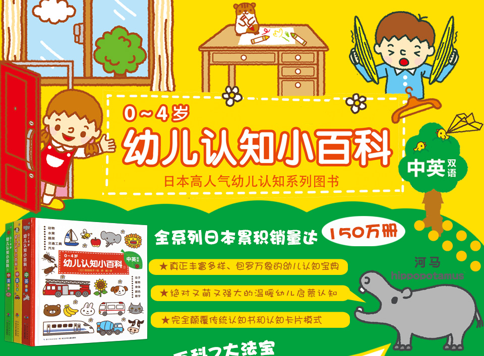 这套0-4岁幼儿认知小百科,全套三册,是日本低幼认知类图书中的明星产品,全系列销量超过150万册,重印多达35次。优点多到数不清呢,认知内容涵盖小朋友们在生活中几乎全部会碰到和接触到的东西,按照物品属性或者场景不同来分类,并且从易到难进阶排序。图书采用生动有趣的卡通图鉴形式,并附有中英双语,还可利用标签管理法快速查找。下面让我们来分别看一看这个系列的三本书吧。 系列中的第*本适合刚刚开始学习说话和认识周围事物的孩子,内容涵盖动物、水果、蔬菜、交通工具、汽车、昆虫、植物、身体、颜色、数字等十个品类,每个品类都有侧边的标签标注出来,这一册所认识的事物以单个的形式出现。 系列中的第二本以场景来分类,将孩子们带到街道、商店、餐厅、超市、医院、车站、海边、节日、幼儿园等地点,教孩子们认识这些特殊地点的专有事物。 系列中的第三本是这套书中的进阶篇,带给那些想认识更多东西的孩子们。认知的事物包括食物、家庭、天空、鸟、玩具、乐器、服装、家居用品、城市设施。 |