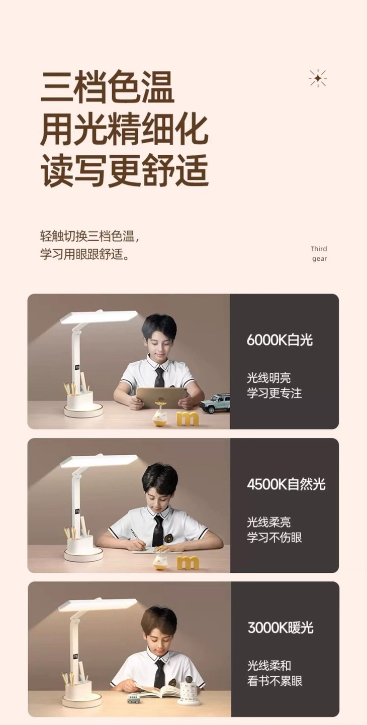 ✅三档色温调节 轻触切换三档色温 🔺6000K白光,光线明亮,学习更专注 🔺4500K自然光,光线柔和,学习不伤眼 🔺3000K暖光,光线柔和,看书不累眼 用光精细化,读写更舒适