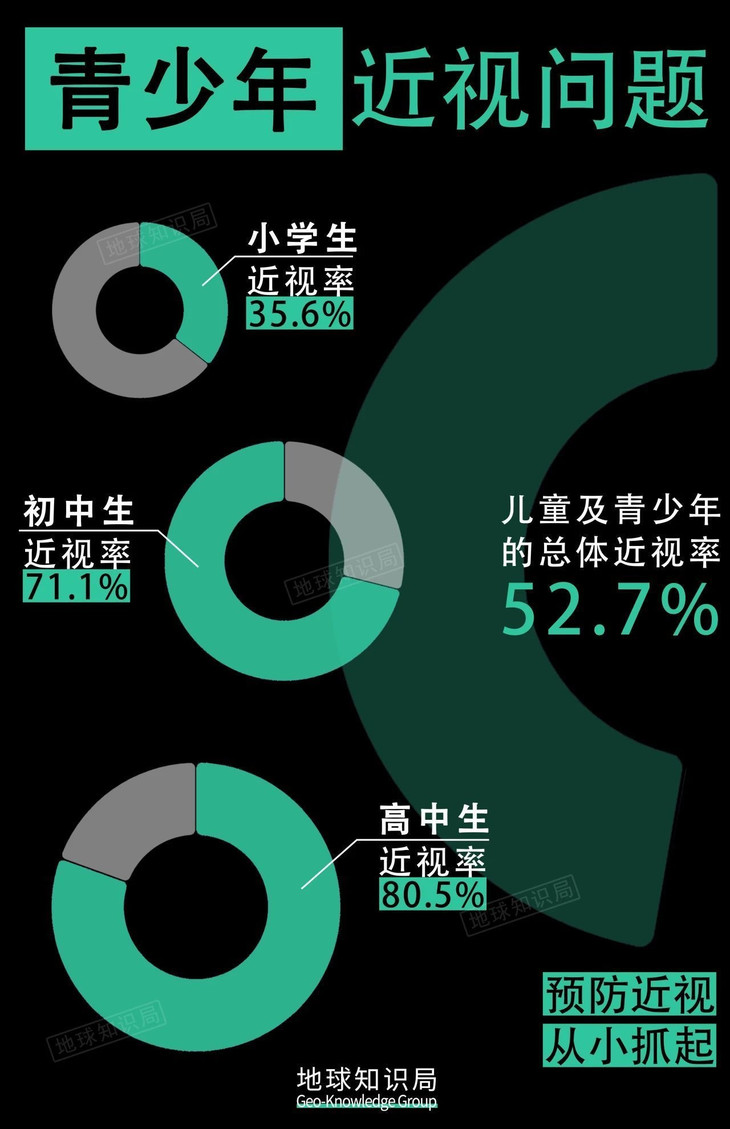 🔍根据最新的数据 我国儿童及青少年的总体近视率为52.7% 其中小学生为35.6% 初中生为71.1%,高中生为80.5%。 这一数据显示了: 近视问题,在我国青少年中的普遍性和严重性