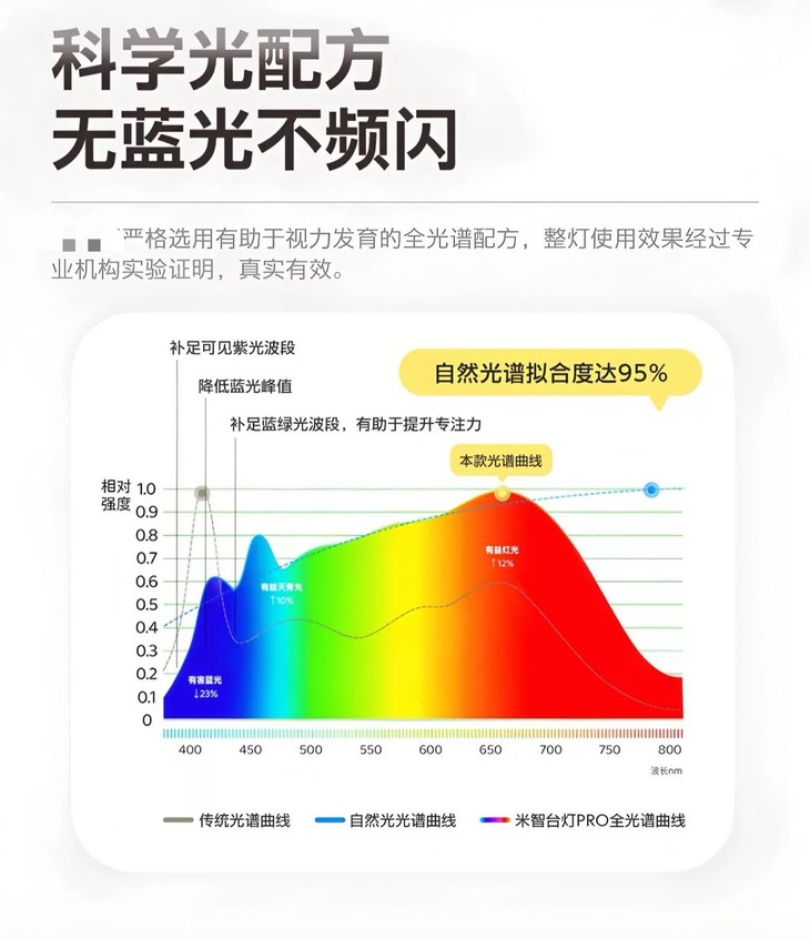 全光谱灯有利于防近视?是智商税吗❓ ⚠️科学研究已经证明,充足的户外活动 可以增加儿童的远视储备,从而降低近视的概率 然而,具体原因仍不明确 有专家认为,太阳光中的某些光线 对儿童眼睛的照射可能是关键因素之一 在孩子学习任务重、户外运动较少的情况下 “全光谱”灯能否完全替代太阳光,起到防近视的作用呢?对此,我们还没有确切的结论 但可以说的是,它能够提升照明环境 有助于减少孩子近视的发生 📣总结一下,我们认为“全光谱”LED灯 并不是“智商税”,它确实能够让眼睛更舒适 并且对防近视有所帮助 ✨ 不过,更重要的是保持科学、良好的 用眼习惯,以及增加户外活动,这才是关键!