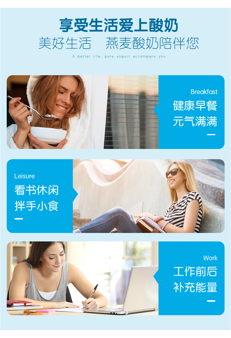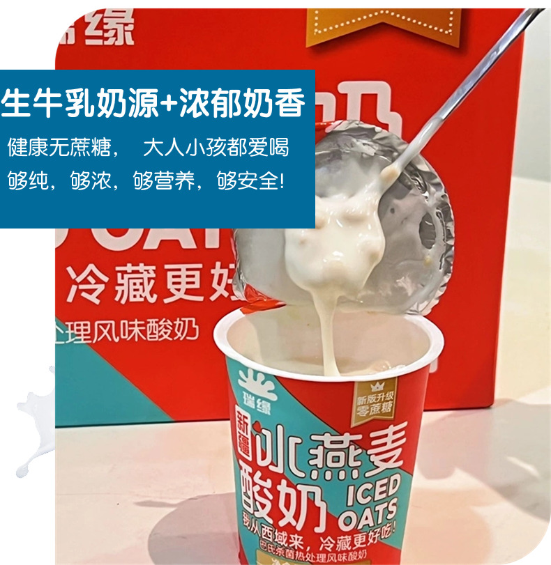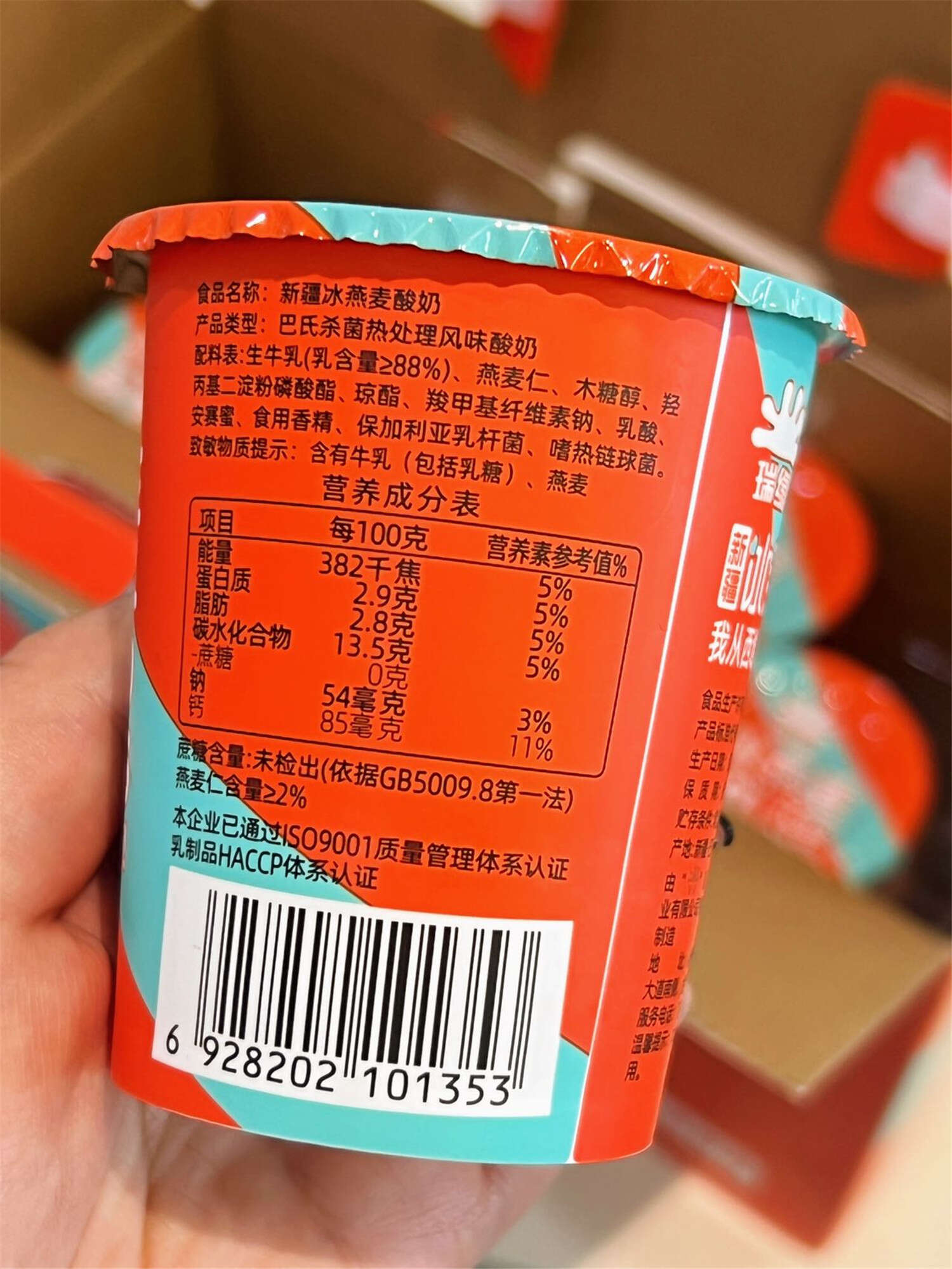 【配料】生牛乳(乳含量≥88%)、燕麦仁、木糖醇、羟丙基二淀粉磷酸酯、琼酯、羧甲基纤维素钠、乳酸、安赛蜜、食用香精、保加利亚乳杆菌、嗜热链球菌