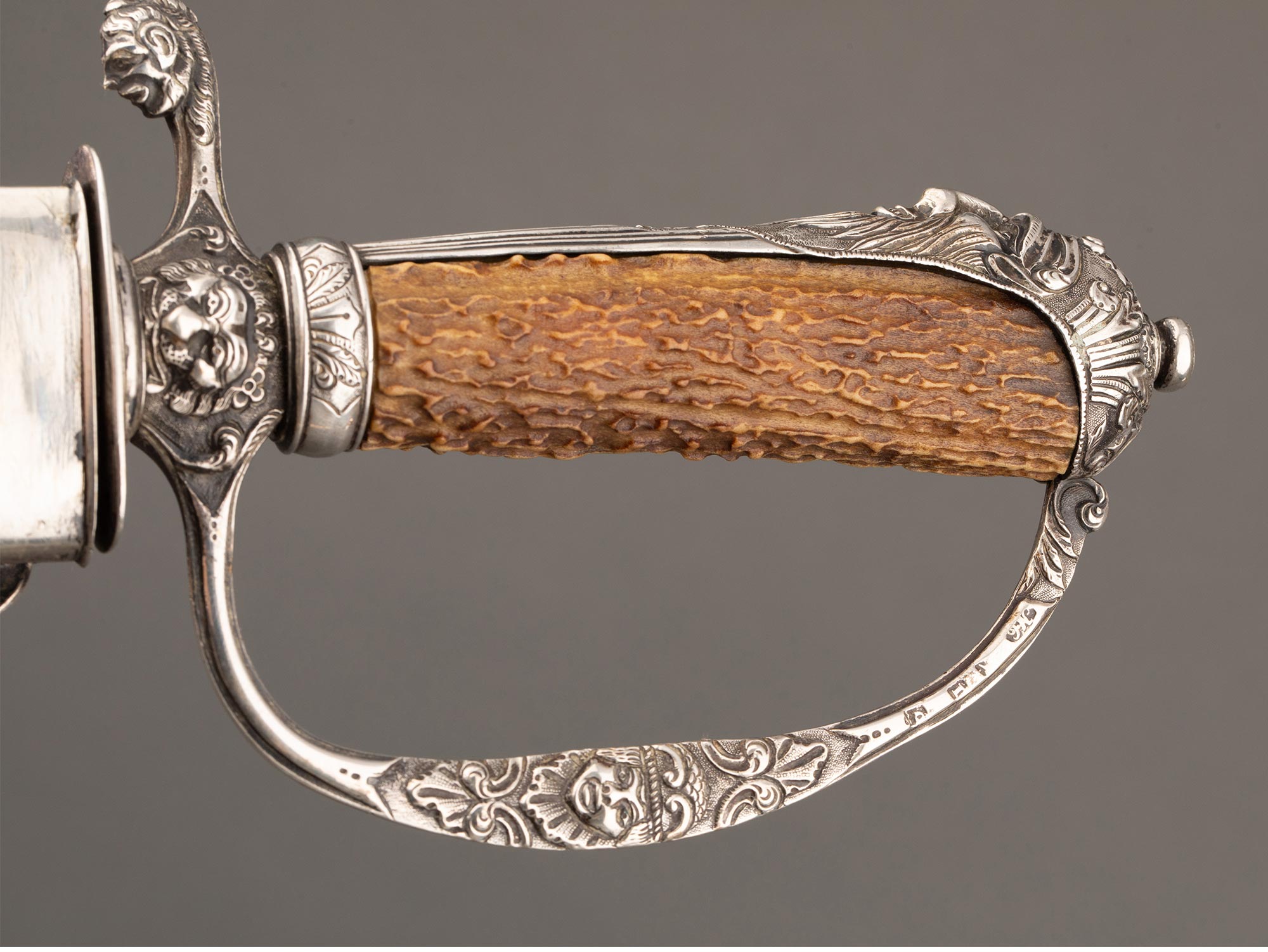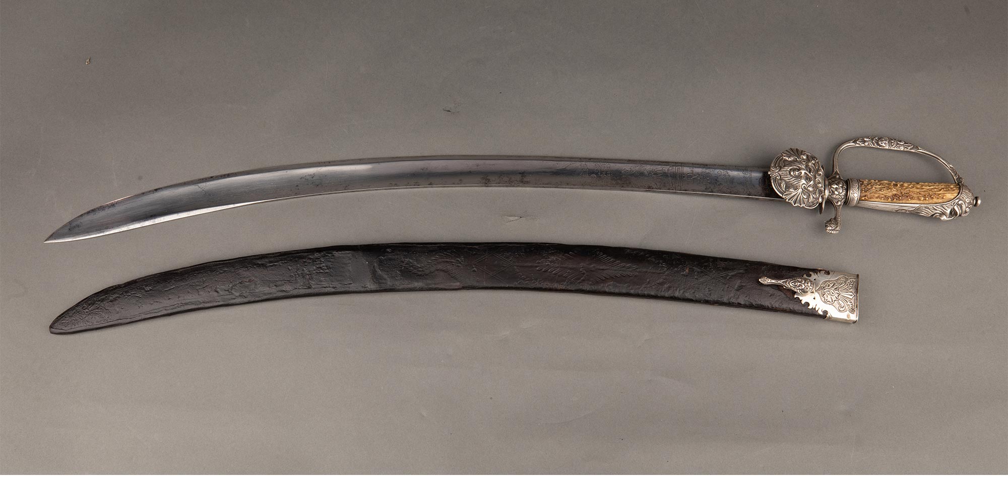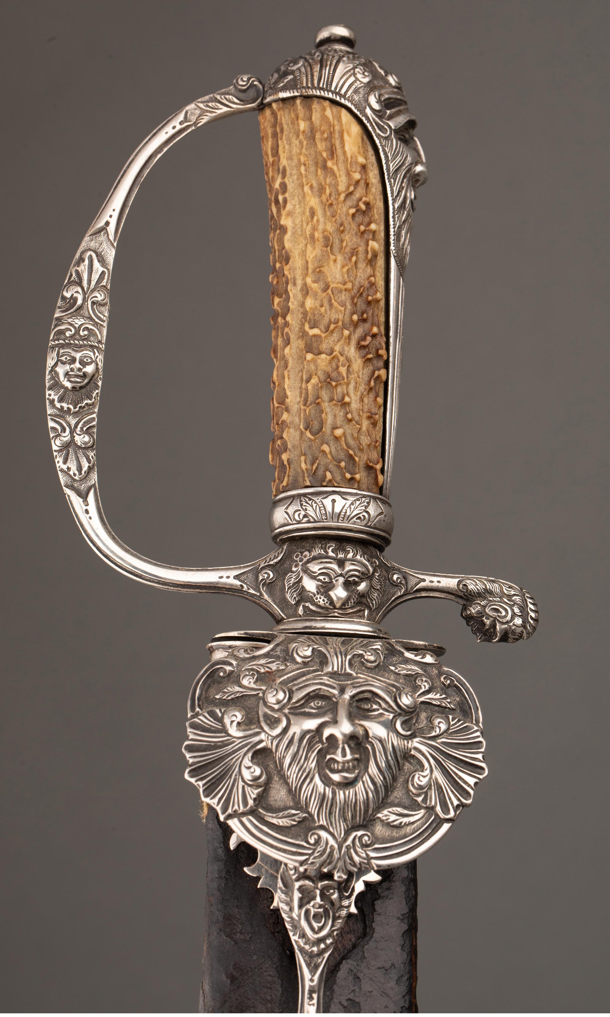 1750年代英国出品皮革刀鞘古典怪面主题纯银精雕刀柄装饰人物及铭文蚀刻钢制刀刃狩猎弯刀