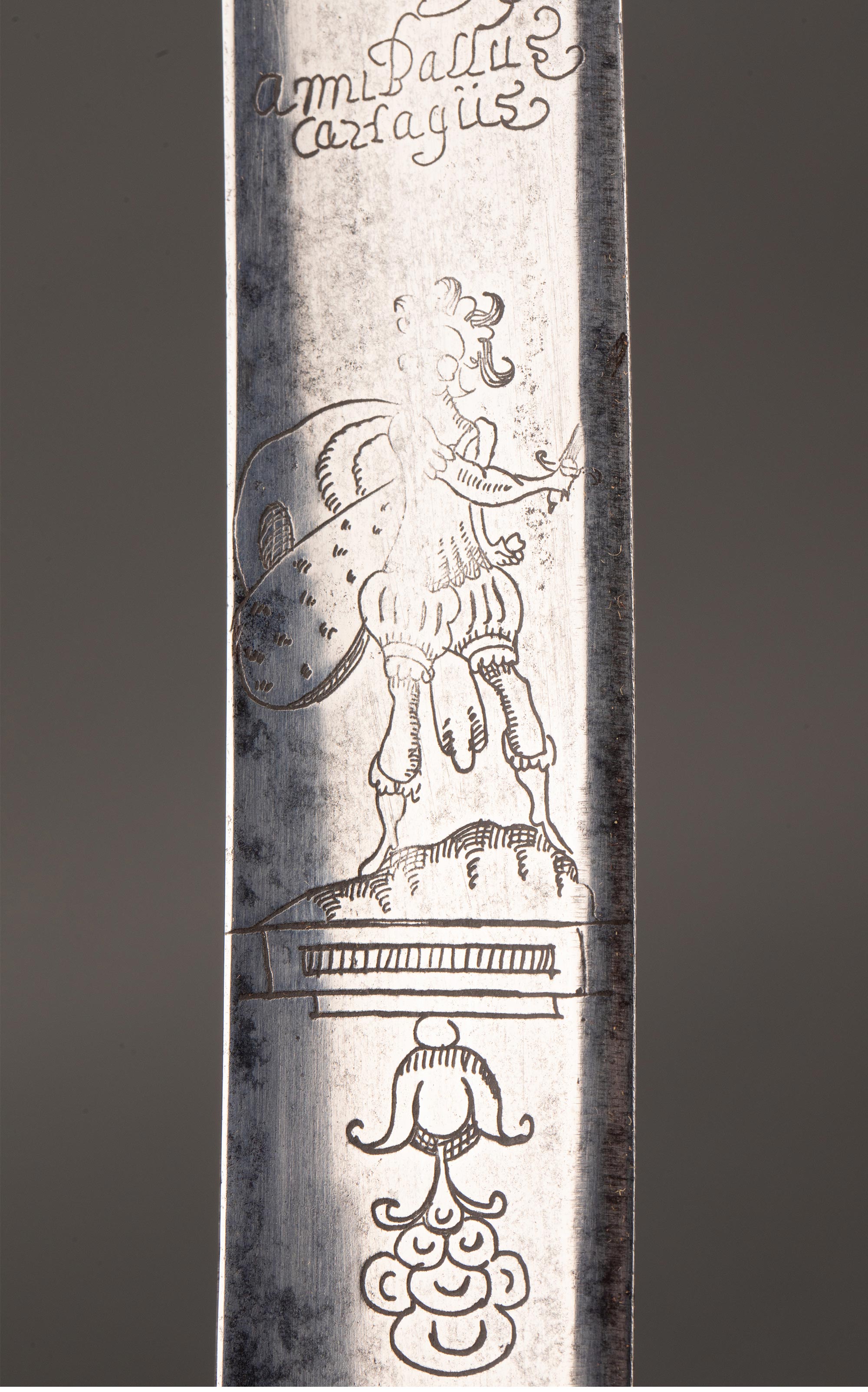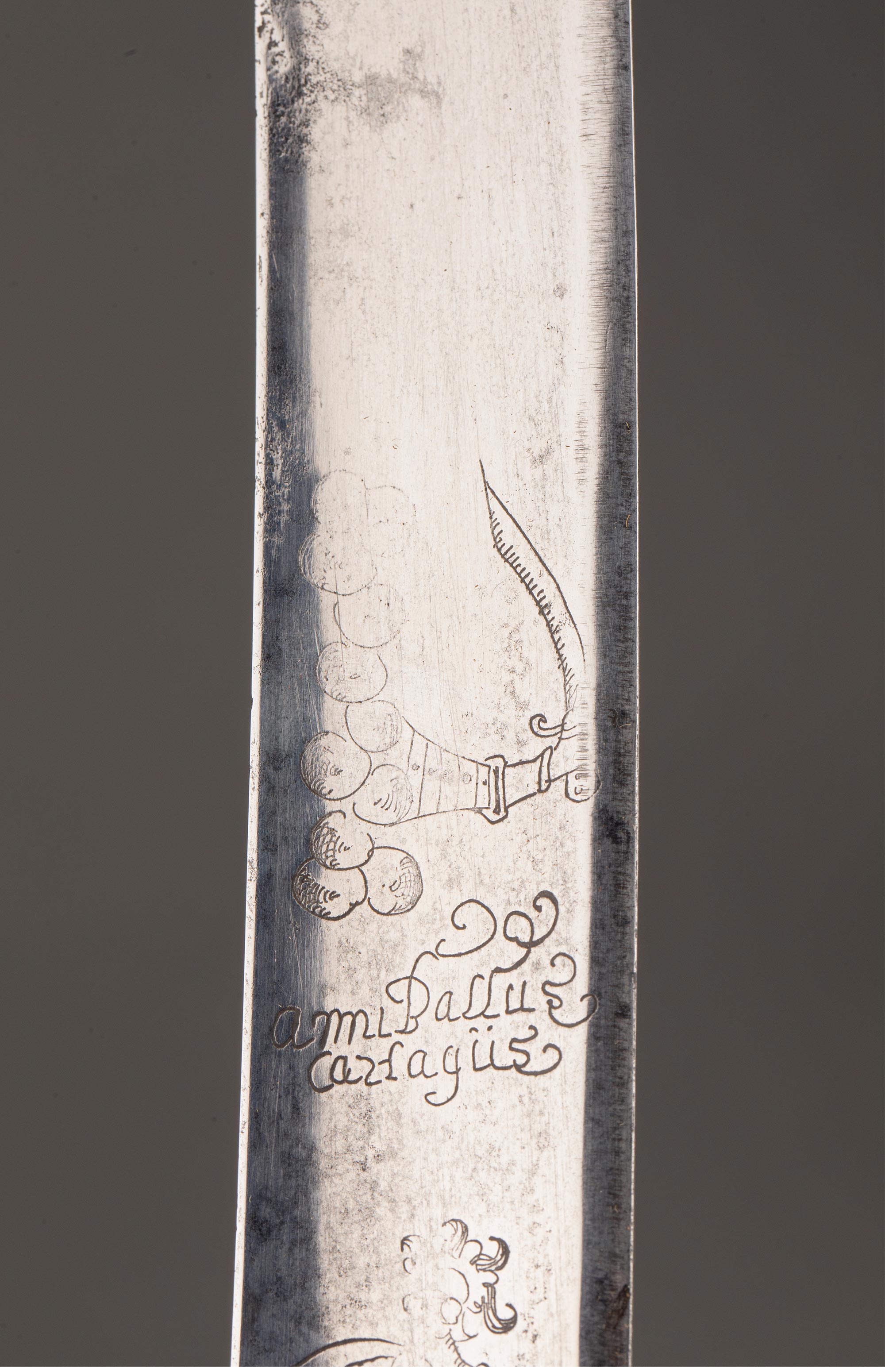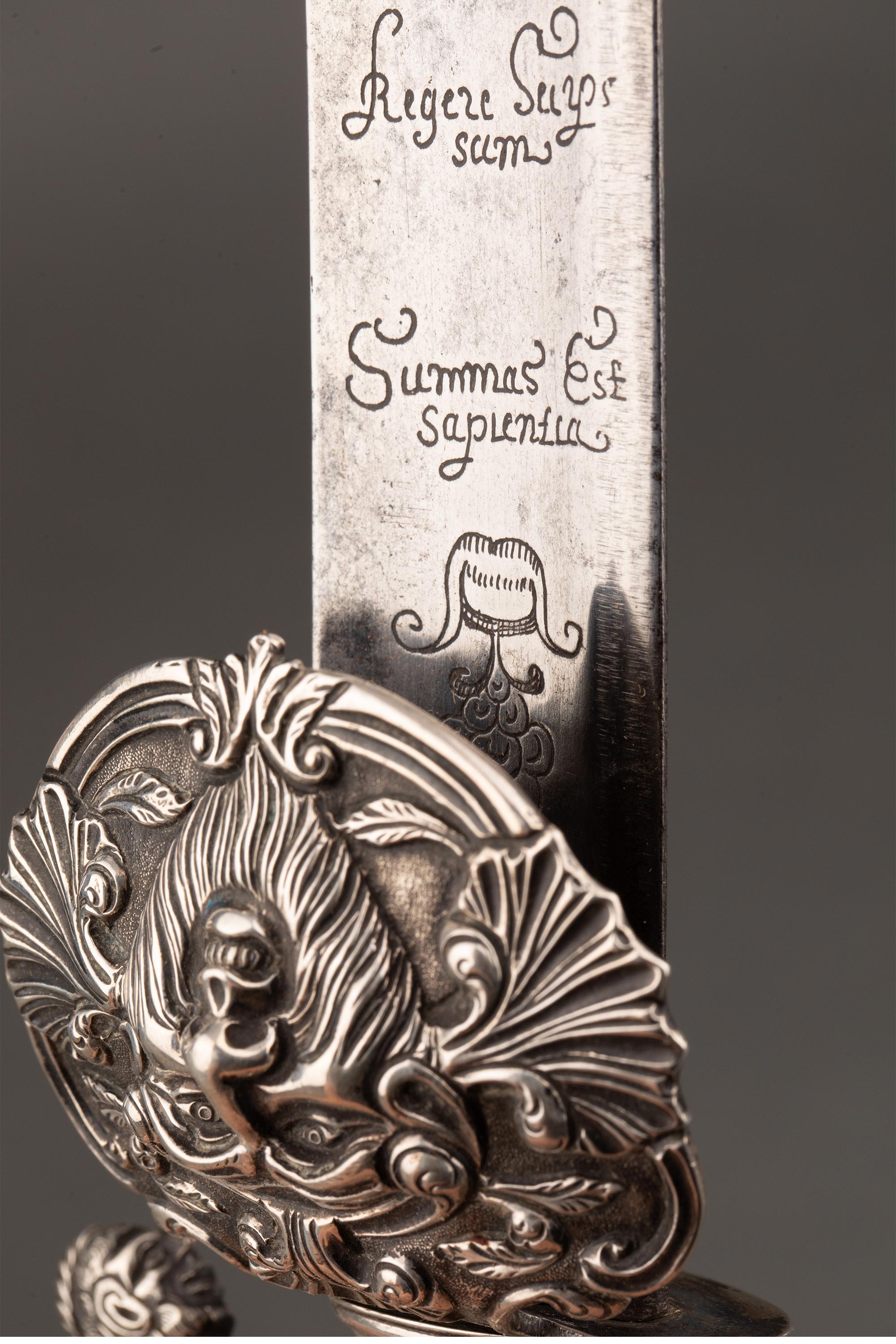 1750年代英国出品皮革刀鞘古典怪面主题纯银精雕刀柄装饰人物及铭文蚀刻钢制刀刃狩猎弯刀