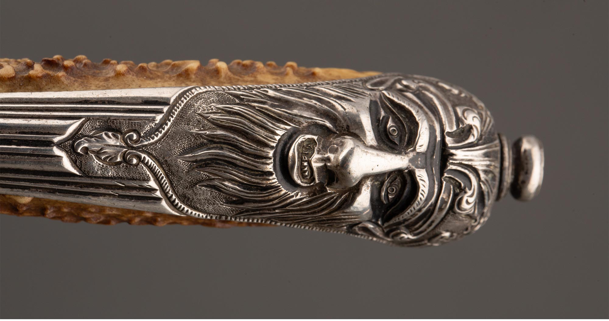 独角鹿西洋古董英国出品皮革刀鞘古典怪面主题纯银精雕刀柄装饰人物及铭文蚀刻钢制刀刃狩猎弯刀[未开刃]