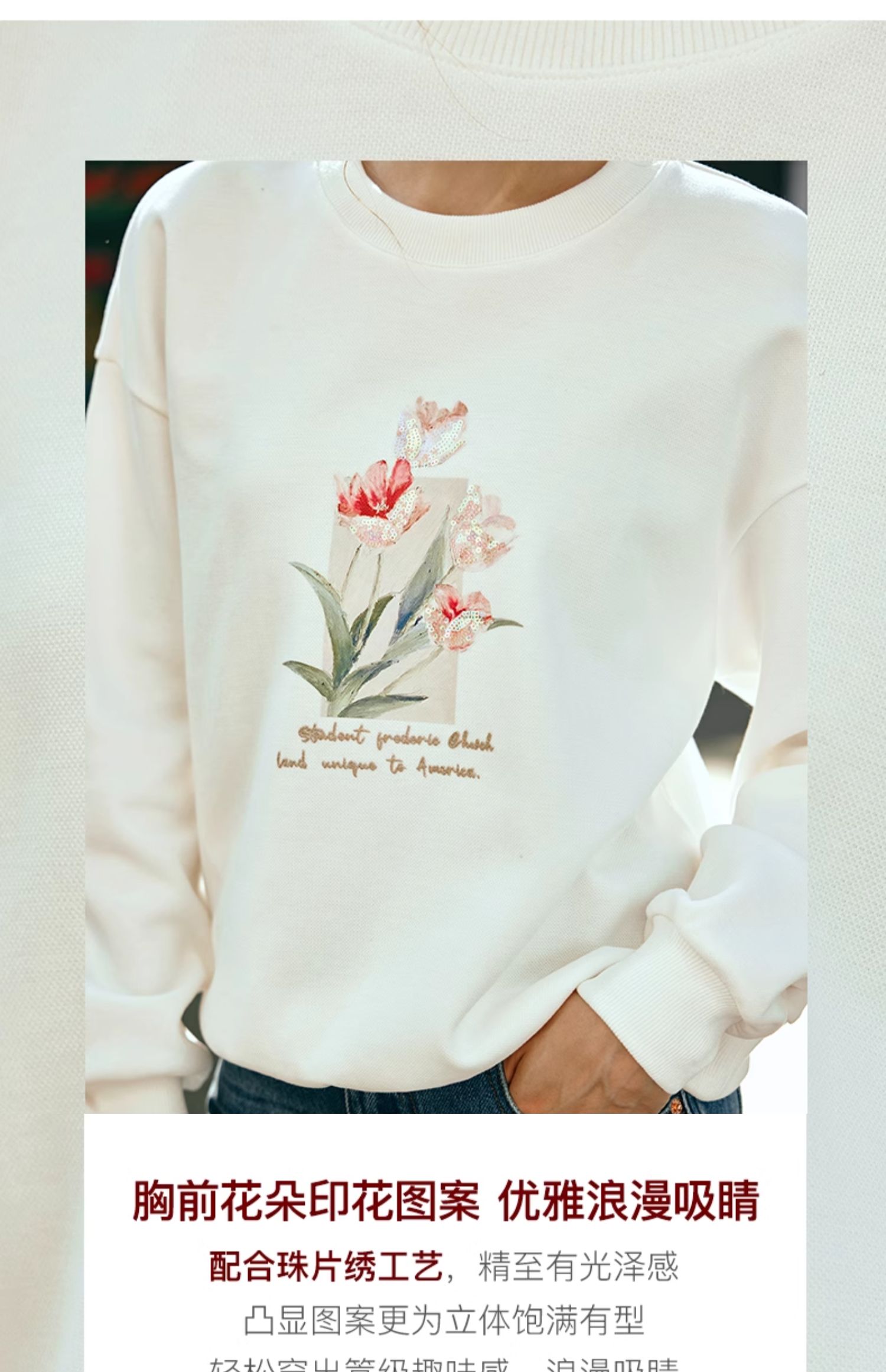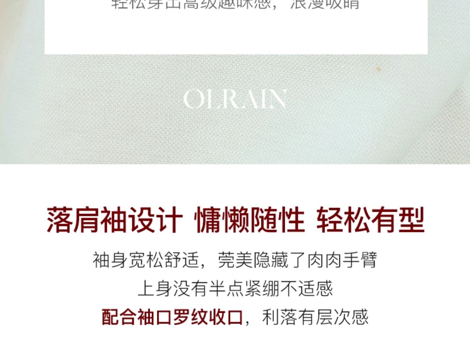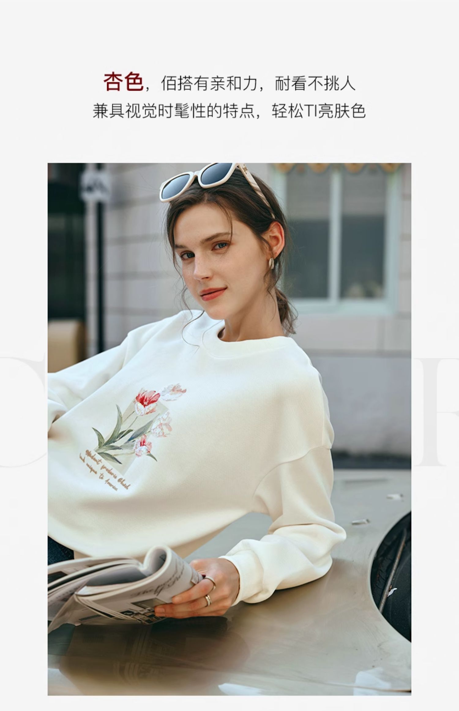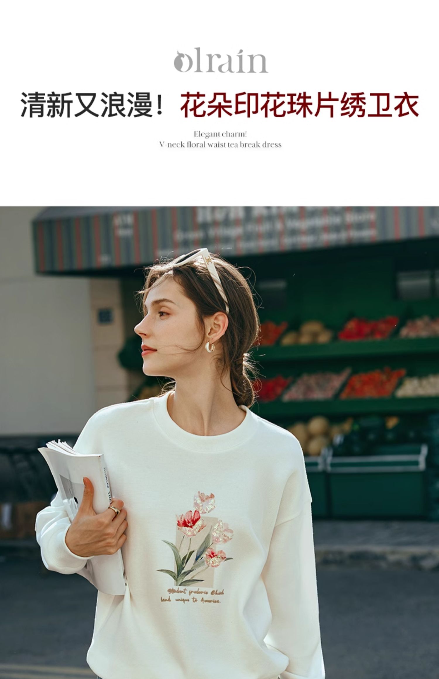 OLrain欧芮儿杏色圆领卫衣女早春2024年新款时尚百搭宽松绣花上衣