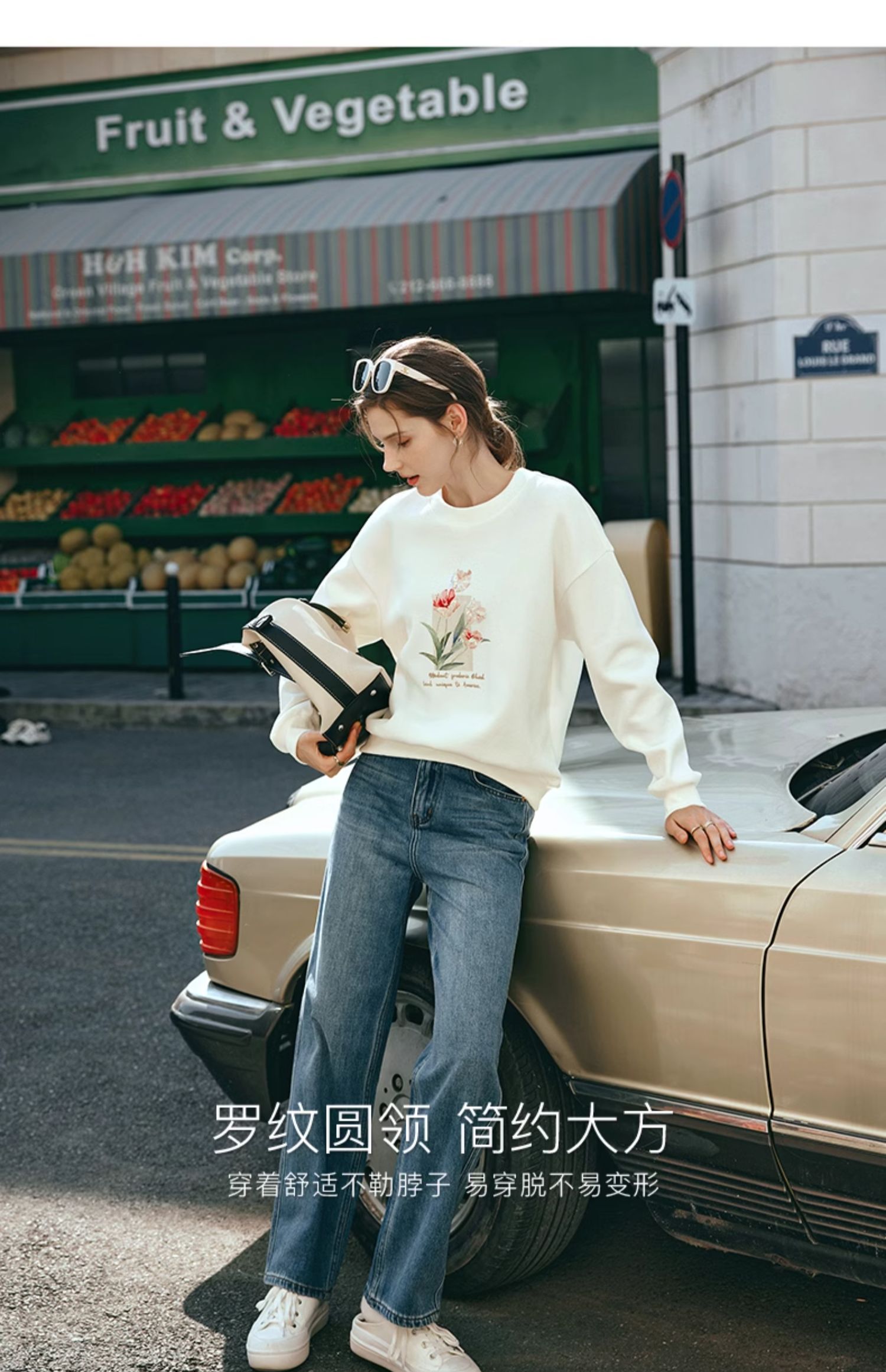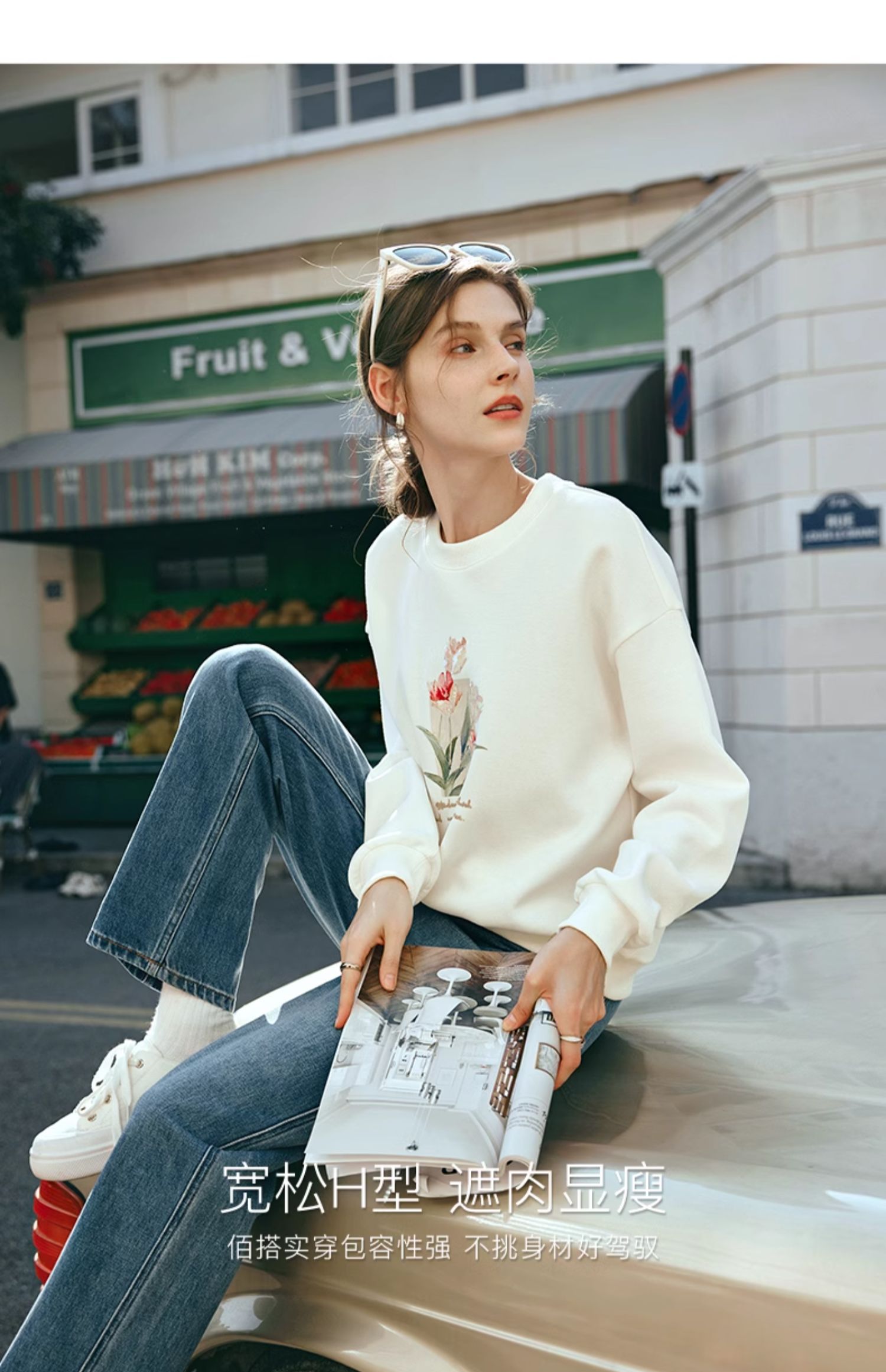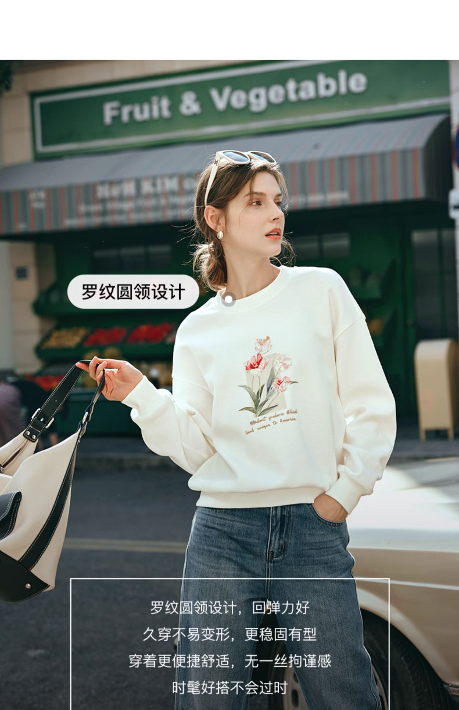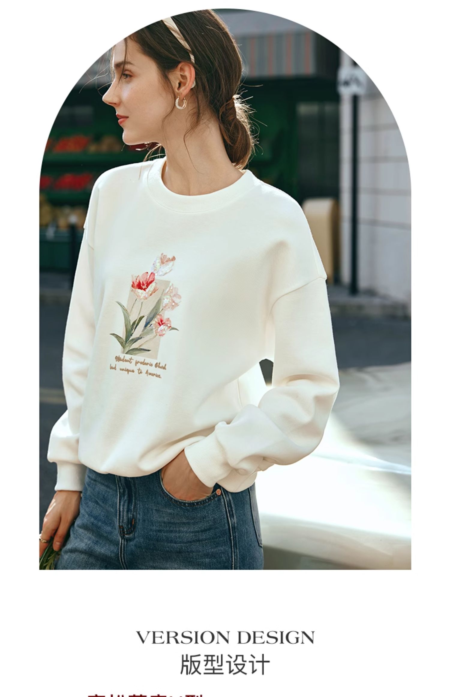 OLrain欧芮儿杏色圆领卫衣女早春2024年新款时尚百搭宽松绣花上衣