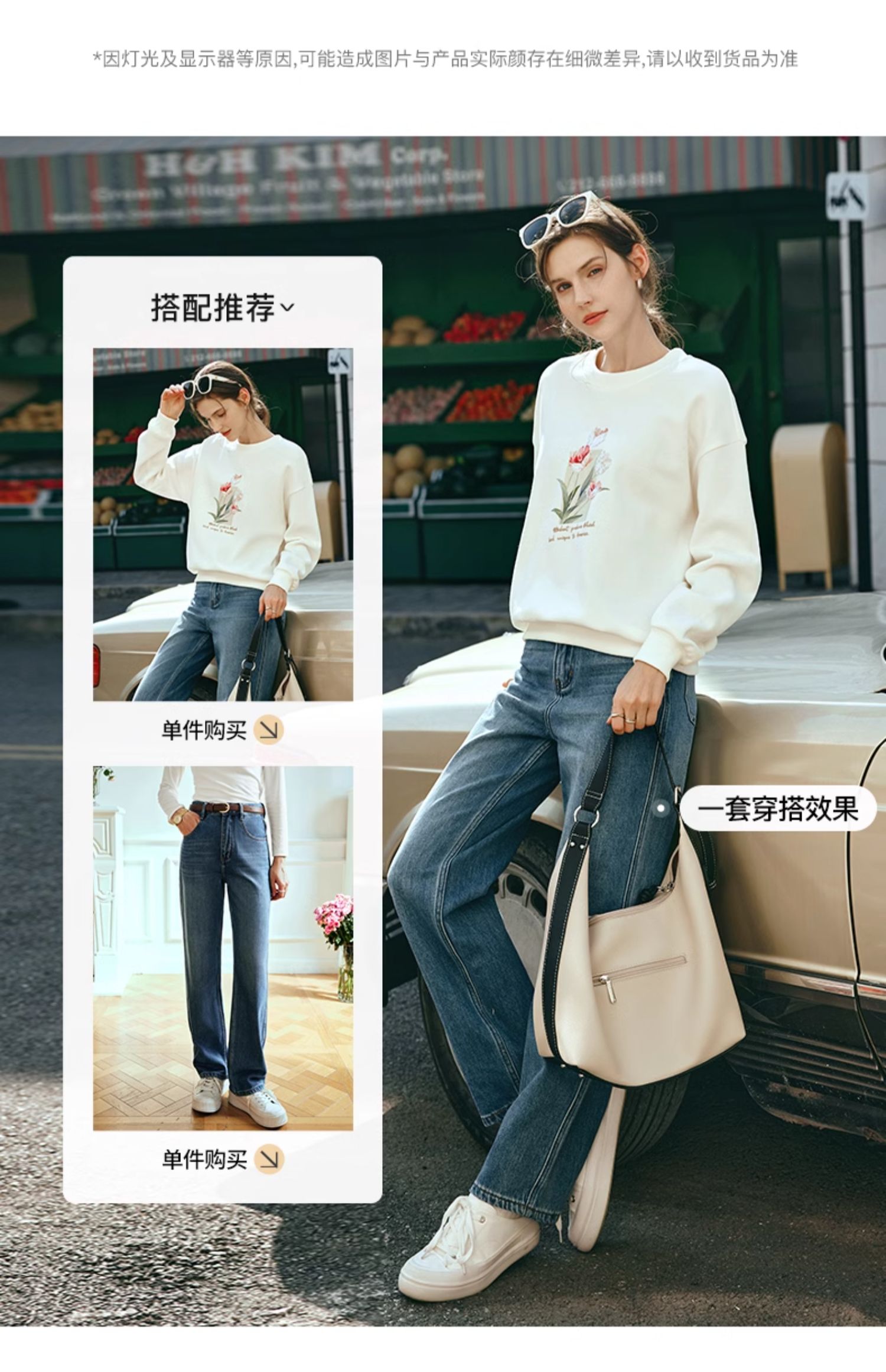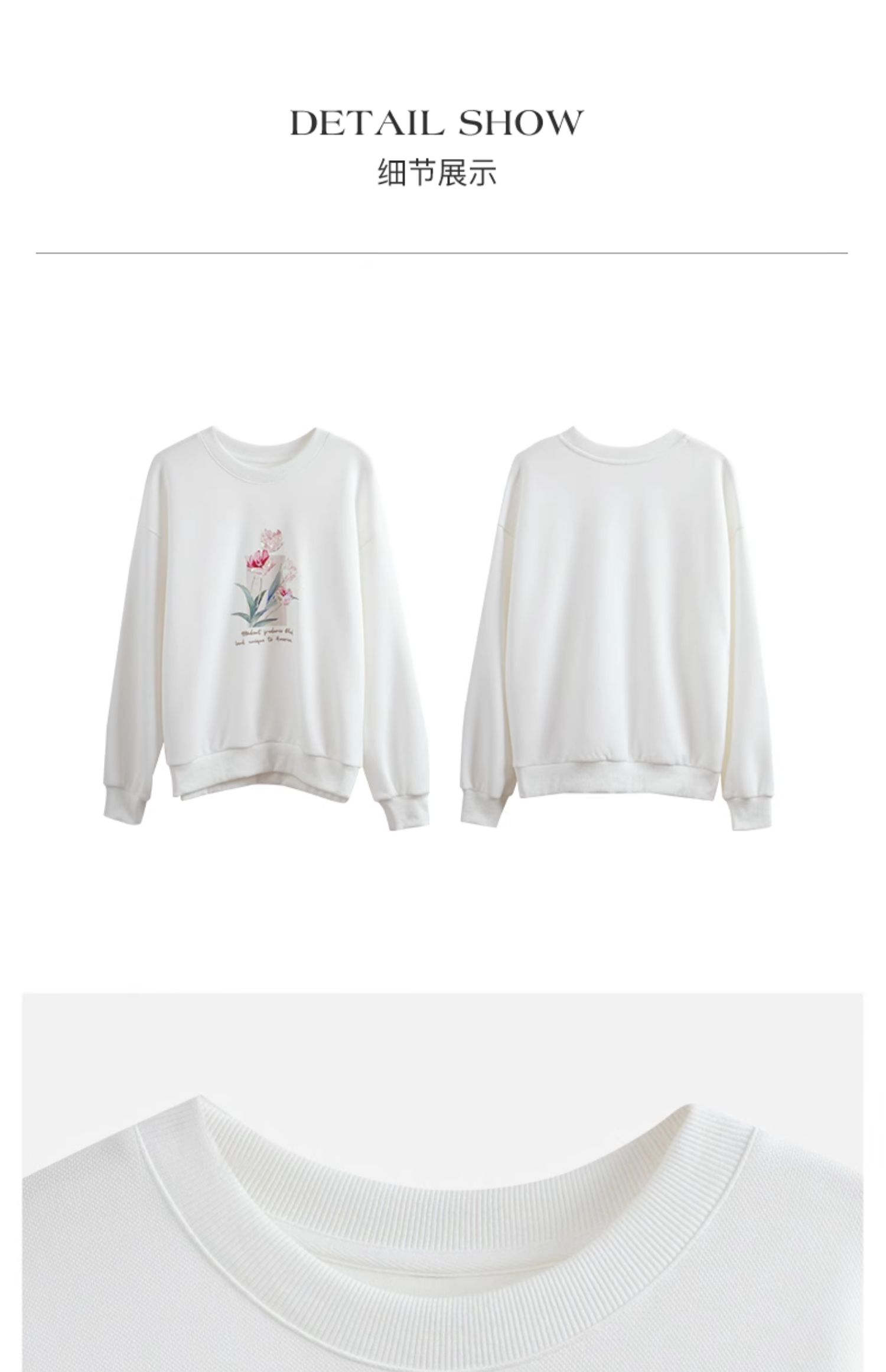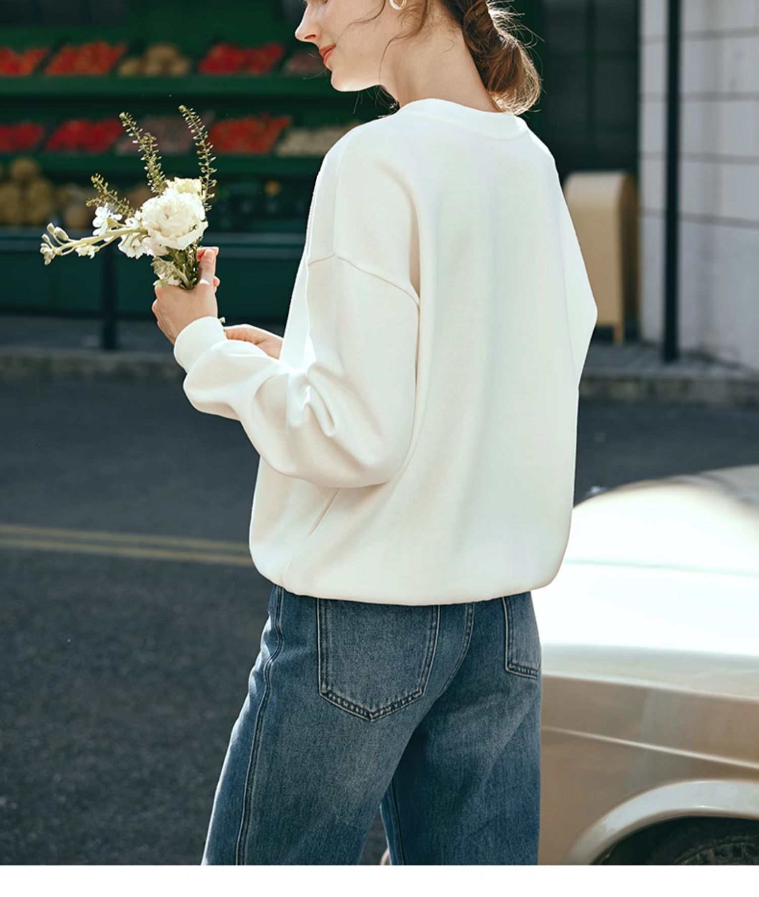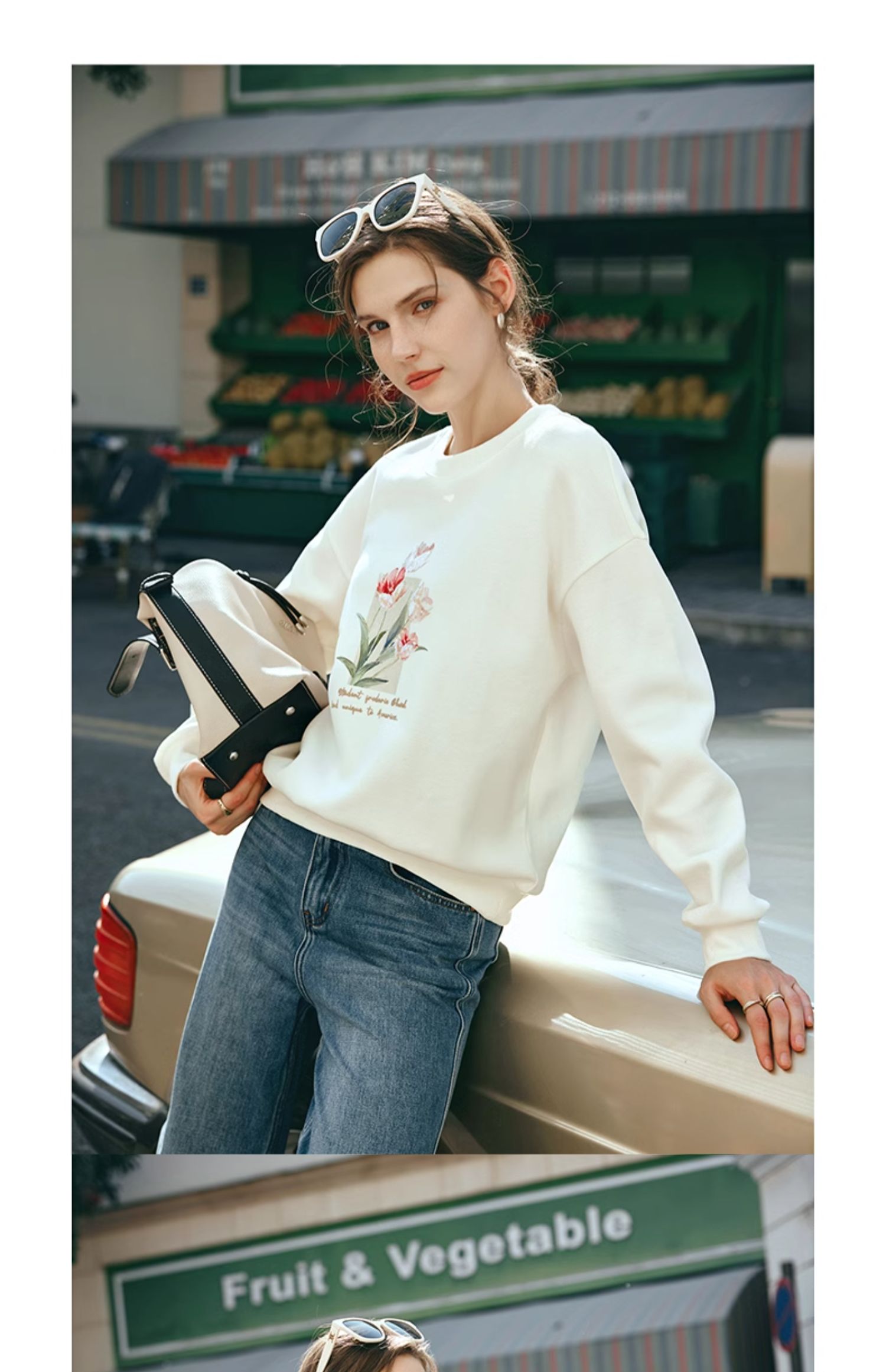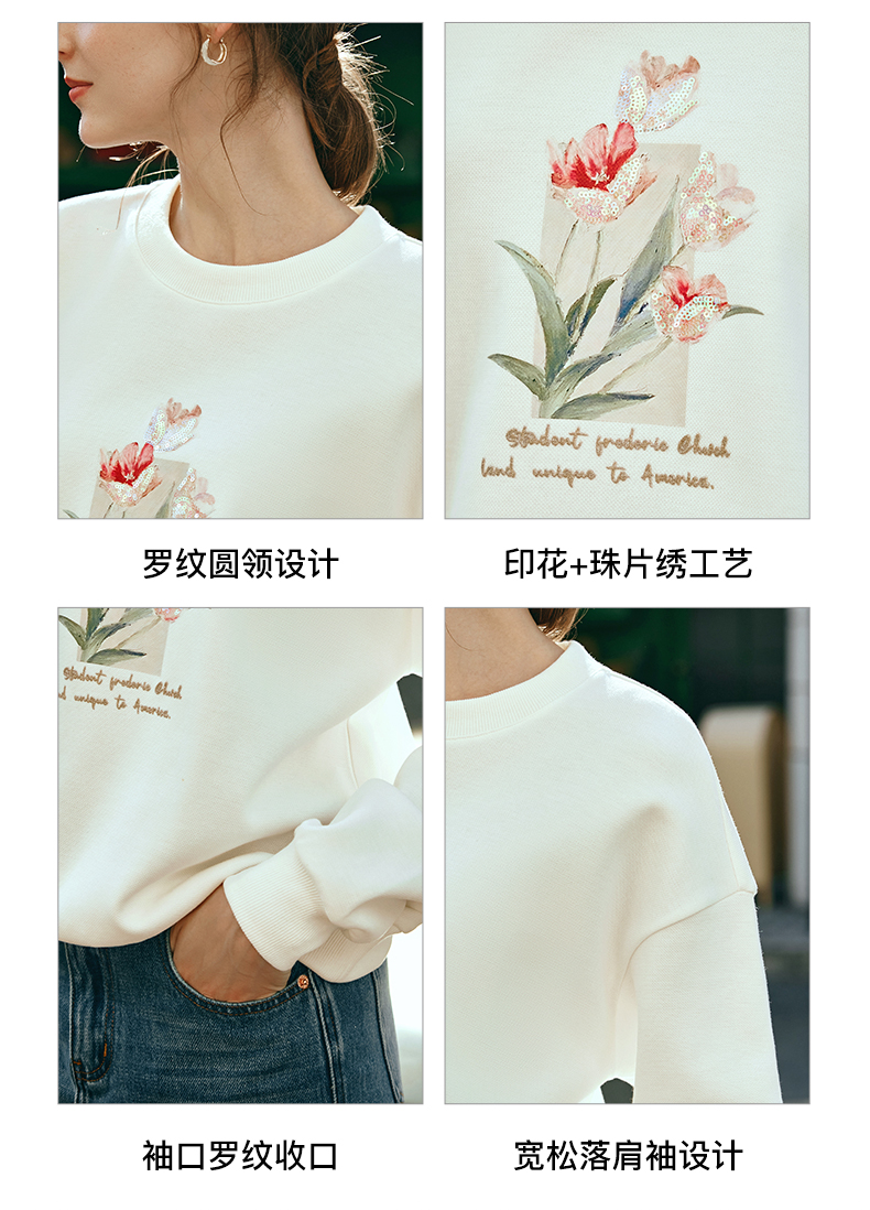 OLrain欧芮儿杏色圆领卫衣女早春2024年新款时尚百搭宽松绣花上衣