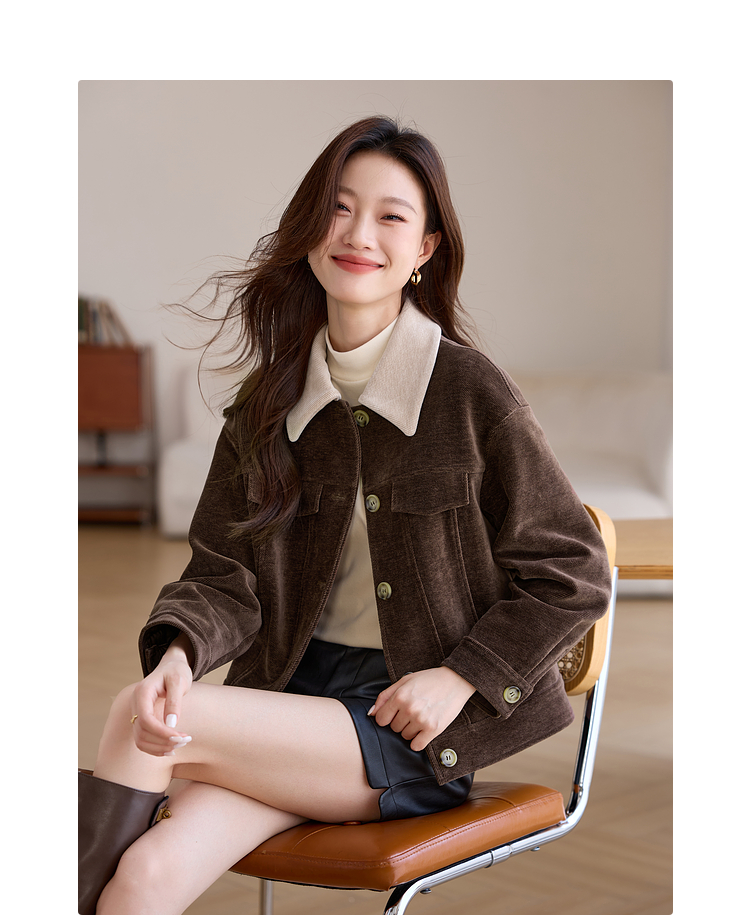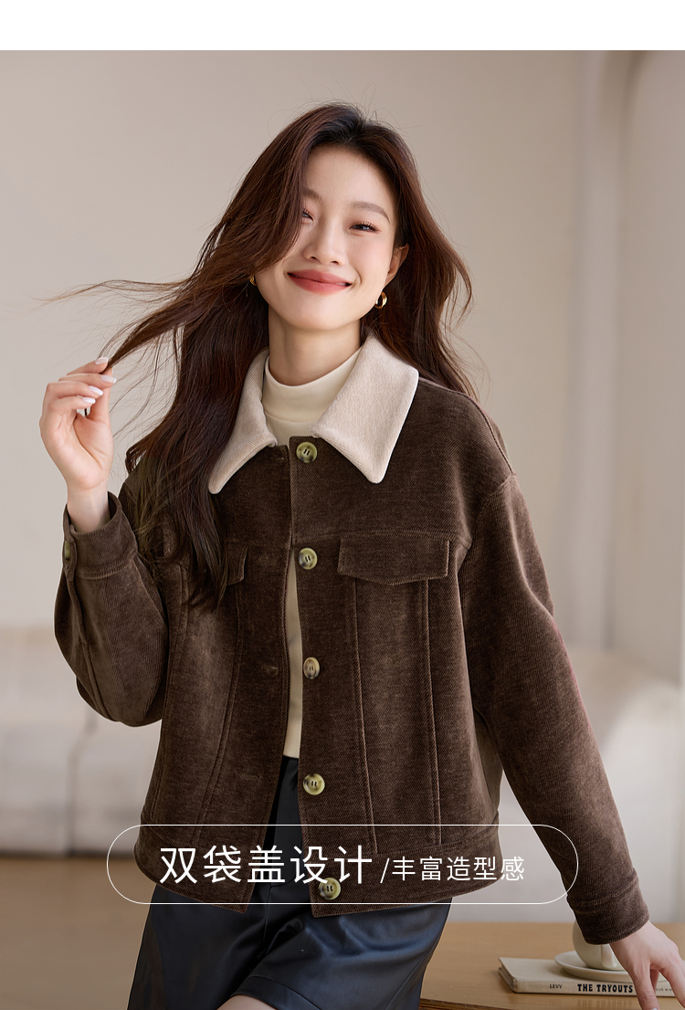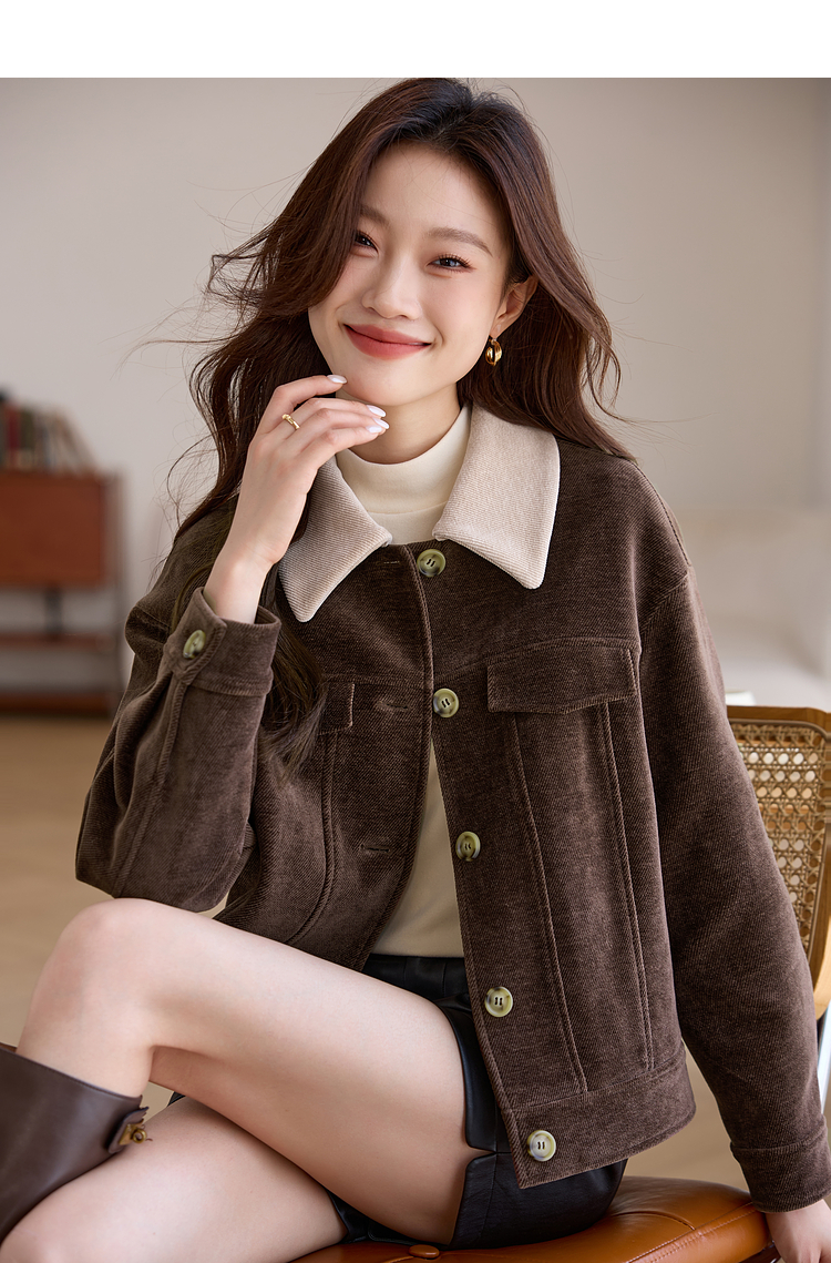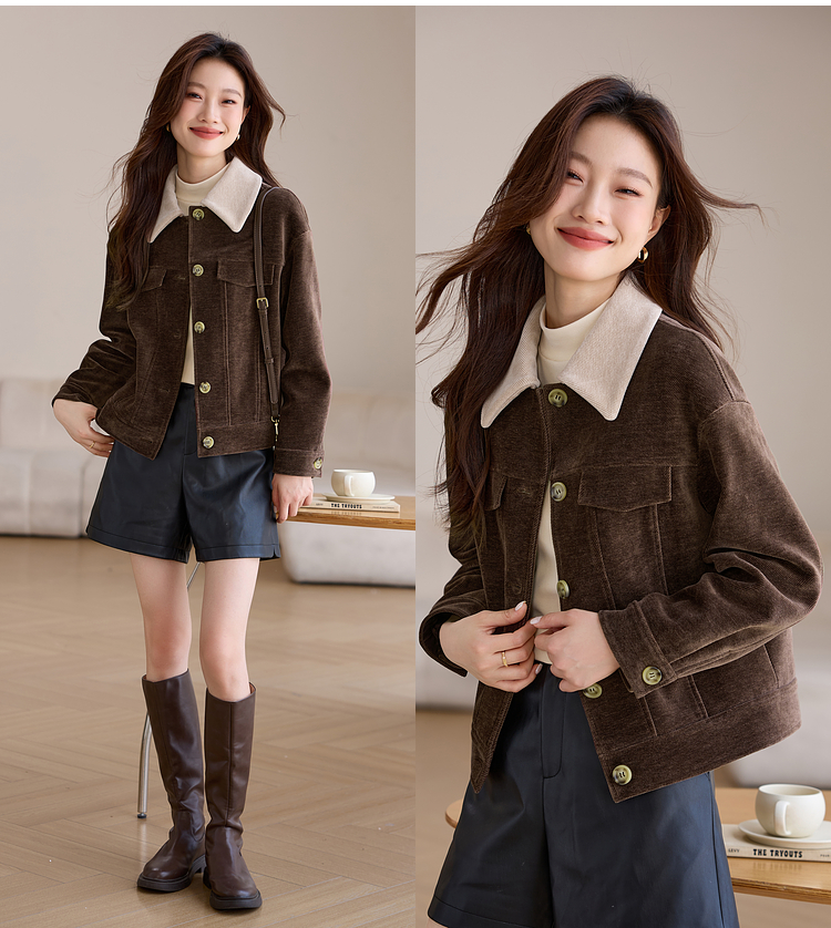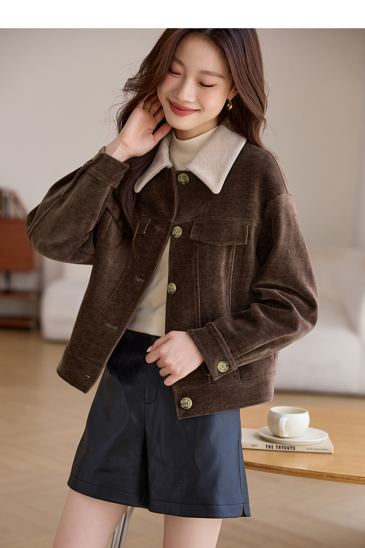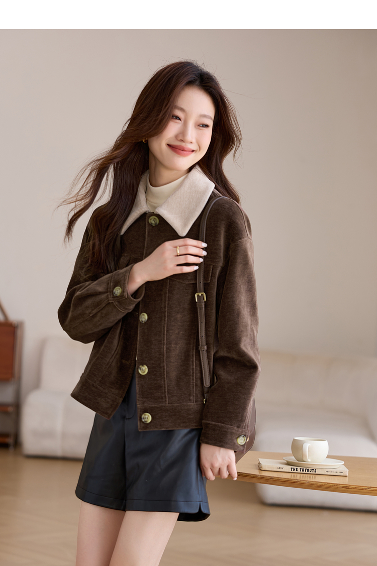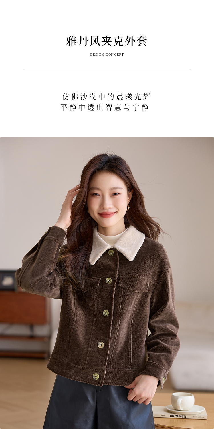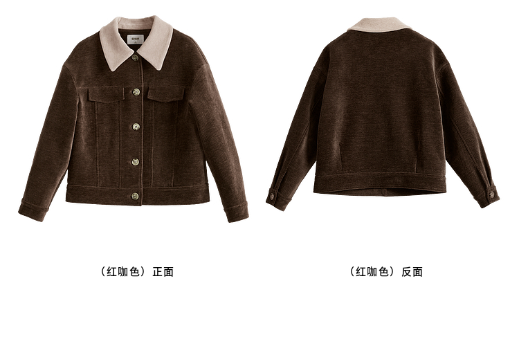 【年货节】熙世界美拉德咖色工装风毛呢外套女秋冬复古休闲短款呢子夹克上衣