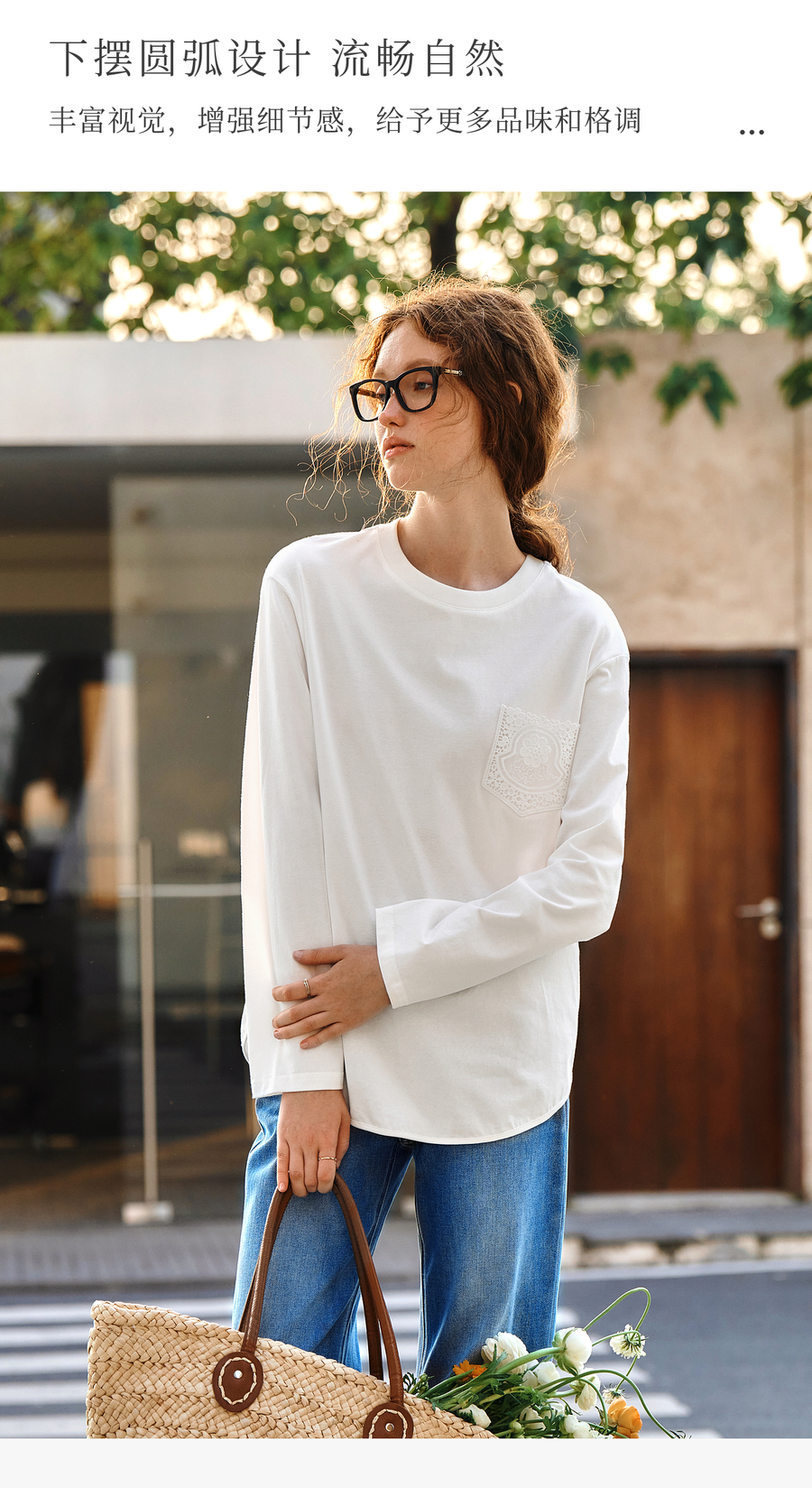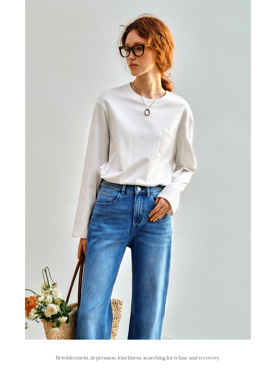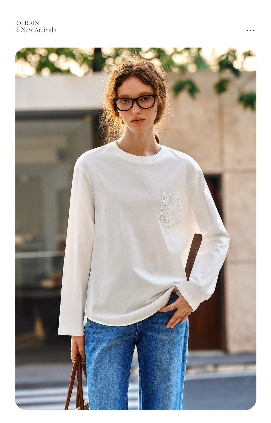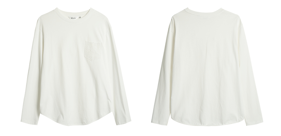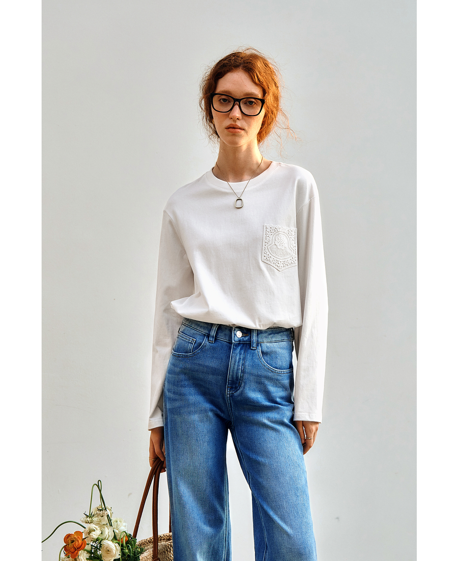 OLrain欧芮儿米白色长袖T恤女秋季2025新款简约宽松拼接绣花上衣