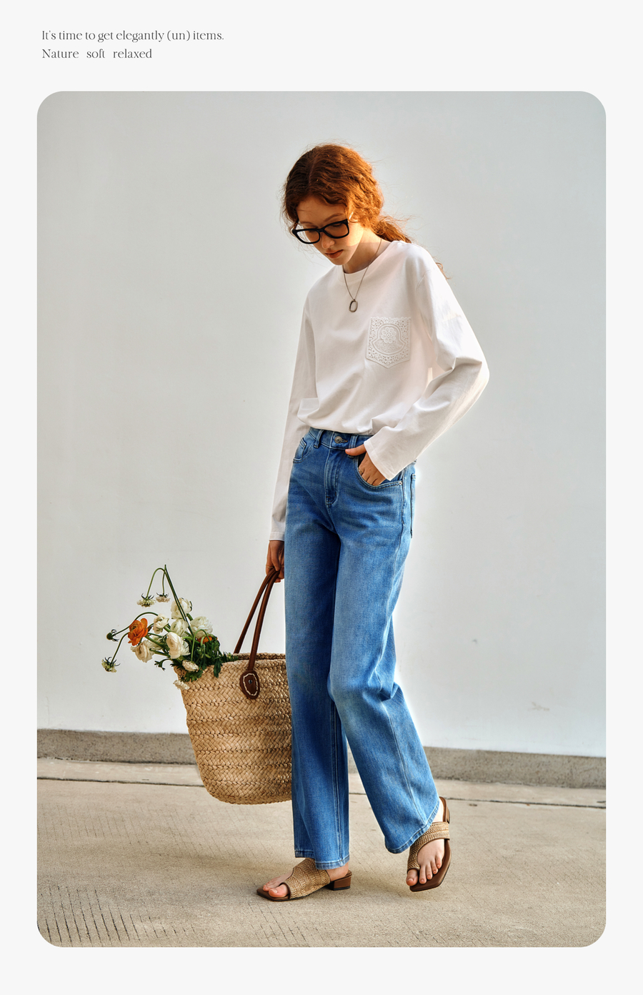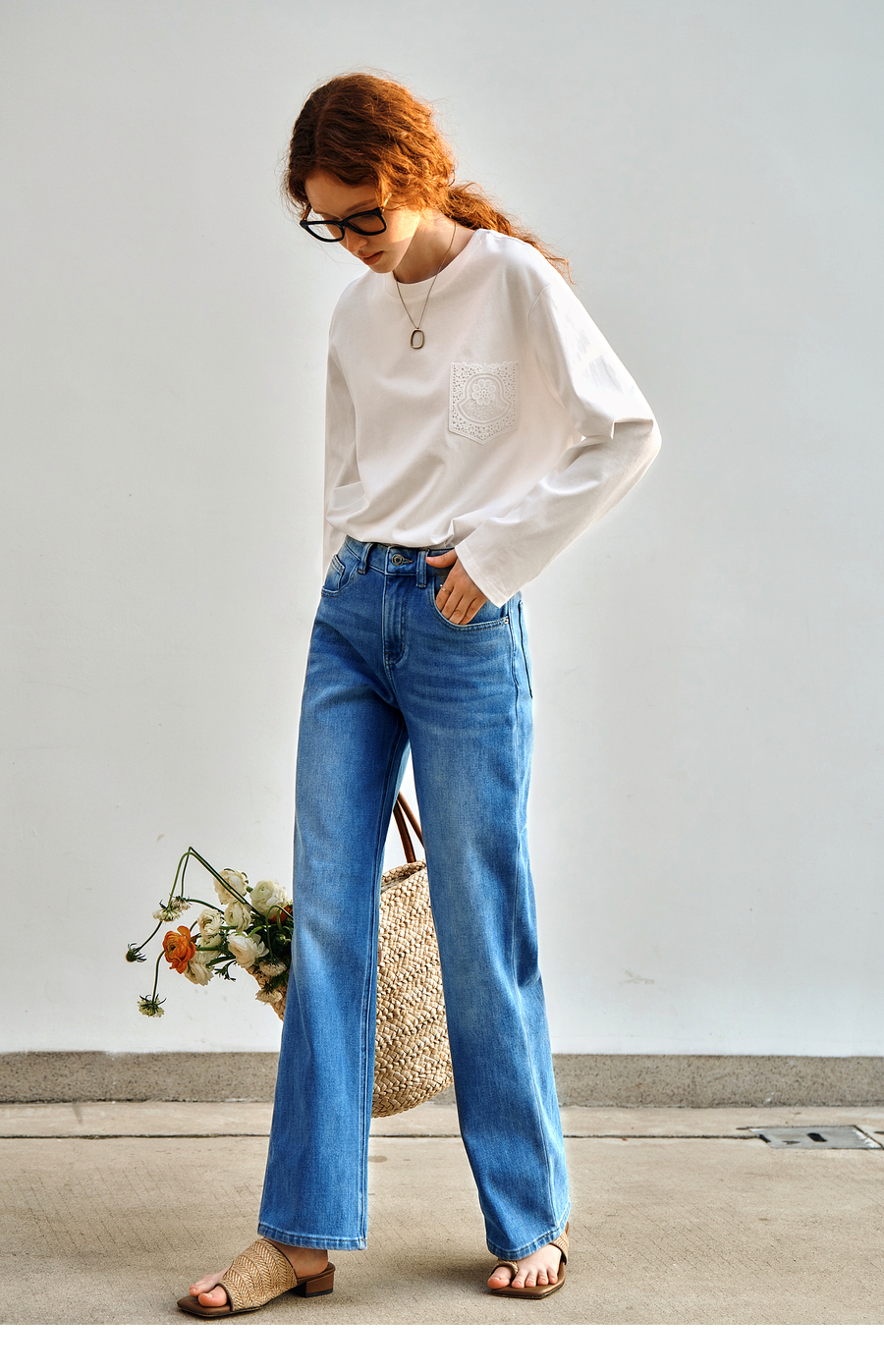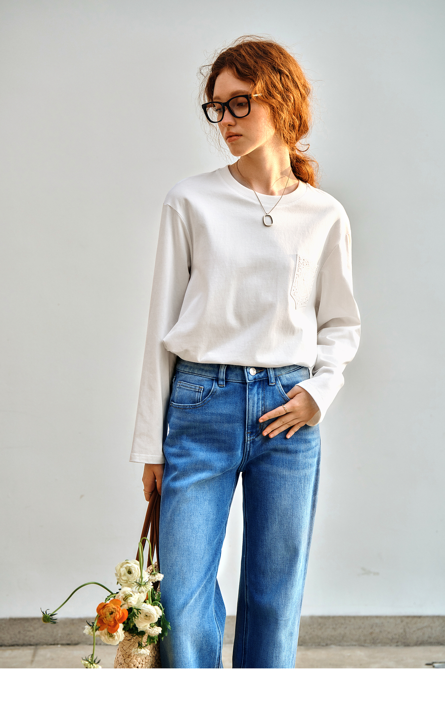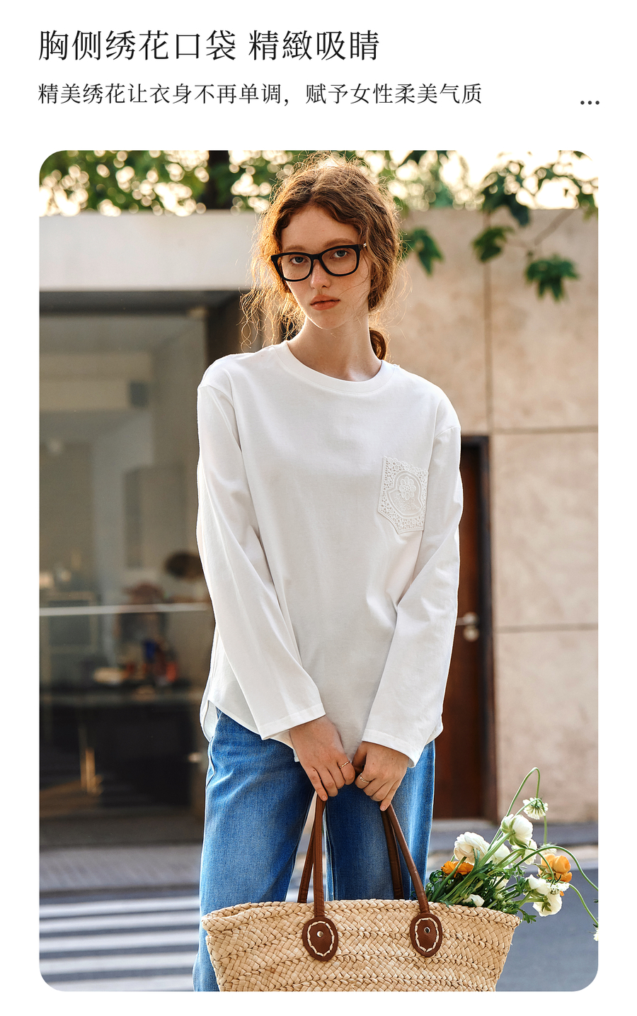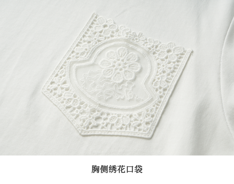 OLrain欧芮儿米白色长袖T恤女秋季2025新款简约宽松拼接绣花上衣