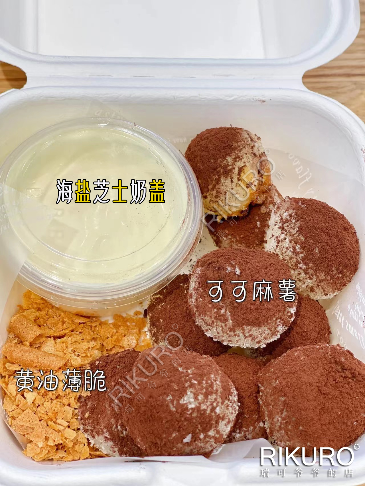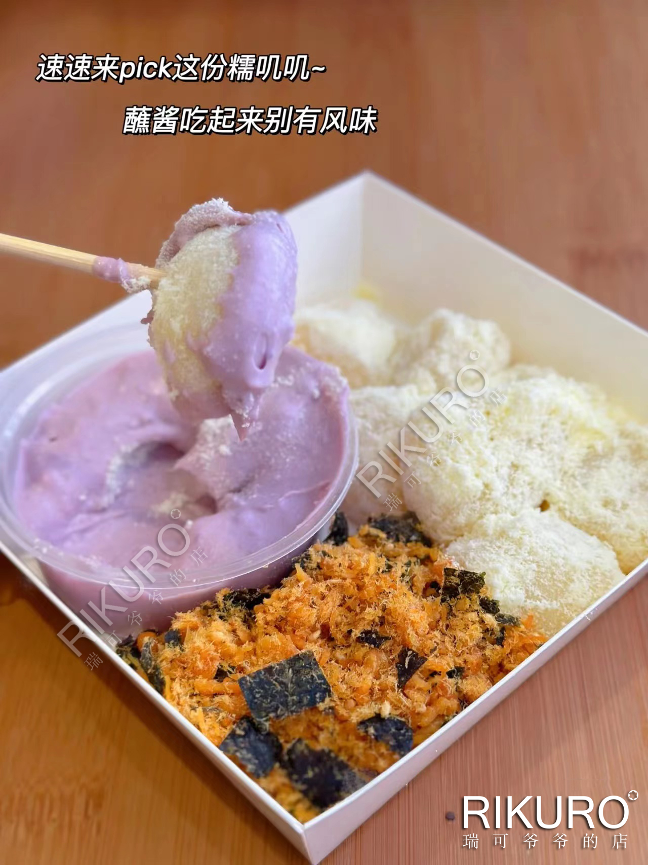 手工麻糍(10枚)+海盐奶盖蘸酱+各种香酥脆松,糯叽叽的麻糍先蘸奶盖再滚一圈咸甜脆松,吃起来超有仪式感,进到嘴里不要太幸福~~~