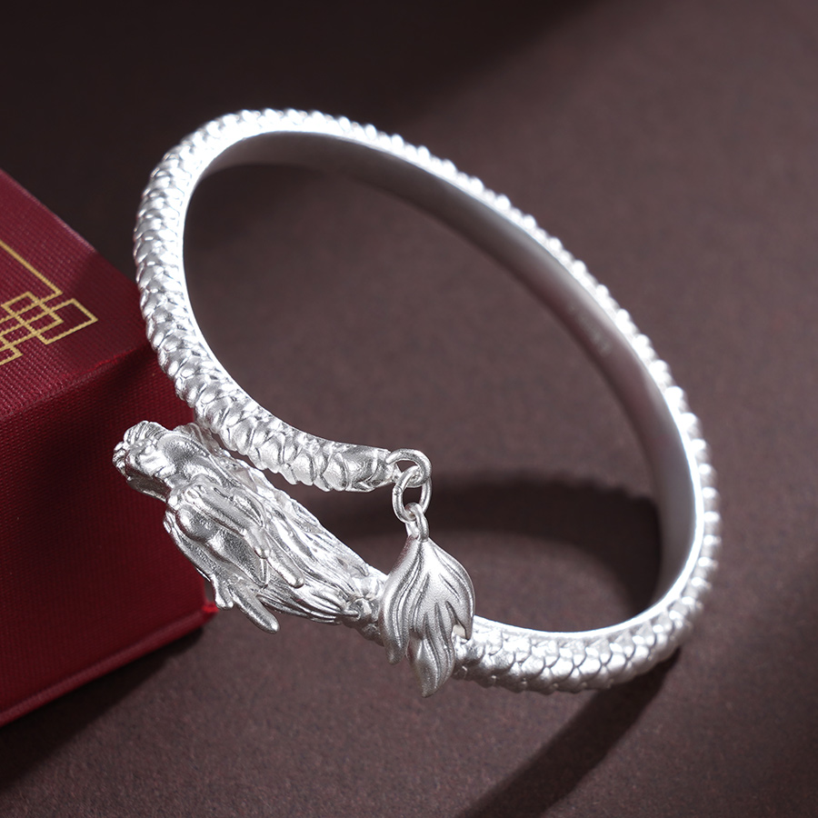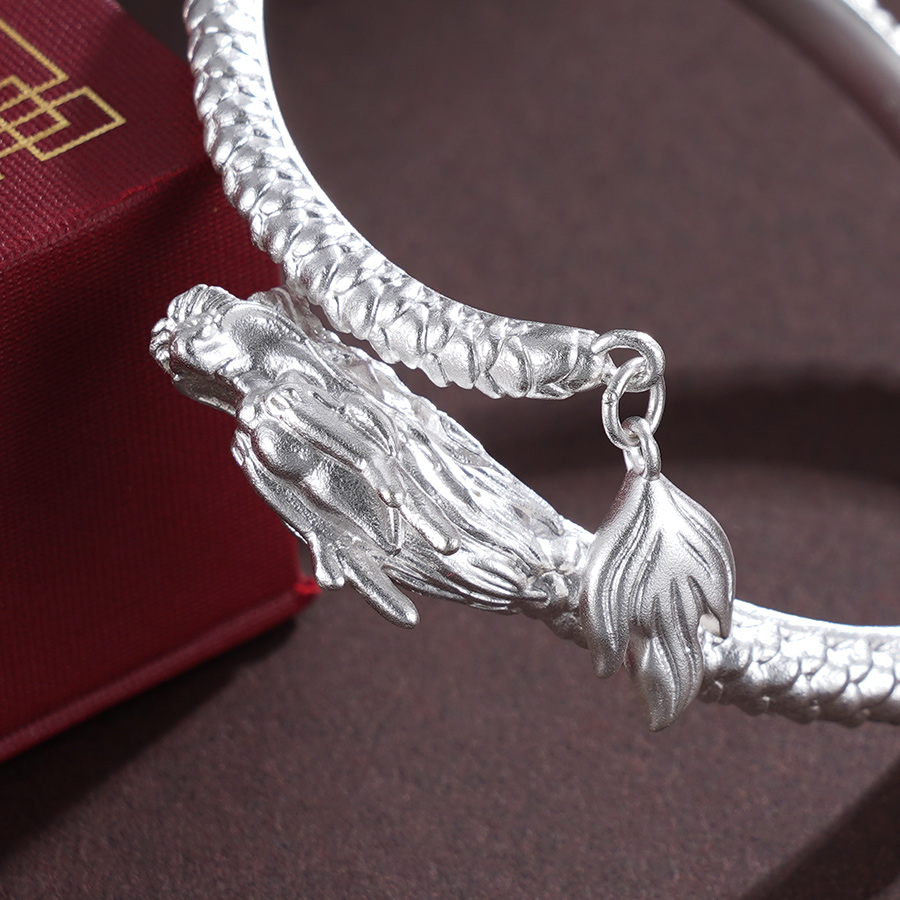 【寓意】:3D立体龙形手镯,龙首尾相连,蜿蜒灵动,浮雕龙鳞栩栩如生。足银材质,散发自然光泽。气质霸气兼具,分量感十足,寓意吉祥与守护。